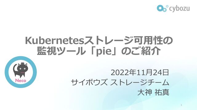 Kubernetesストレージ可用性の 監視ツール「pie」のご紹介 2022年11月24日 サイボウズ ストレージチーム 大神 祐真 1