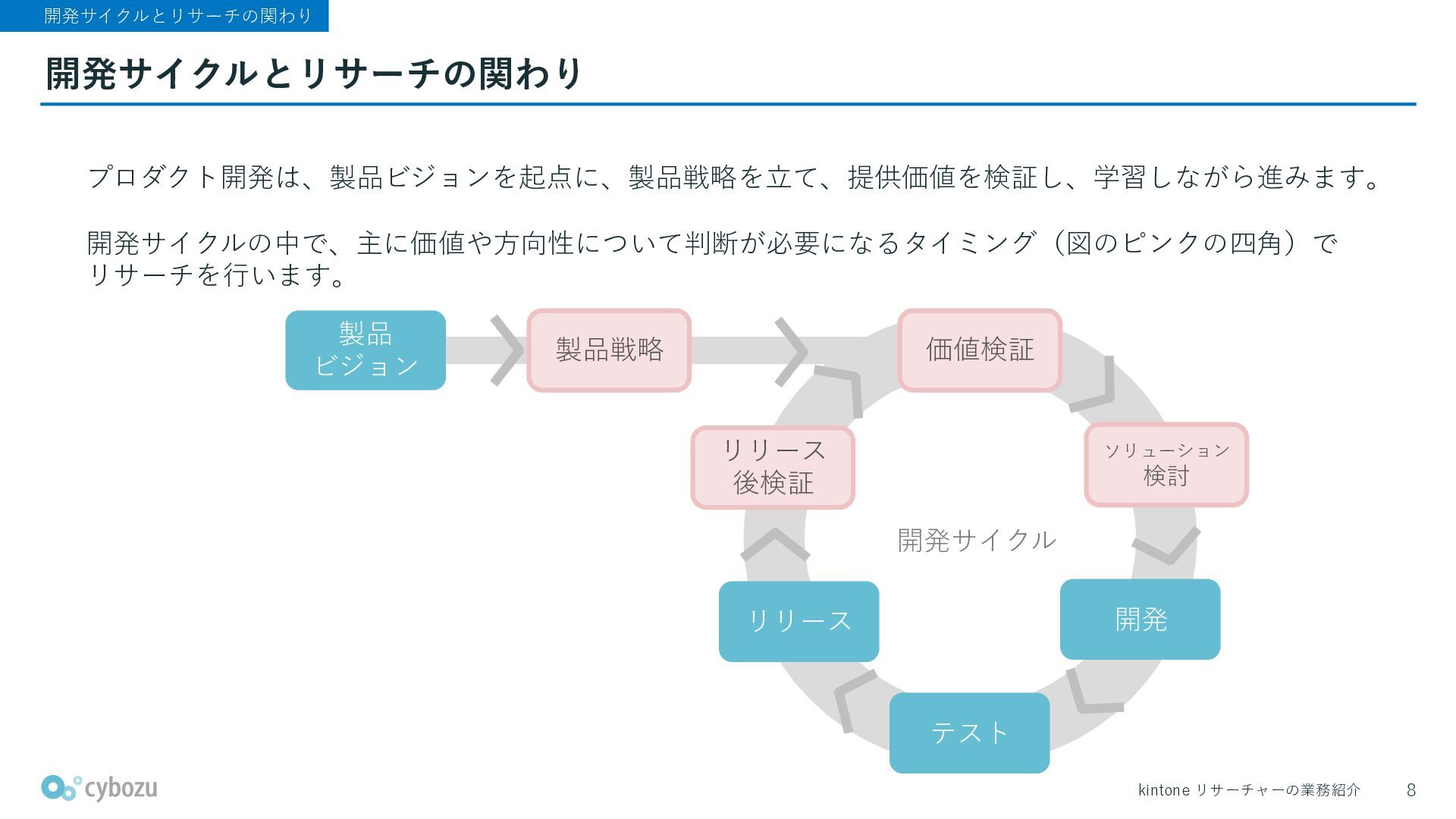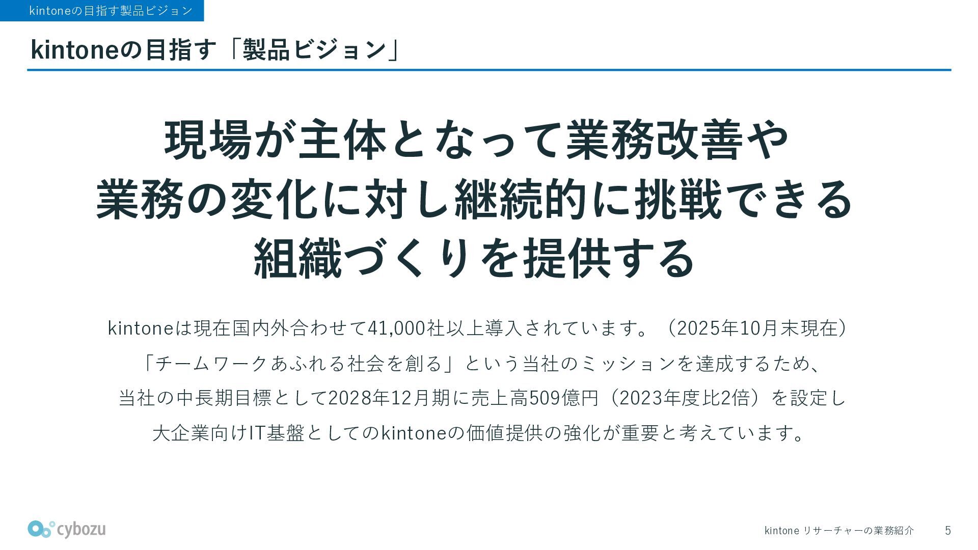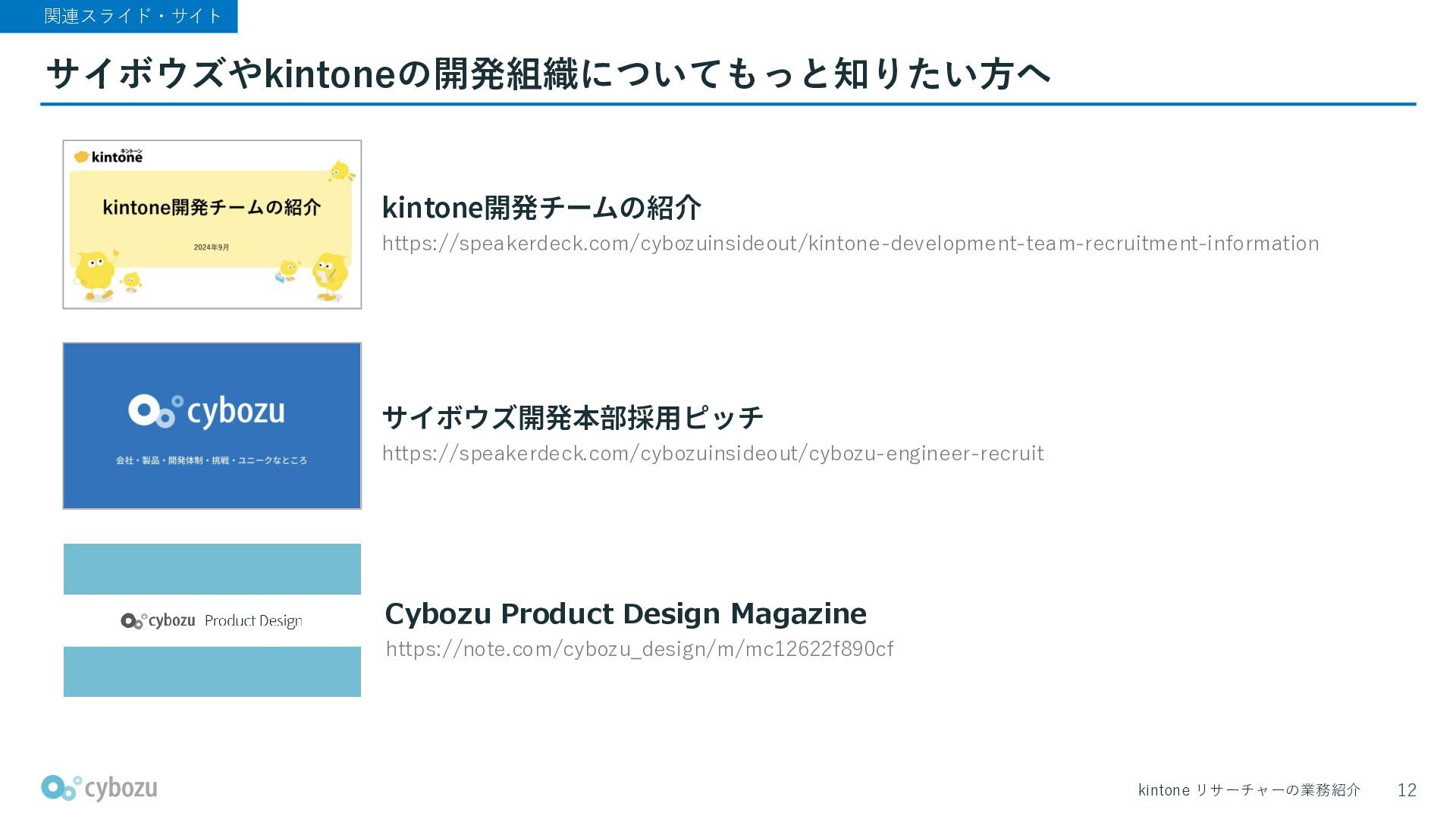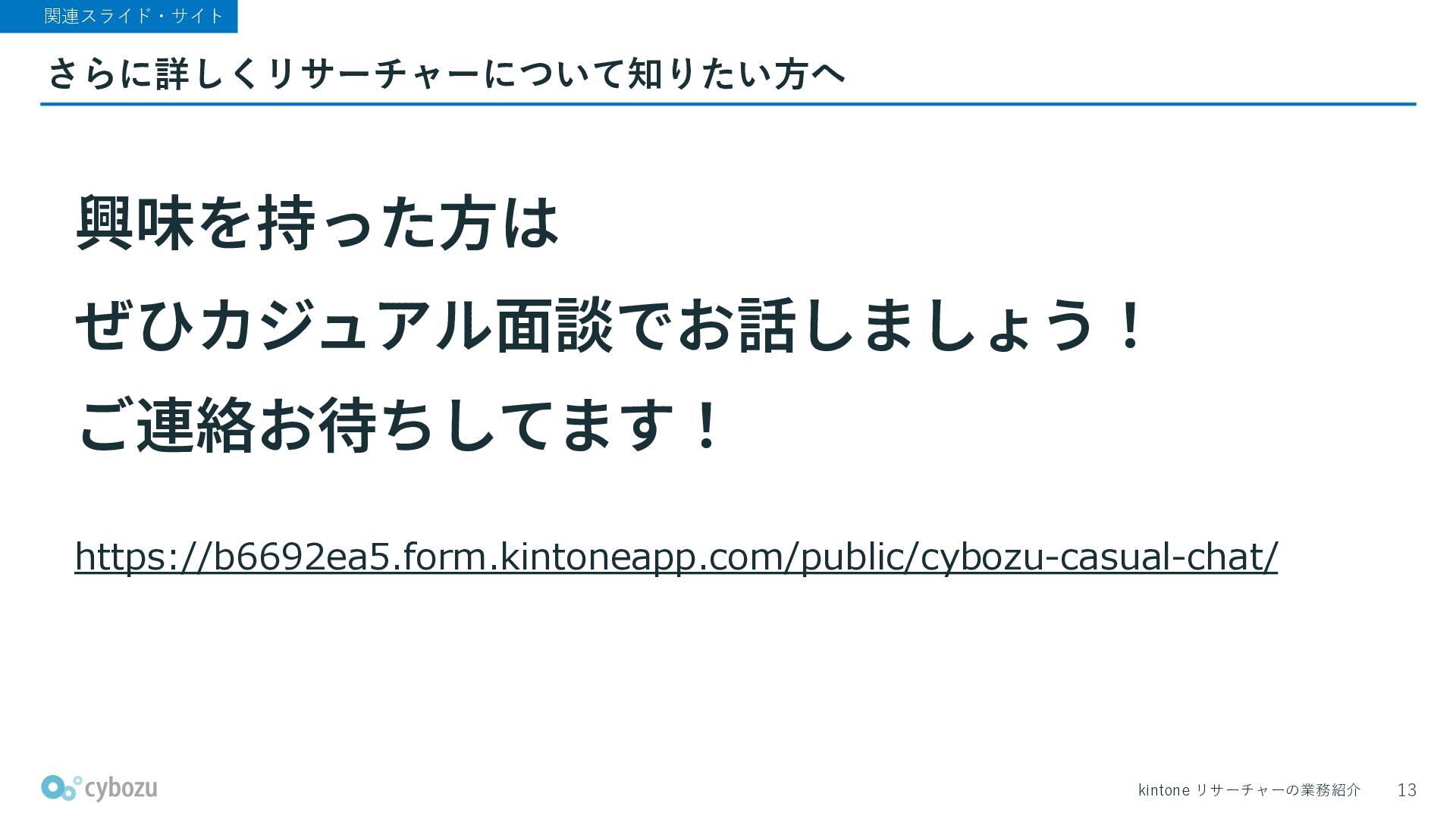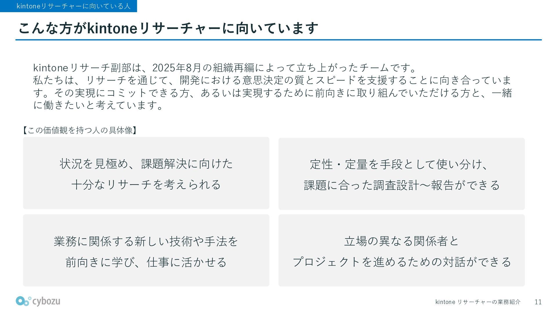 この資料では、kintone開発におけるUXリサーチャーの役割や、チームとの関わり方、日々の業務についてご紹介します。