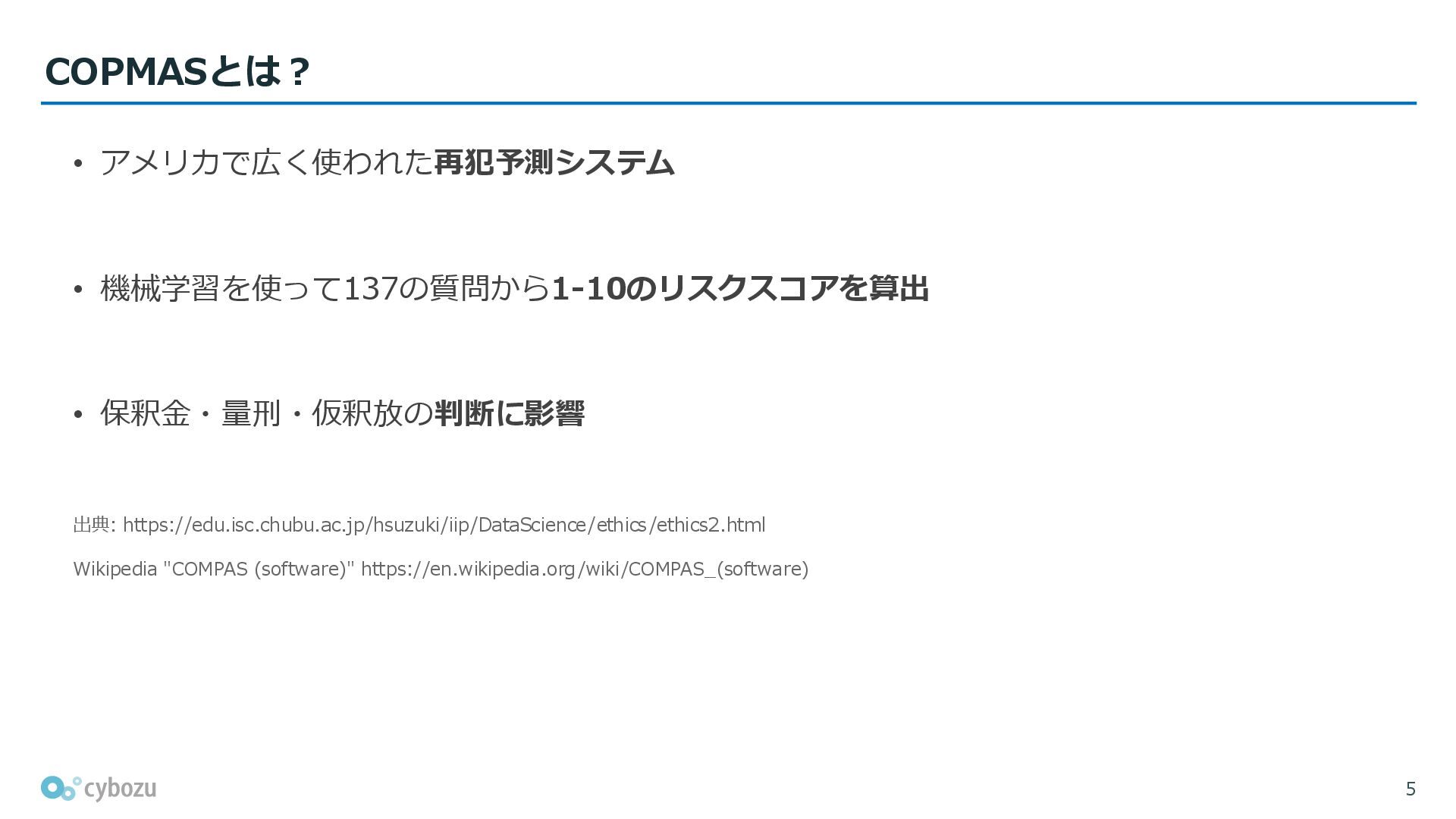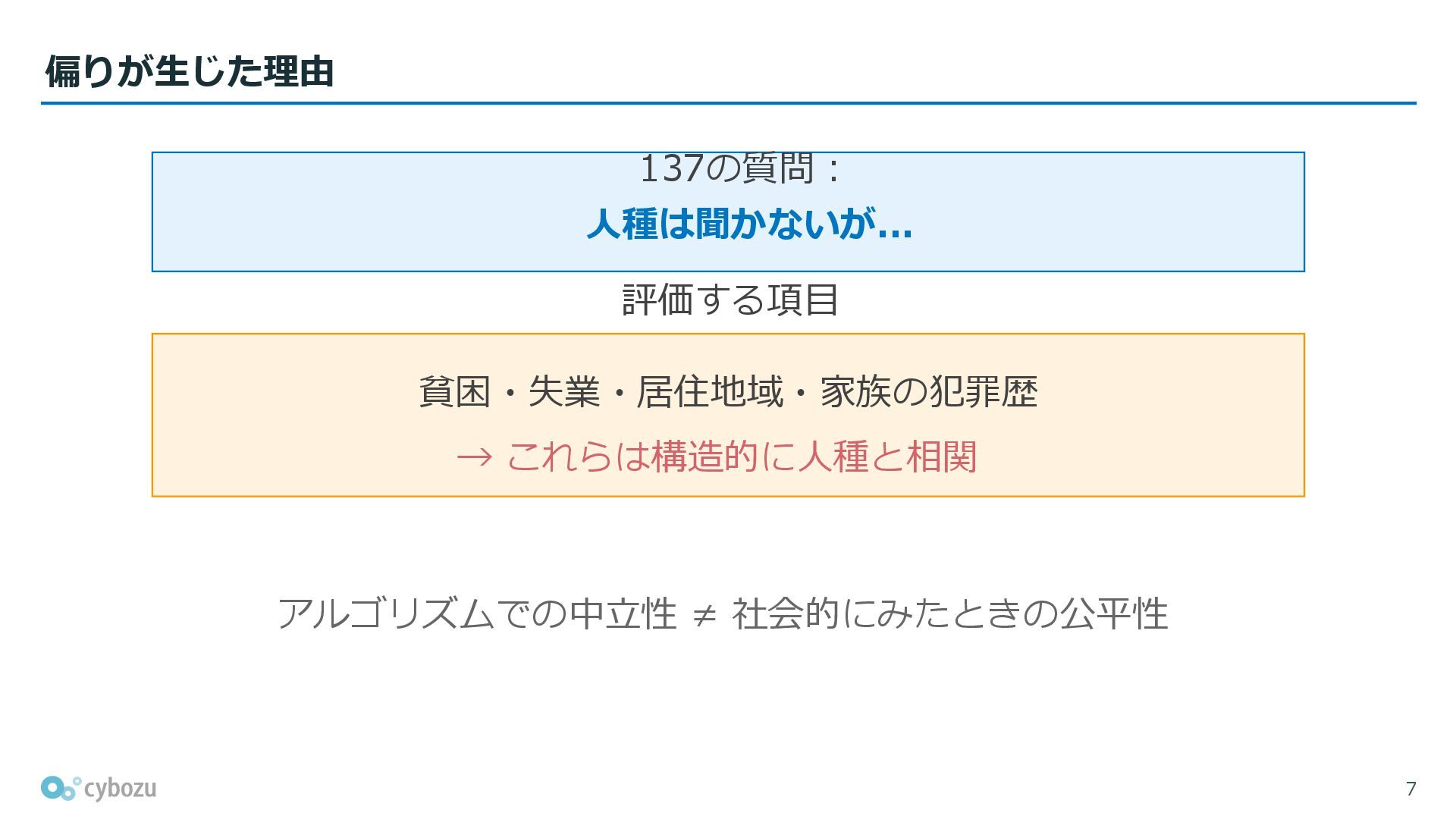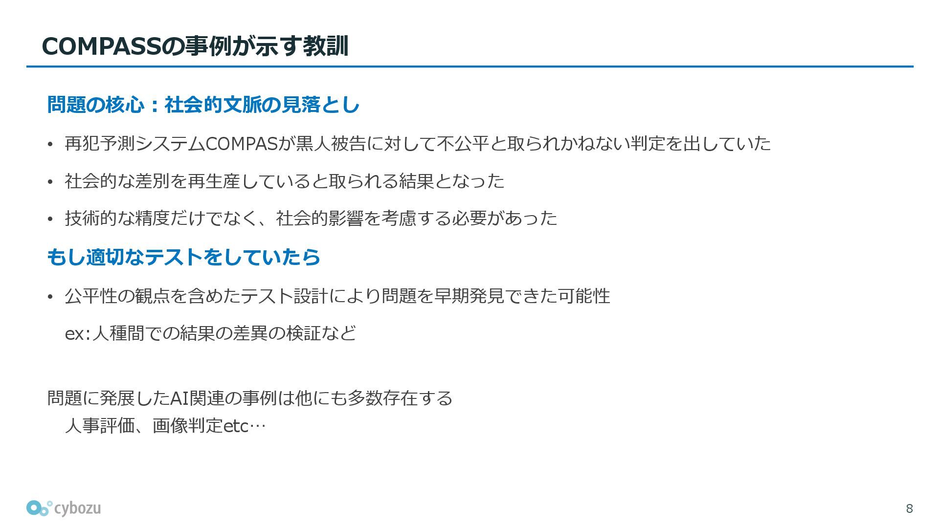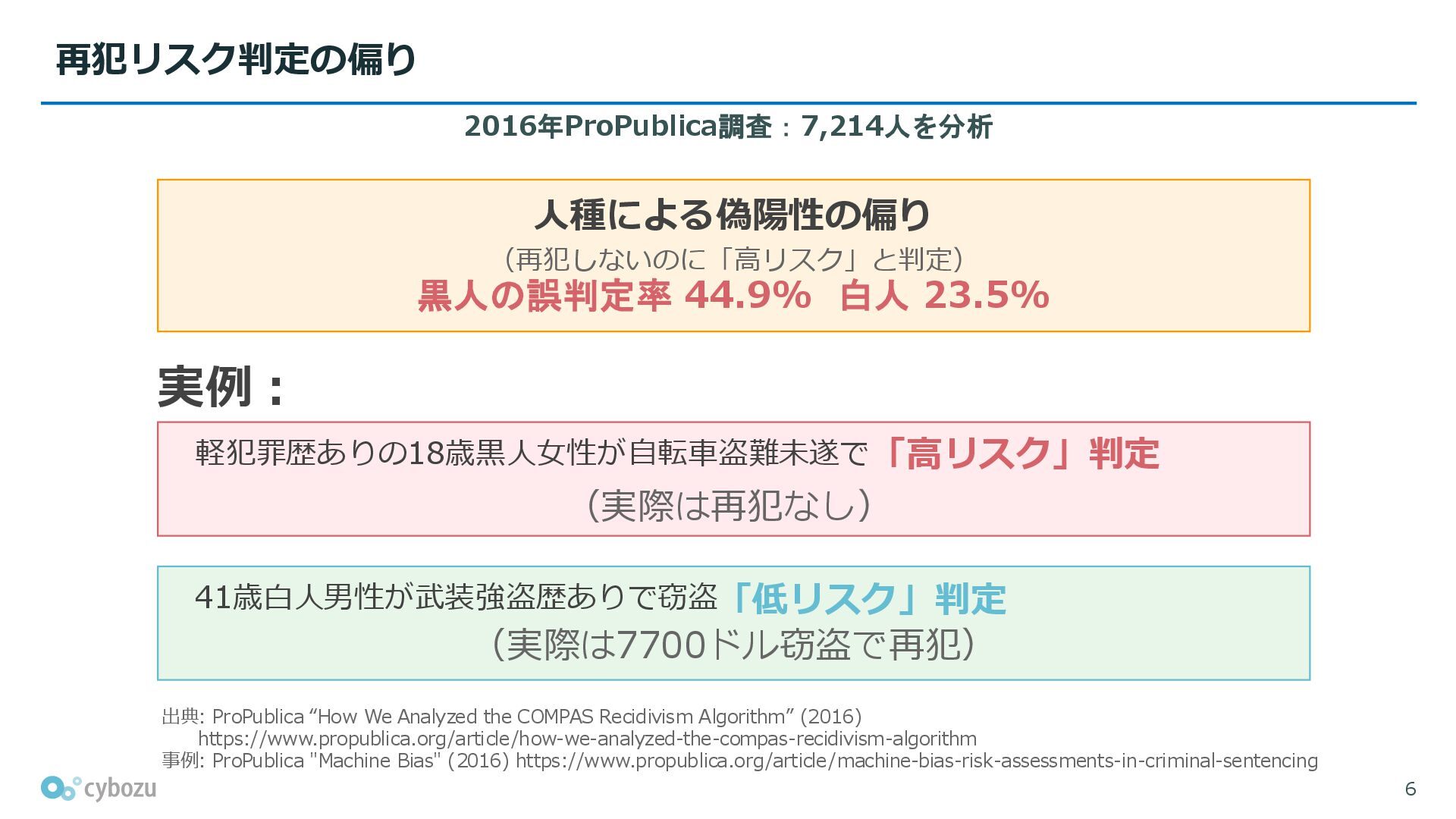 軽犯罪歴ありの18歳黒人女性が自転車盗難未遂で「高リスク」判定 (実際は再犯なし) 41歳白人男性が武装強盗歴ありで窃盗「低リスク」判定 (実際は7700ドル窃盗で再犯) 出典: ProPublica “How We Analyzed the COMPAS Recidivism Algorithm” (2016) https://www.propublica.org/article/how-we-analyzed-the-compas-recidivism-algorithm 事例: ProPublica "Machine Bias" (2016) https://www.propublica.org/article/machine-bias-risk-assessments-in-criminal-sentencing