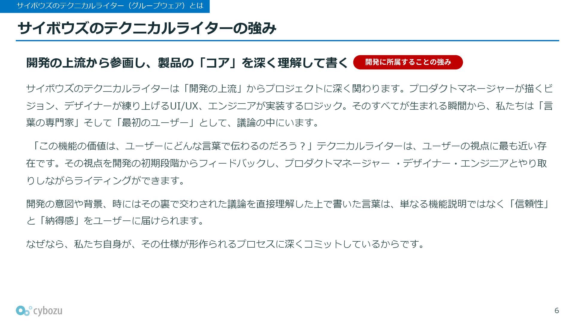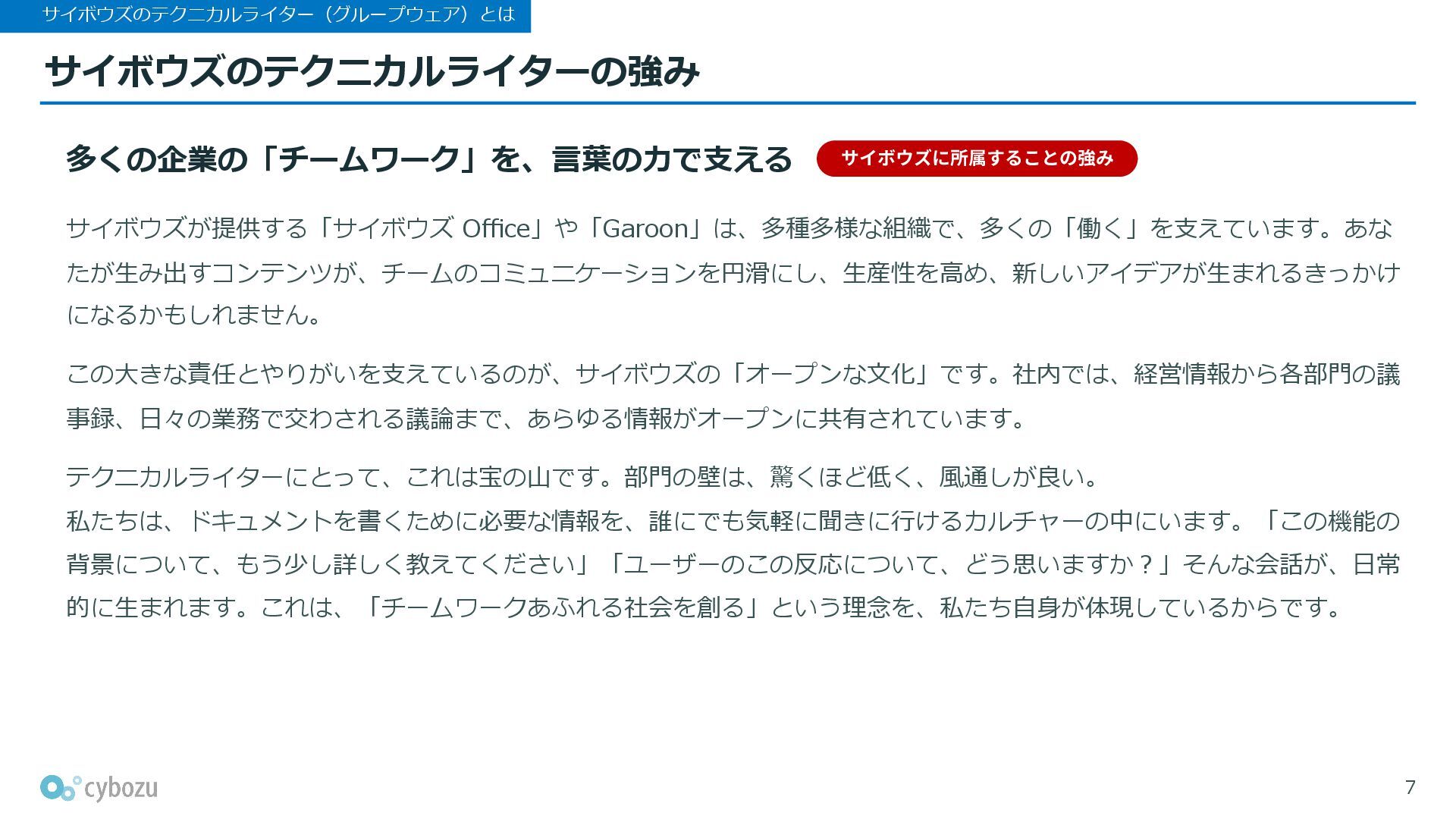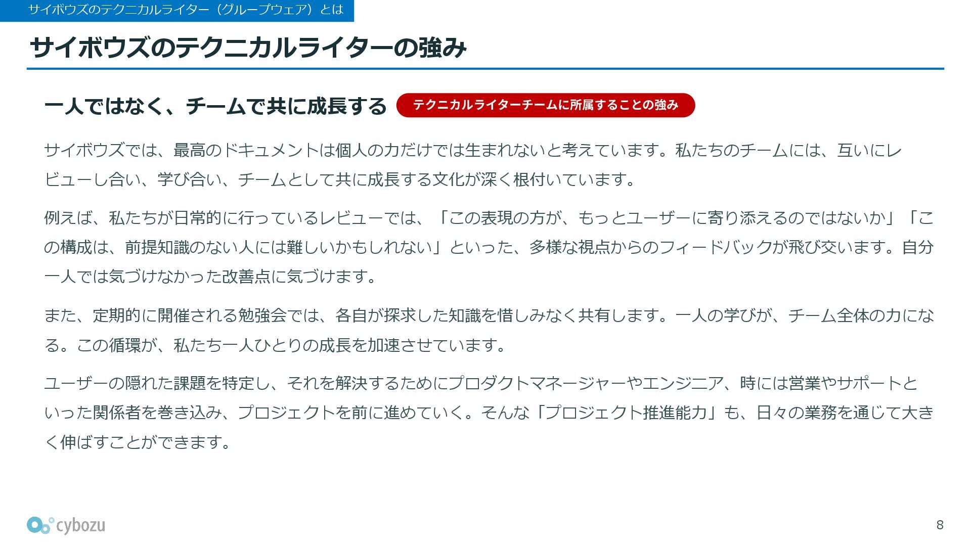 このピッチ資料では、サイボウズのテクニカルライター(グループウェア)について、所属チームや、業務の特徴や強み、求めるポジション・スキルなどをご紹介します。