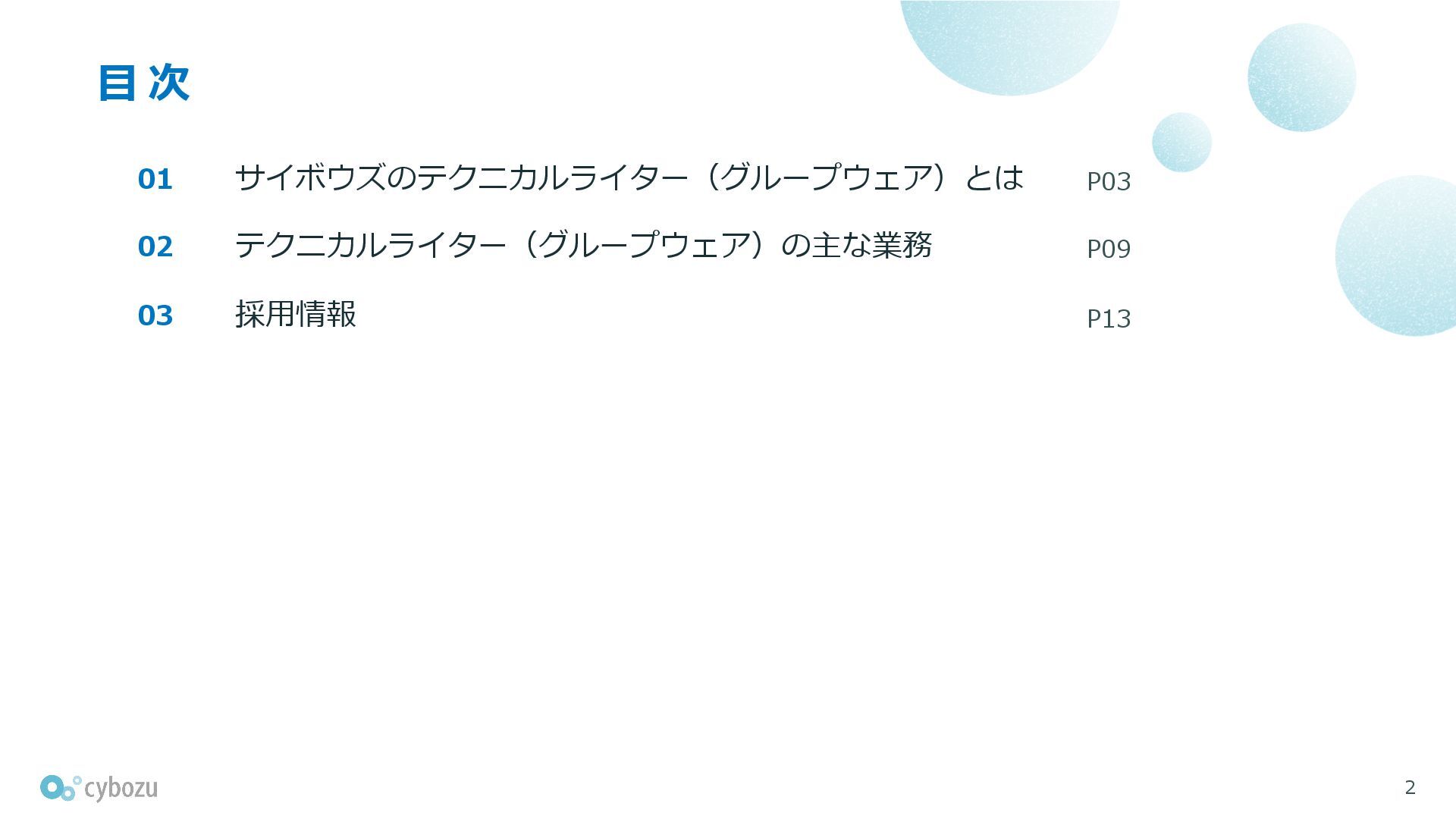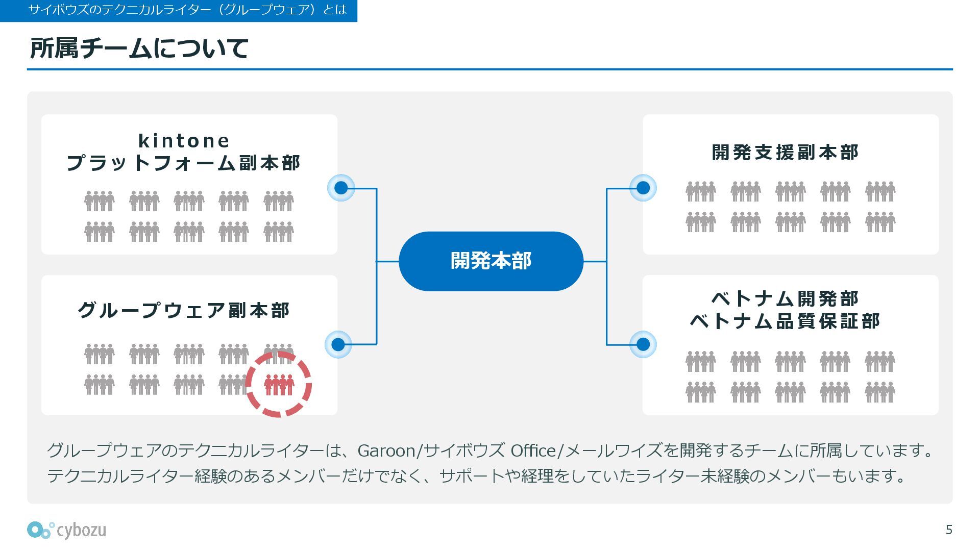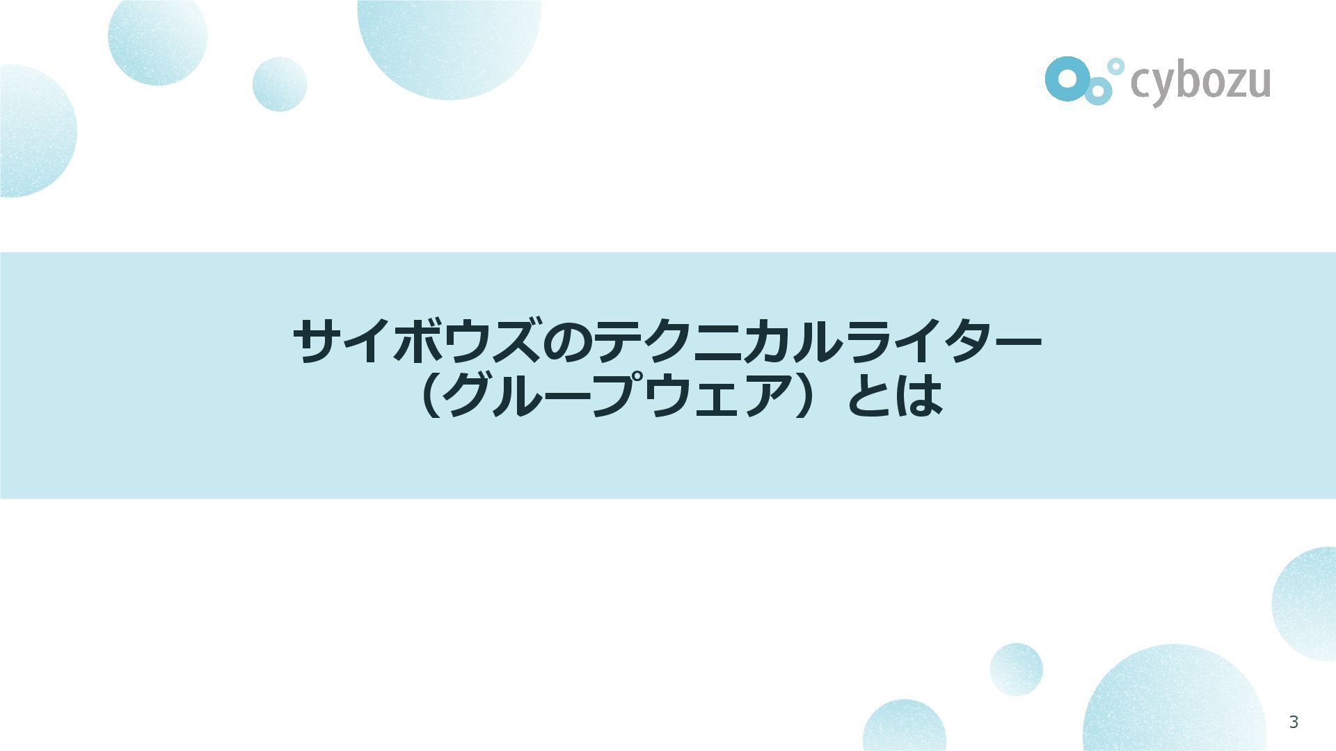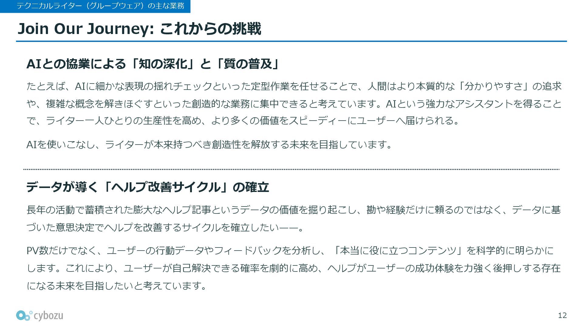 このピッチ資料では、サイボウズのテクニカルライター(グループウェア)について、所属チームや、業務の特徴や強み、求めるポジション・スキルなどをご紹介します。