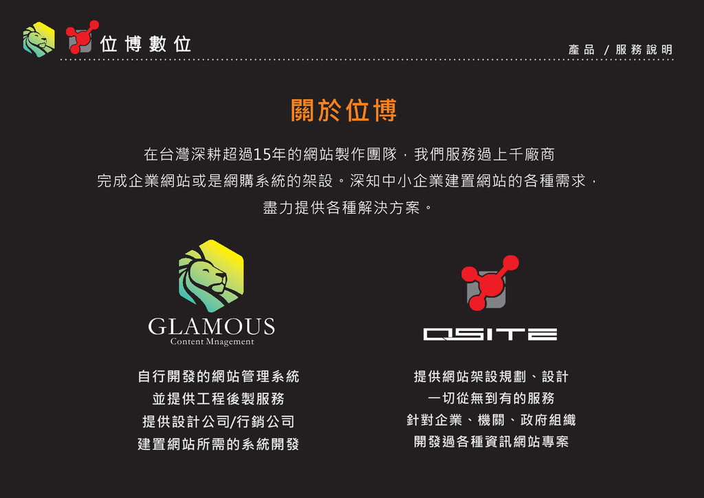 建置網站所需的系統開發 關於位博 在台灣深耕超過15年的網站製作團隊,我們服務過上千廠商 完成企業網站或是網購系統的架設。深知中小企業建置網站的各種需求, 盡力提供各種解決方案。 GLAMOUS Content Mnagement 提供網站架設規劃、設計 一切從無到有的服務 針對企業、機關、政府組織 開發過各種資訊網站專案