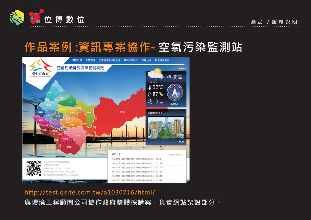http://test.qsite.com.tw/a1030716/html/ 與環境工程顧問公司協作政府整體採購案,負責網站架設部分。