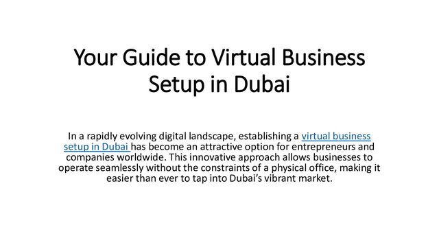 enables you to run your business remotely, leveraging digital tools and services instead of traditional office spaces. This model typically includes essential components like a professional business address, mail handling, communication services, and access to meeting facilities, allowing you to maintain a credible presence in the bustling business environment of Dubai. Why Opt for a Virtual Business Setup in Dubai? 1.Cost Efficiency One of the primary advantages of a virtual business setup is cost savings. By eliminating the need for a physical office, you can significantly reduce overhead expenses such as rent, utilities, and maintenance. This allows you to allocate funds toward growth and development. 2.Professional Image Having a prestigious business address in Dubai enhances your credibility with clients and partners. A virtual setup gives you the advantage of a recognized location, which can be critical for building trust and legitimacy in the eyes of your stakeholders. 3.Flexibility and Accessibility A virtual business setup allows you to work from anywhere, providing the flexibility to manage your operations on your terms. Whether you’re at home, traveling, or collaborating with a global team, you can stay connected and productive. 4.Scalability As your business grows, so can your virtual setup. You can easily add services or upgrade your package to meet your evolving needs without the hassle of relocating or expanding a physical space. 5.Access to Essential Services Many virtual business providers offer a range of services, such as administrative support, phone answering, and meeting room access. This means you can focus on core business activities while knowing that logistical tasks are handled professionally.