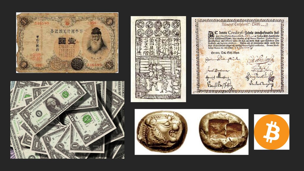 物々交換からビットコインまで ⾦銀銅貨 ◯ 尺度が整った × 遠くに運ぶには適していない、⾜りない 重すぎ、⾦が流通量に 対して⾜りない ↑ 兌換紙幣へ