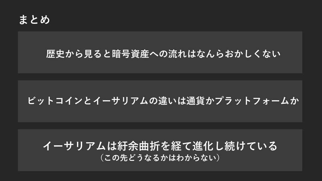 まとめ 歴史から⾒ると暗号資産への流れはなんらおかしくない ビットコインとイーサリアムの違いは通貨かプラットフォームか イーサリアムは紆余曲折を経て進化し続けている (この先どうなるかはわからない)