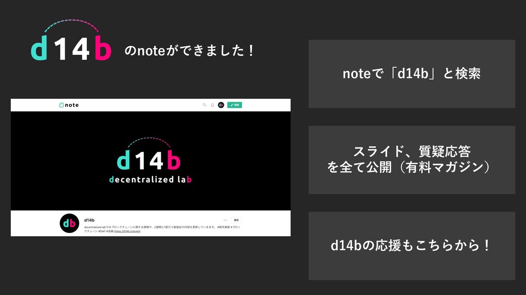 noteで「d14b」と検索 スライド、質疑応答 を全て公開(有料マガジン) d14bの応援もこちらから! d14b のnoteができました!
