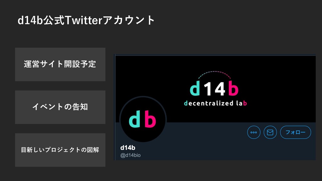 d14b公式Twitterアカウント 運営サイト開設予定 イベントの告知 ⽬新しいプロジェクトの図解