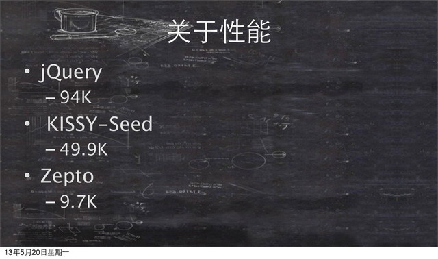 需要 94/6.25 = 15.04S • 下载KISSY-Seed, 需要49.9/6.25 =7.98S • 下载Zepto, 需要9.7/6.25 = 1.55S 13年5月20⽇日星期⼀一