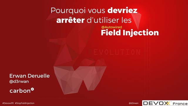 Nous nous intéresserons aux défauts induits par l'utilisation des injections par champ (field injection), alors même qu'elles sont encore très populaires aujourd'hui (notamment grâce à Spring). Nous verrons quelles sont les alternatives possibles, et les avantages consécutifs à leur utilisation.