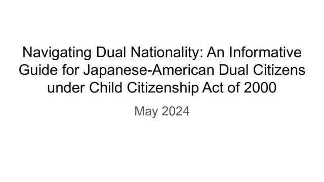 This guide provides crucial information for Japanese-American dual citizens who obtained their U.S. citizenship through the Child Citizenship Act of 2000. It covers essential topics such as the use of dual passports while traveling, managing nationality laws, passport renewal, and how to secure Japanese nationality for children. Designed for those under 20 years of age, the slides include tips for interacting with Japanese officials and understanding legal rights. The document is intended for informational purposes only and is not a substitute for professional legal advice.