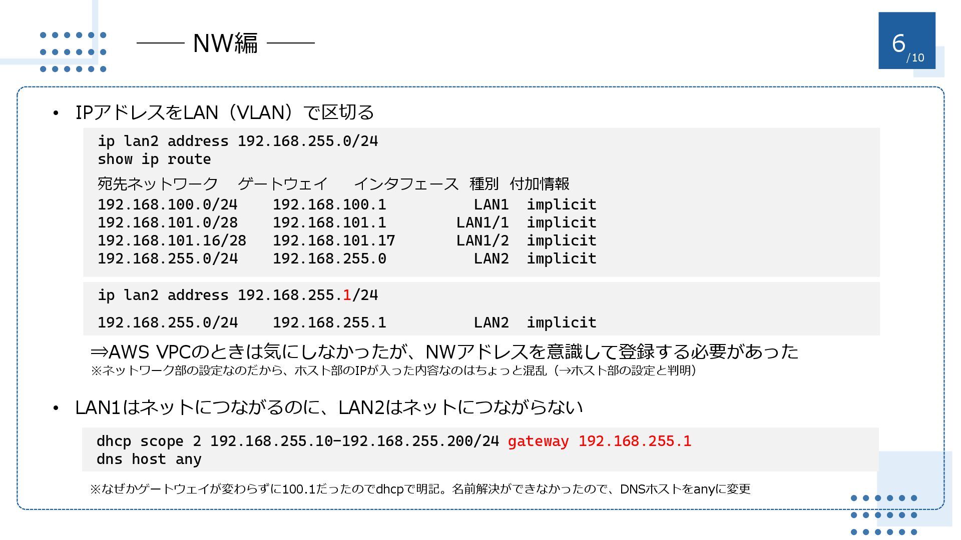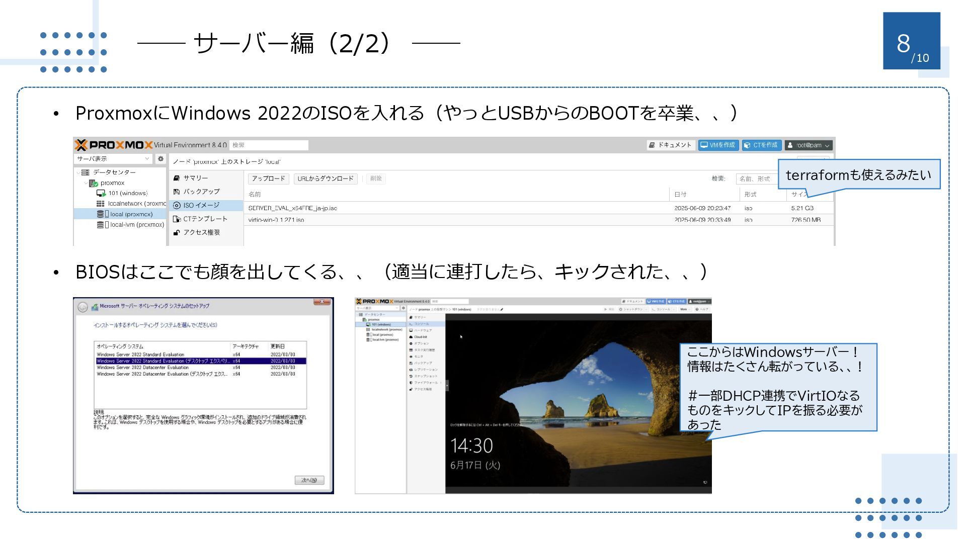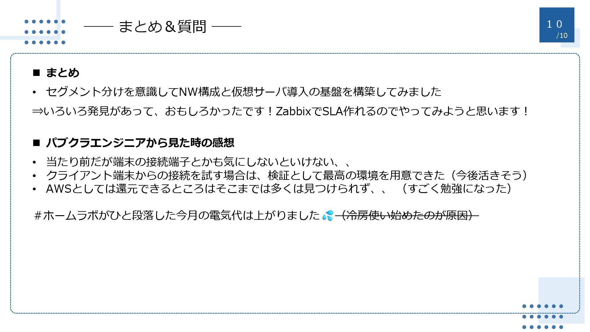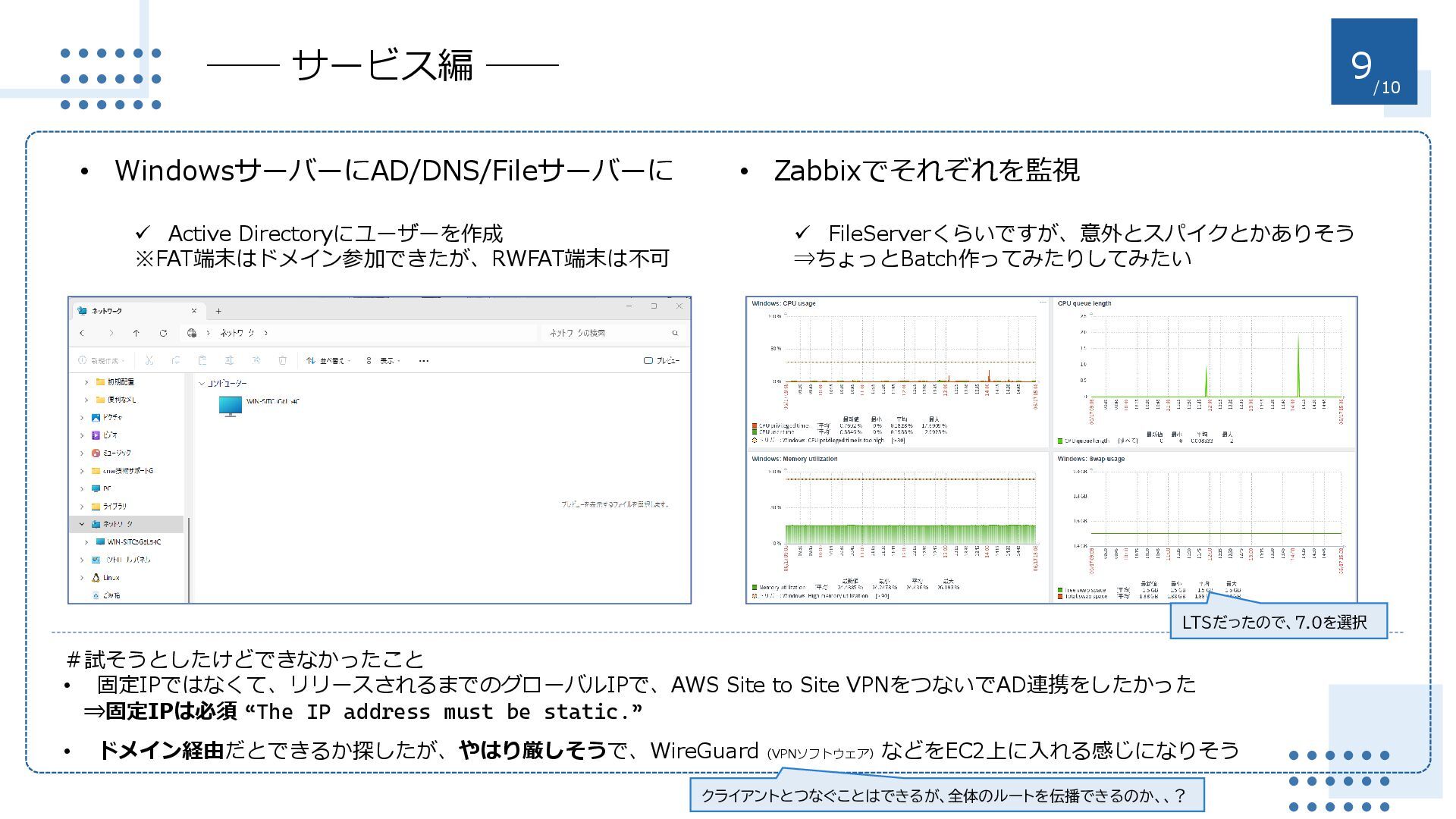 ※FAT端末はドメイン参加できたが、RWFAT端末は不可 • Zabbixでそれぞれを監視 ✓ FileServerくらいですが、意外とスパイクとかありそう ⇒ちょっとBatch作ってみたりしてみたい #試そうとしたけどできなかったこと • 固定IPではなくて、リリースされるまでのグローバルIPで、AWS Site to Site VPNをつないでAD連携をしたかった ⇒固定IPは必須 “The IP address must be static.” • ドメイン経由だとできるか探したが、やはり厳しそうで、WireGuard(VPNソフトウェア) などをEC2上に入れる感じになりそう クライアントとつなぐことはできるが、全体のルートを伝播できるのか、、? LTSだったので、7.0を選択 9