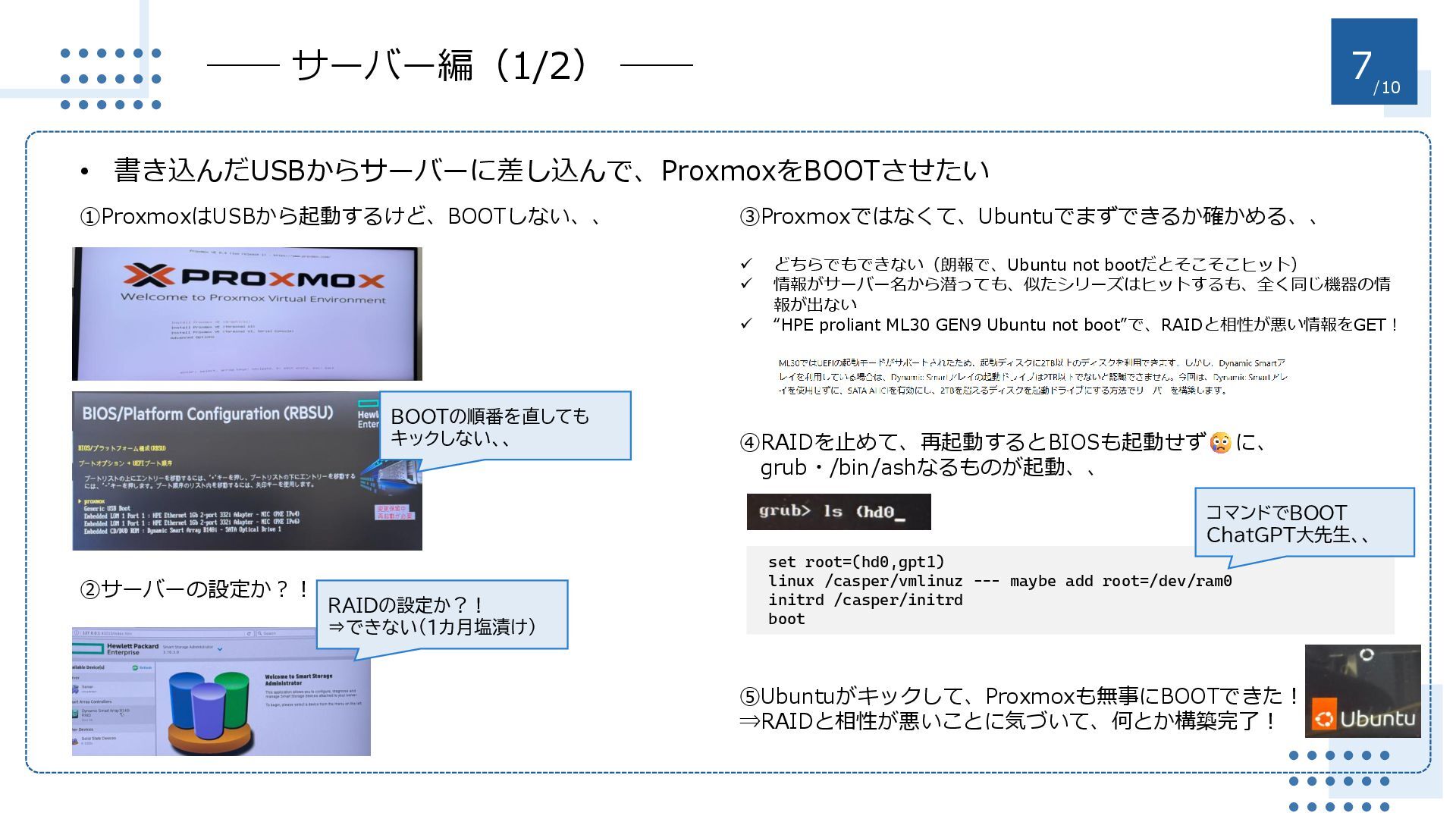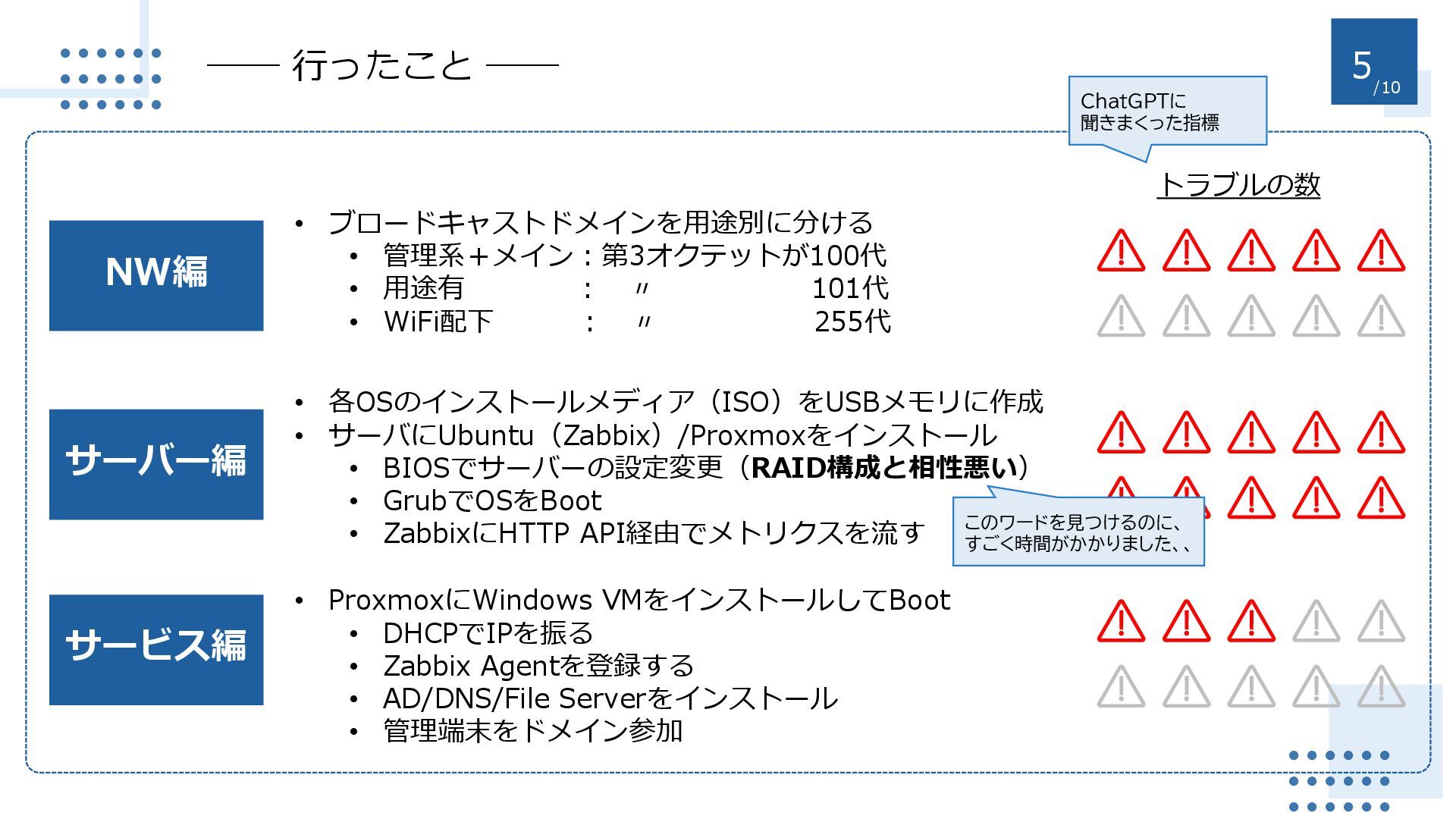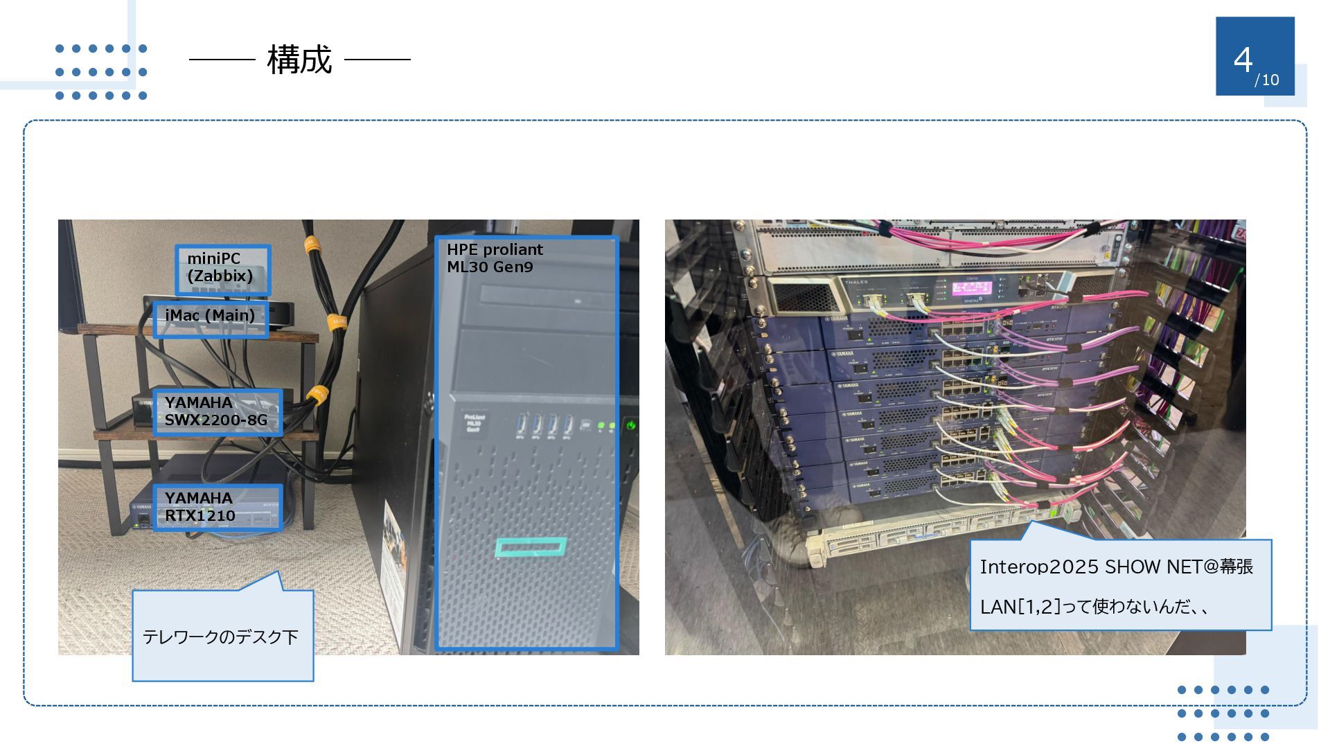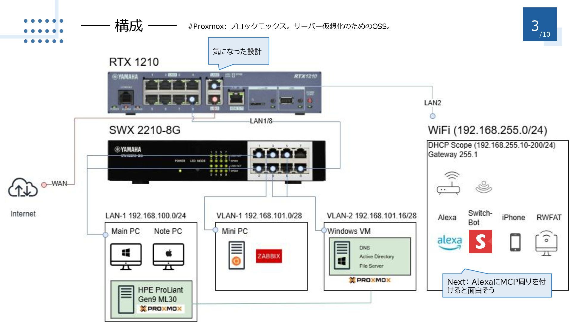 ※FAT端末はドメイン参加できたが、RWFAT端末は不可 • Zabbixでそれぞれを監視 ✓ FileServerくらいですが、意外とスパイクとかありそう ⇒ちょっとBatch作ってみたりしてみたい #試そうとしたけどできなかったこと • 固定IPではなくて、リリースされるまでのグローバルIPで、AWS Site to Site VPNをつないでAD連携をしたかった ⇒固定IPは必須 “The IP address must be static.” • ドメイン経由だとできるか探したが、やはり厳しそうで、WireGuard(VPNソフトウェア) などをEC2上に入れる感じになりそう クライアントとつなぐことはできるが、全体のルートを伝播できるのか、、? LTSだったので、7.0を選択 9