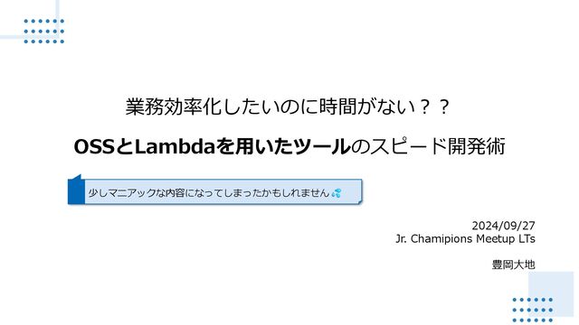 / 2024/09/27 Jr. Chamipions Meetup LTs 豊岡大地 業務効率化したいのに時間がない?? OSSとLambdaを用いたツールのスピード開発術 少しマニアックな内容になってしまったかもしれません