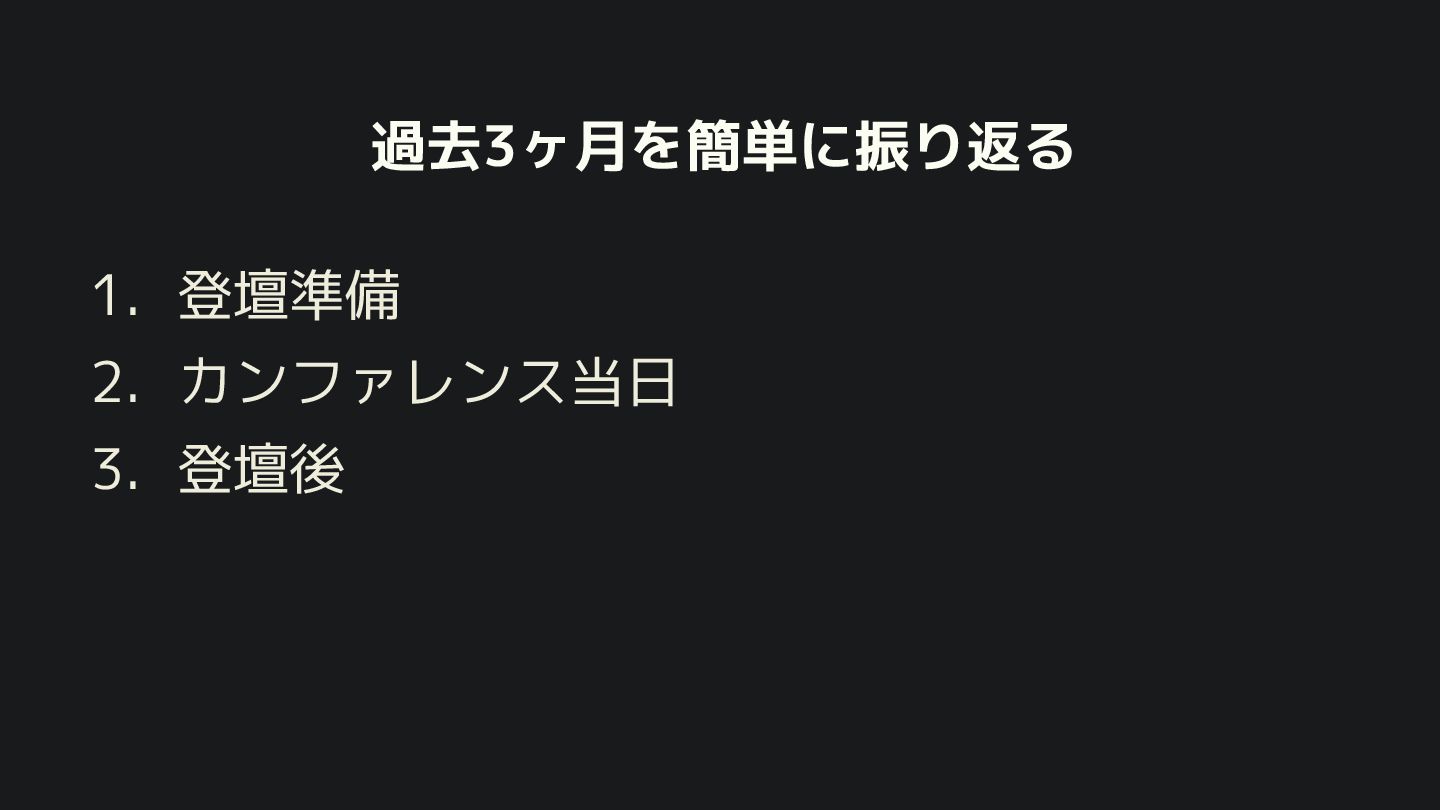 過去3ヶ月を簡単に振り返る 1. 登壇準備 2. カンファレンス当日 3. 登壇後