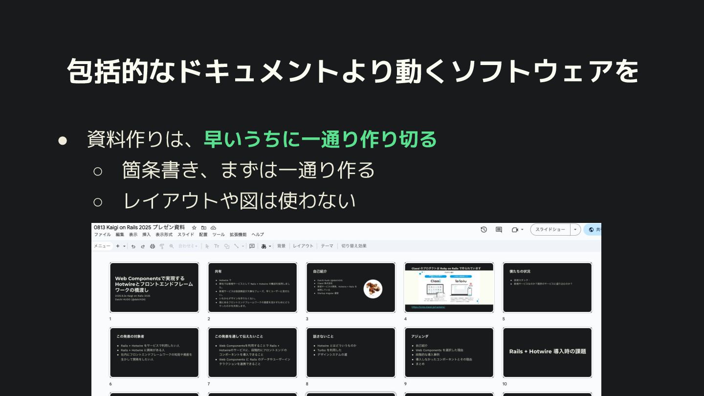 • 資料作りは、早いうちに一通り作り切る ◦ 箇条書き、まずは一通り作る ◦ レイアウトや図は使わない 包括的なドキュメントより動くソフトウェアを