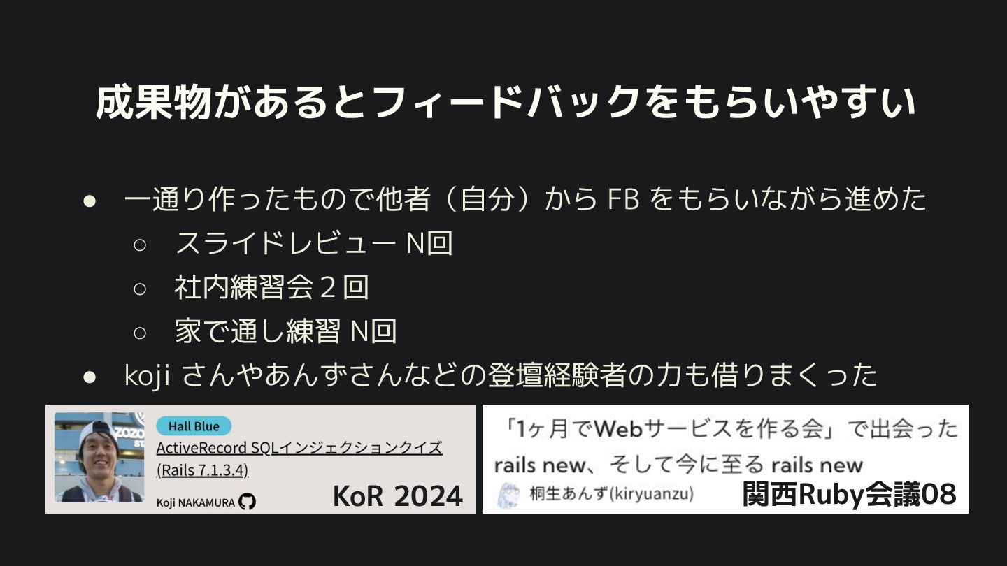 家で通し練習 N回 • koji さんやあんずさんなどの登壇経験者の力も借りまくった 成果物があるとフィードバックをもらいやすい KoR 2024 関西Ruby会議08
