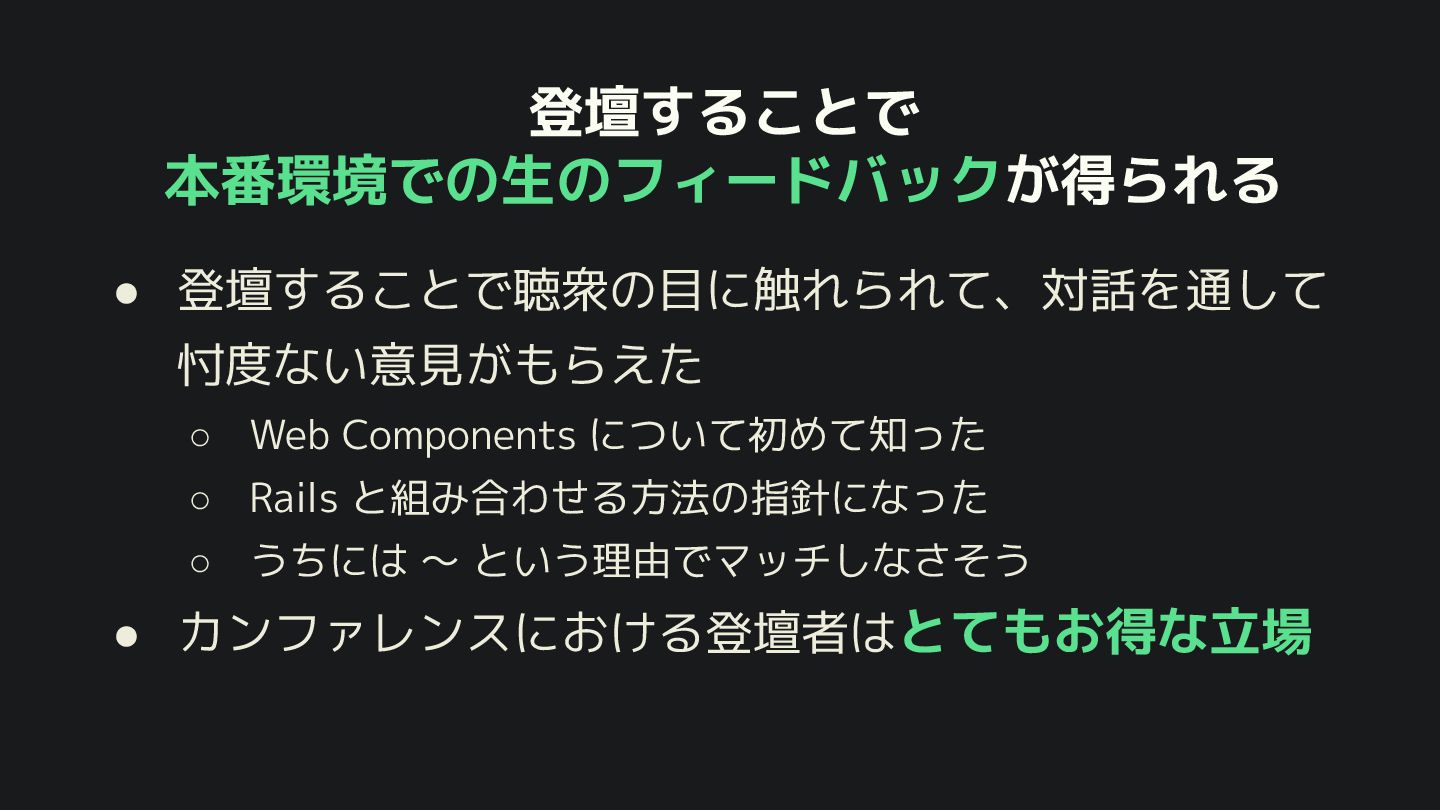登壇することで 本番環境での生のフィードバックが得られる • 登壇することで聴衆の目に触れられて、対話を通して 忖度ない意見がもらえた ◦ Web Components について初めて知った ◦