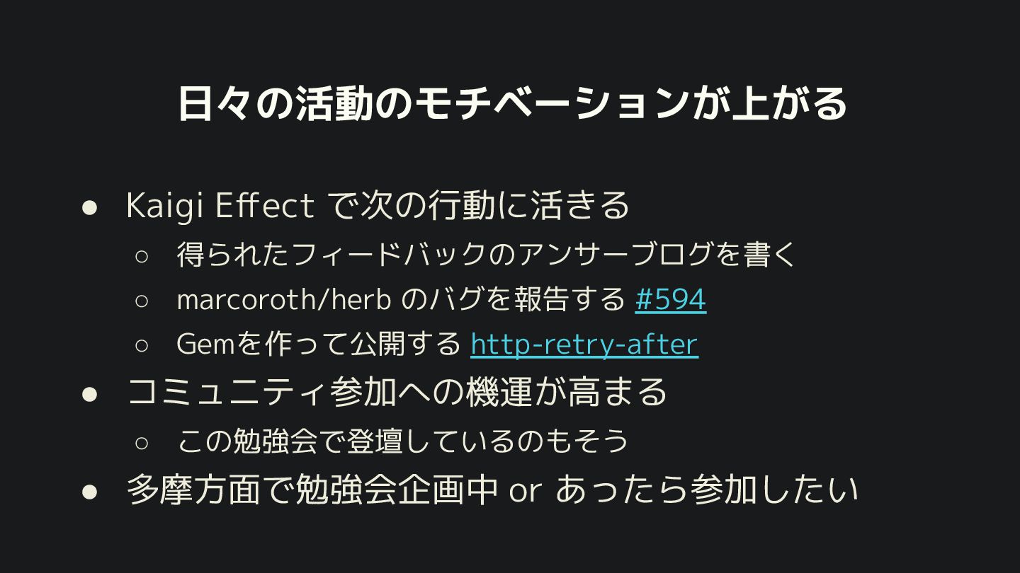#594 ◦ Gemを作って公開する http-retry-after • コミュニティ参加への機運が高まる ◦ この勉強会で登壇しているのもそう • 多摩方面で勉強会企画中 or あったら参加したい