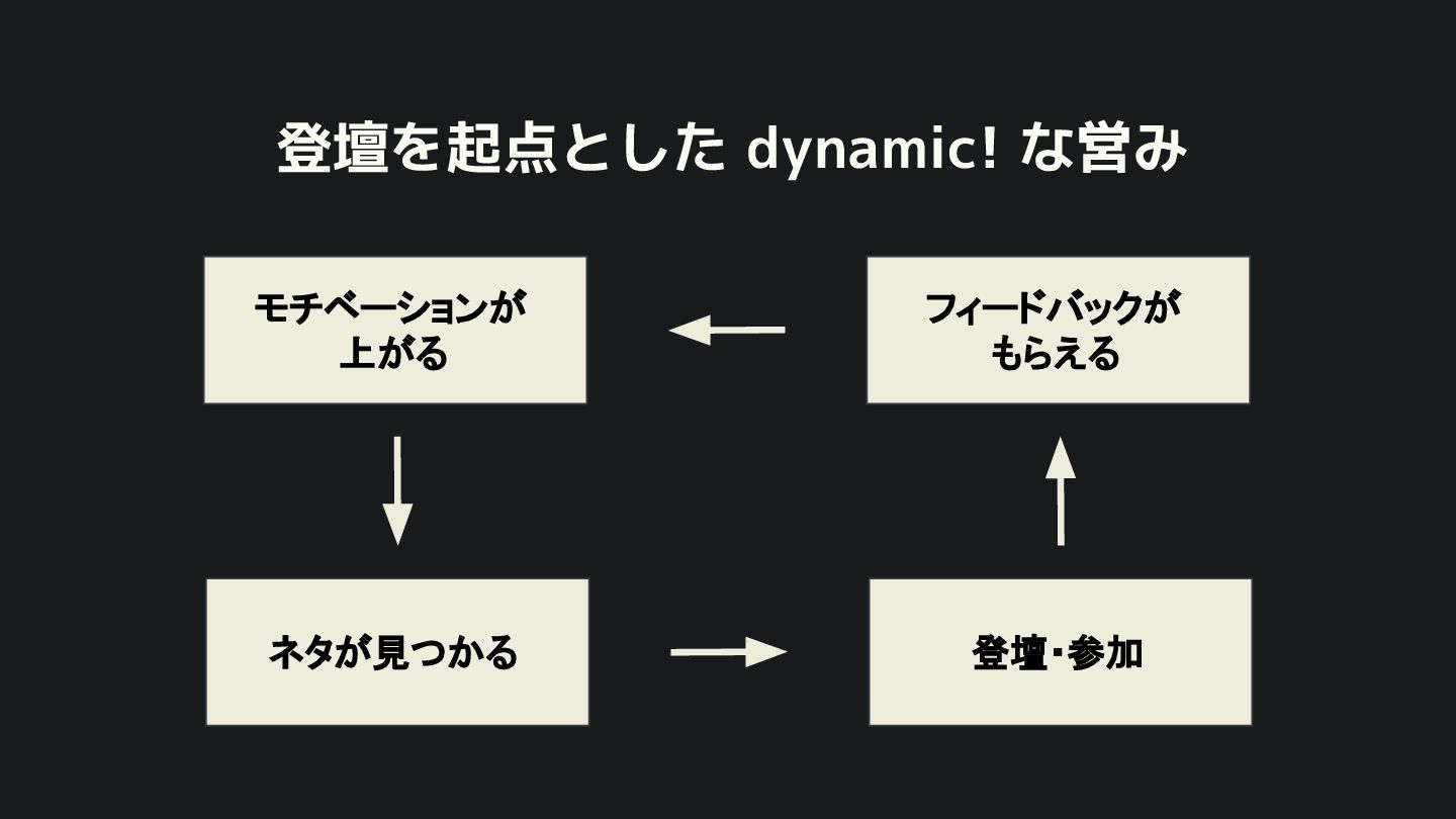 登壇を起点とした dynamic! な営み ネタが見つかる フィードバックが もらえる 登壇・参加 モチベーションが 上がる