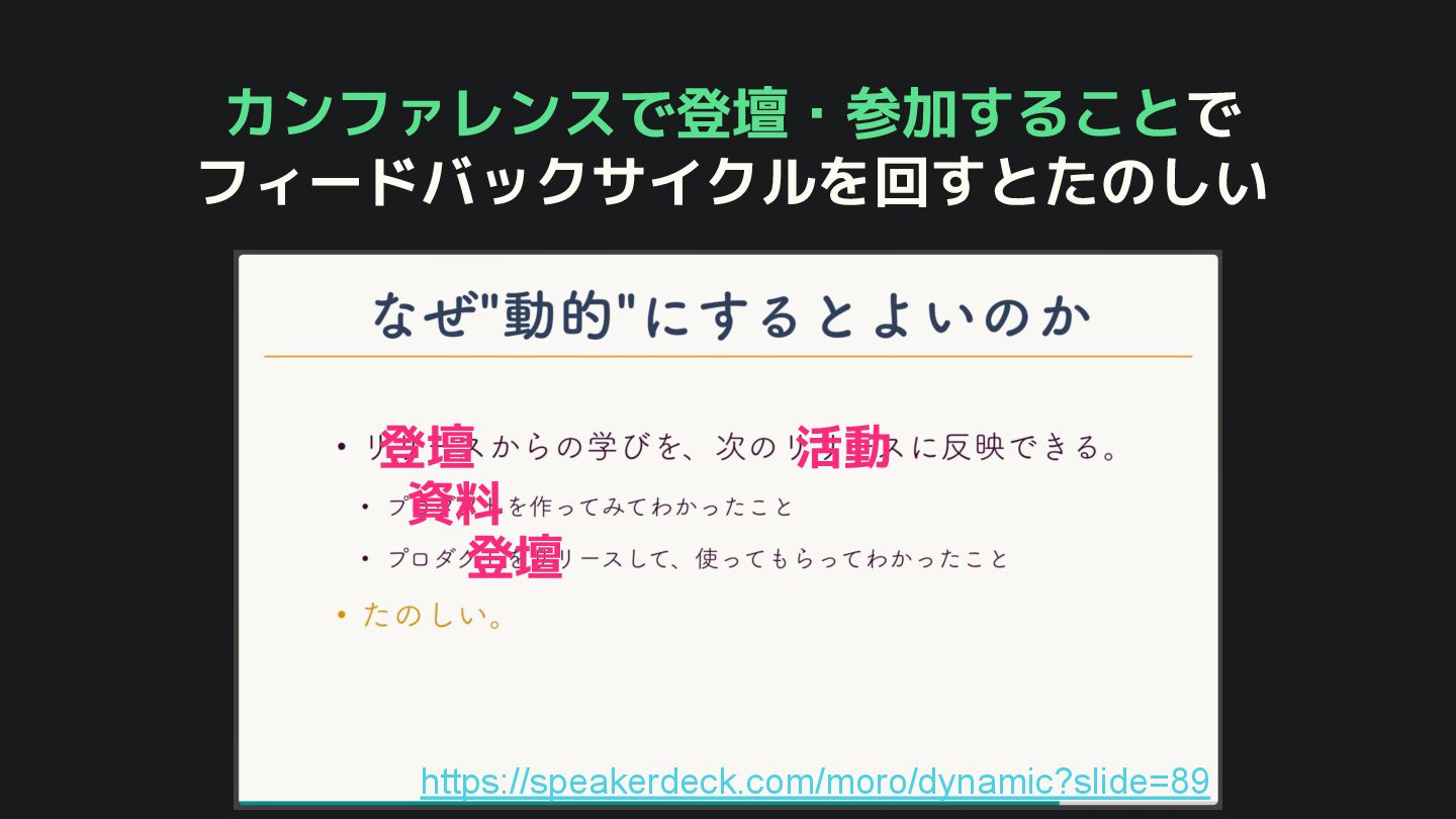 カンファレンスで登壇・参加することで フィードバックサイクルを回すとたのしい https://speakerdeck.com/moro/dynamic?slide=89 登壇 活動 資料 登壇