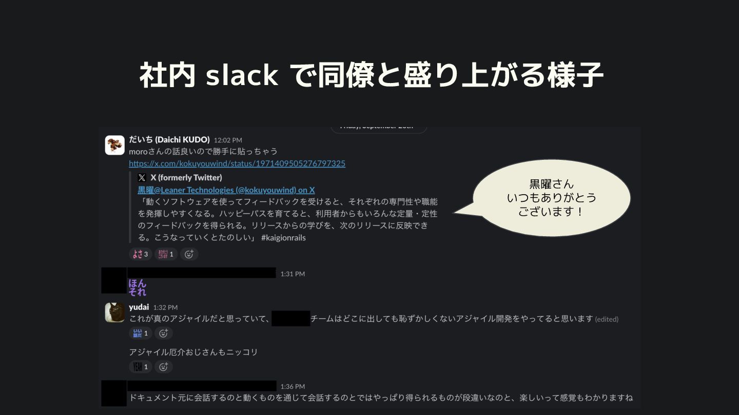社内 slack で同僚と盛り上がる様子 黒曜さん いつもありがとう ございます!
