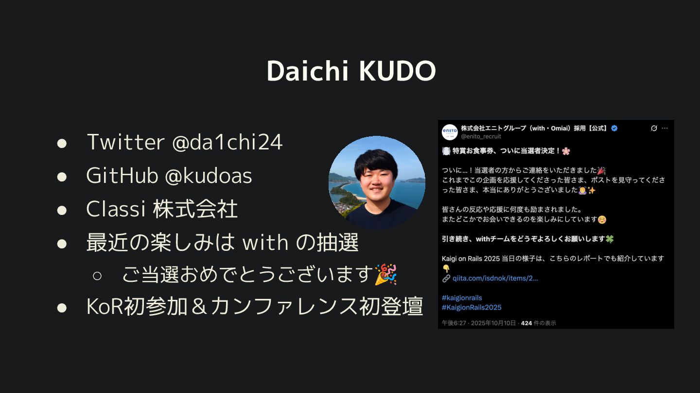最近の楽しみは with の抽選 ◦ ご当選おめでとうございます🎉 • KoR初参加&カンファレンス初登壇 Daichi KUDO
