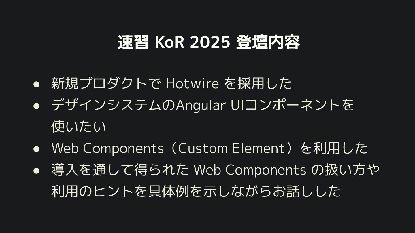速習 KoR 2025 登壇内容 • 新規プロダクトで Hotwire を採用した • デザインシステムのAngular