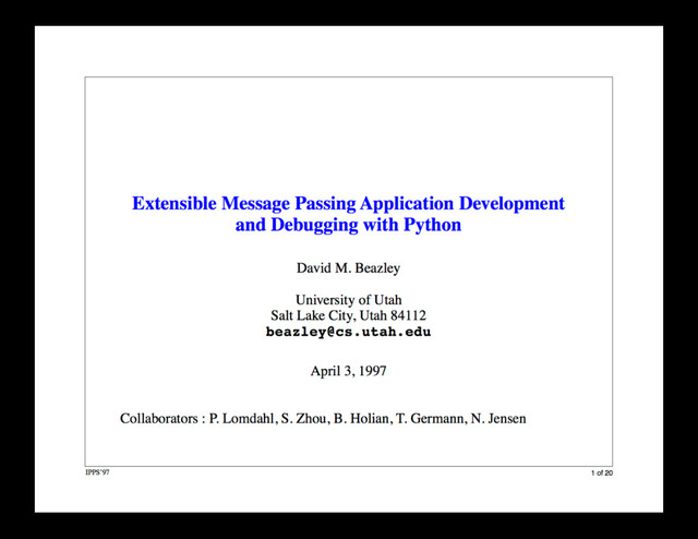 Conference presentation from International Parallel Processing Symposium (IPPS) 1997. Geneva. Discusses use of Python on supercomputers and with MPI.