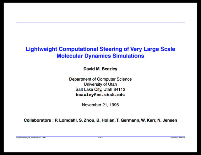 Conference presentation at Supercomputing 96. The first Supercomputing presentation to ever mention Python.