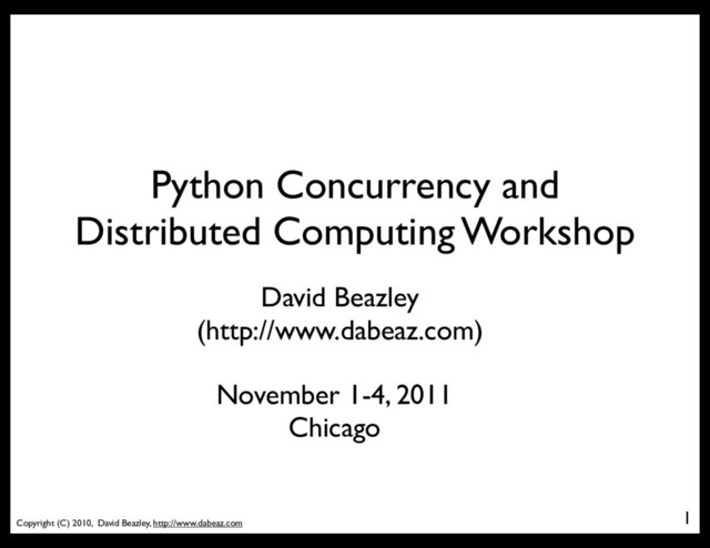 a set of support files and exercises 2 http://www.dabeaz.com/python/concurrent2011/ • We are using Python 3.2 (concurrent.zip) • Optional installs • numpy • ZeroMQ and pyzmq • Redis