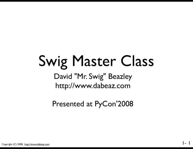 am the original creator of Swig • I wanted to make it easy for scientists to put scripting interfaces on physics software • Have since worked on a variety of other projects (parsing tools, debuggers, etc.) • I am still involved with Swig, but am coming off of a bit of sabbatical from working on it.