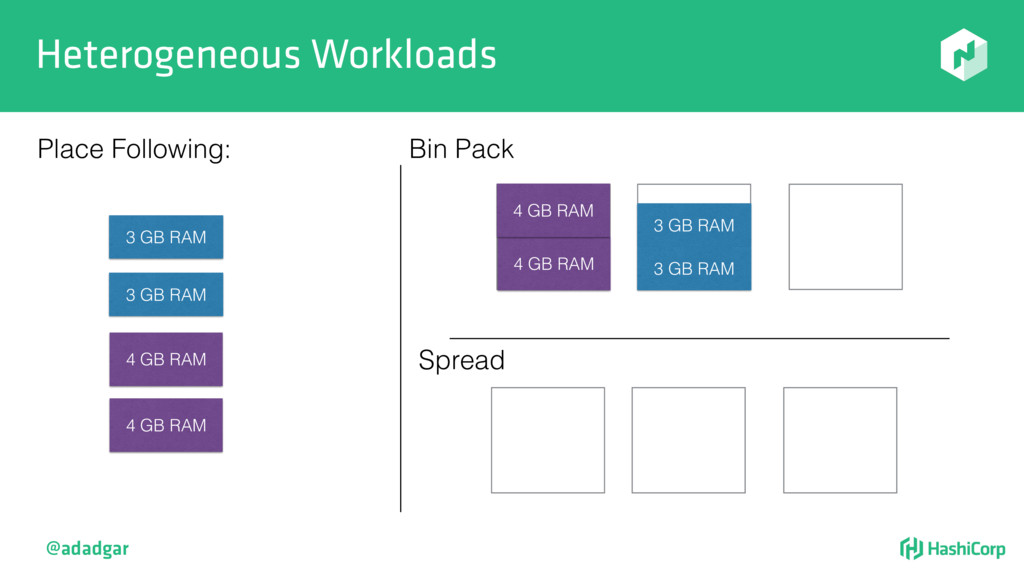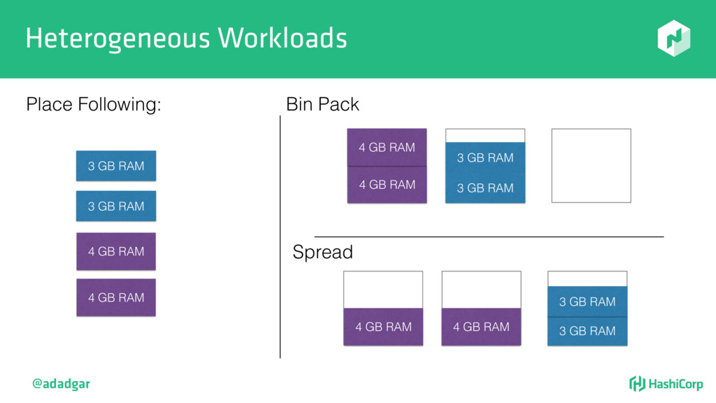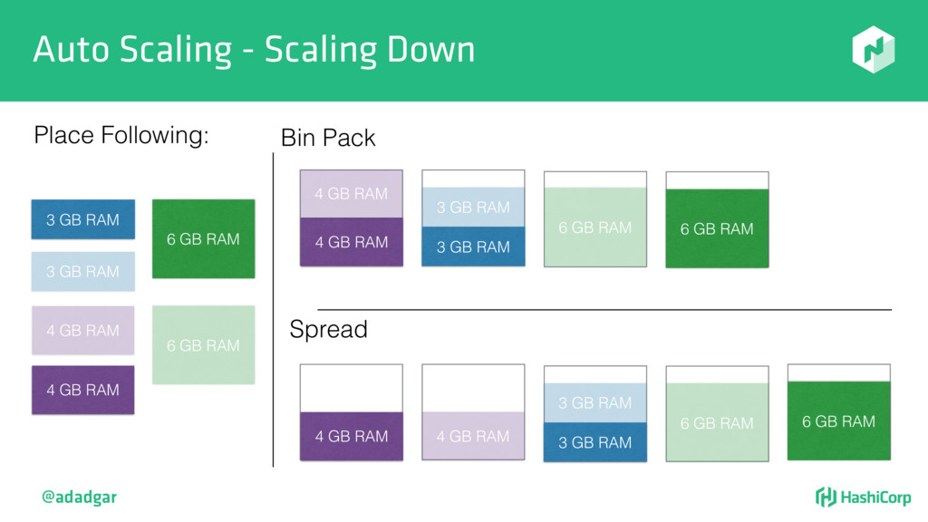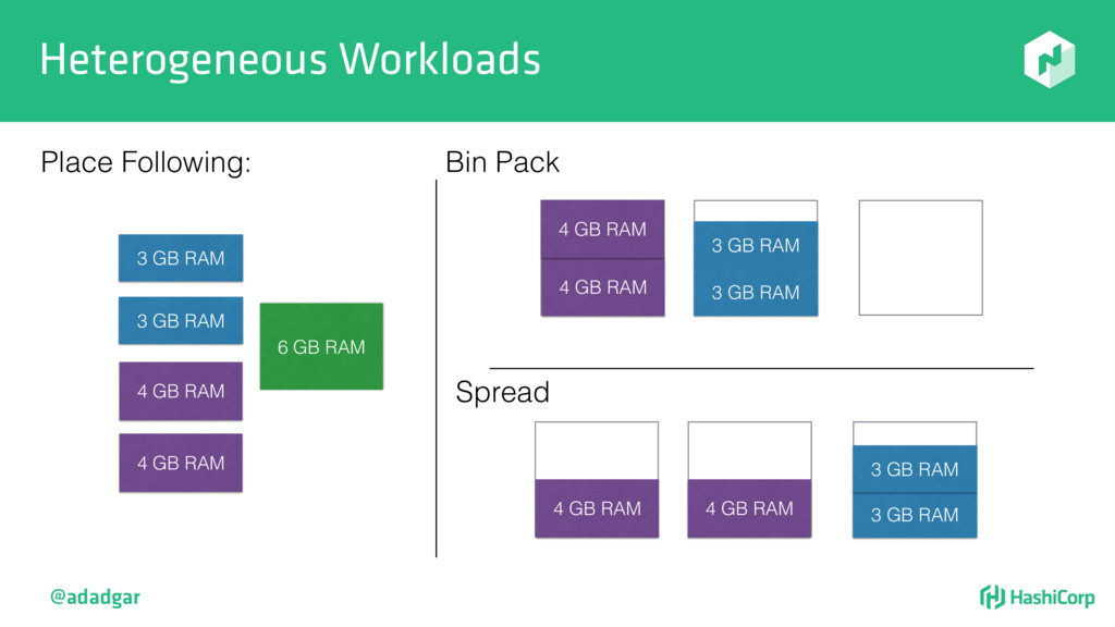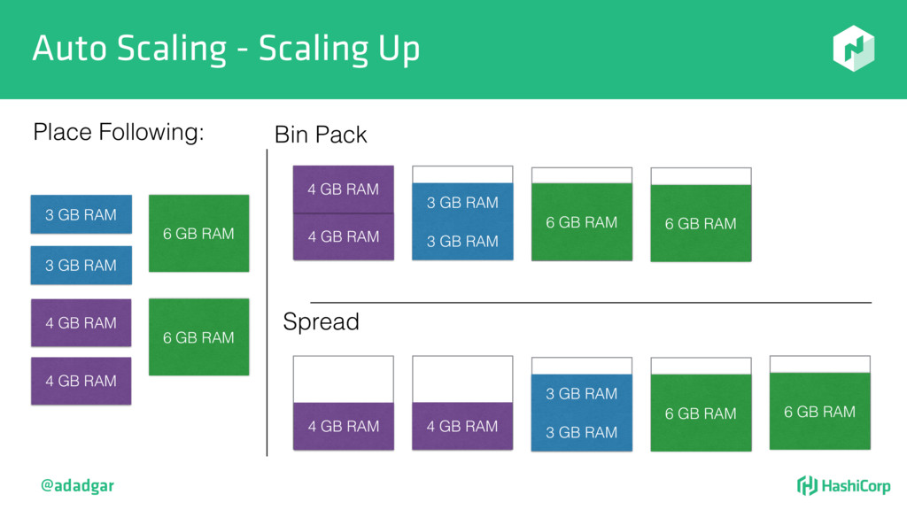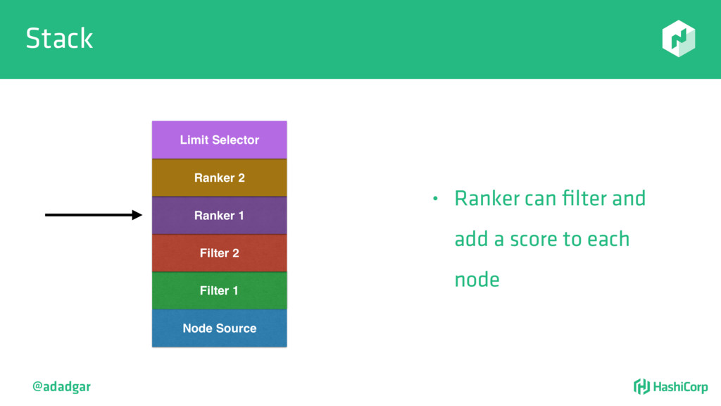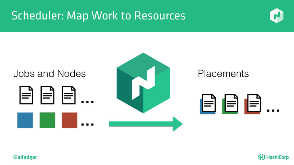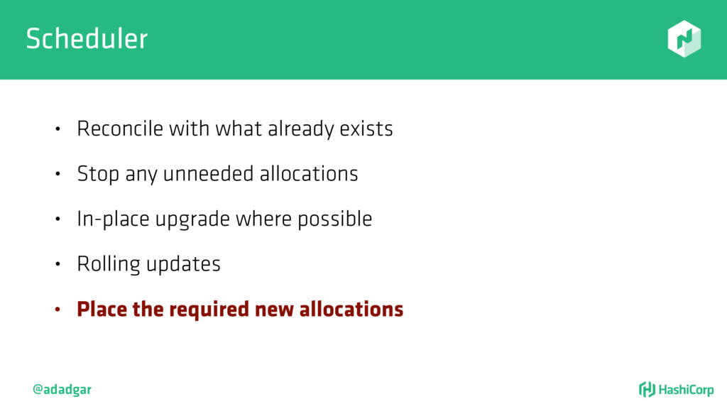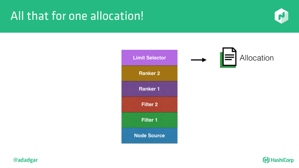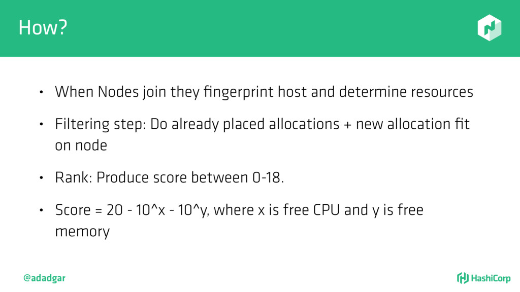 resources • Filtering step: Do already placed allocations + new allocation fit on node • Rank: Produce score between 0-18. • Score = 20 - 10^x - 10^y, where x is free CPU and y is free memory @adadgar