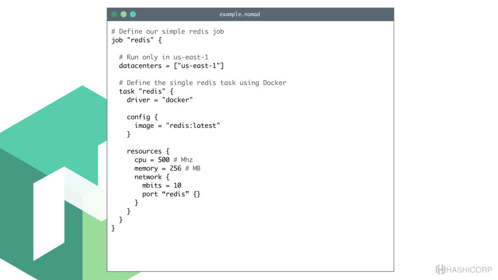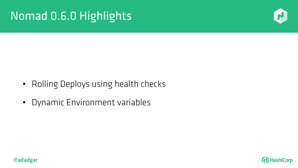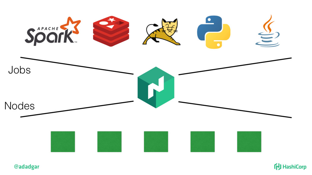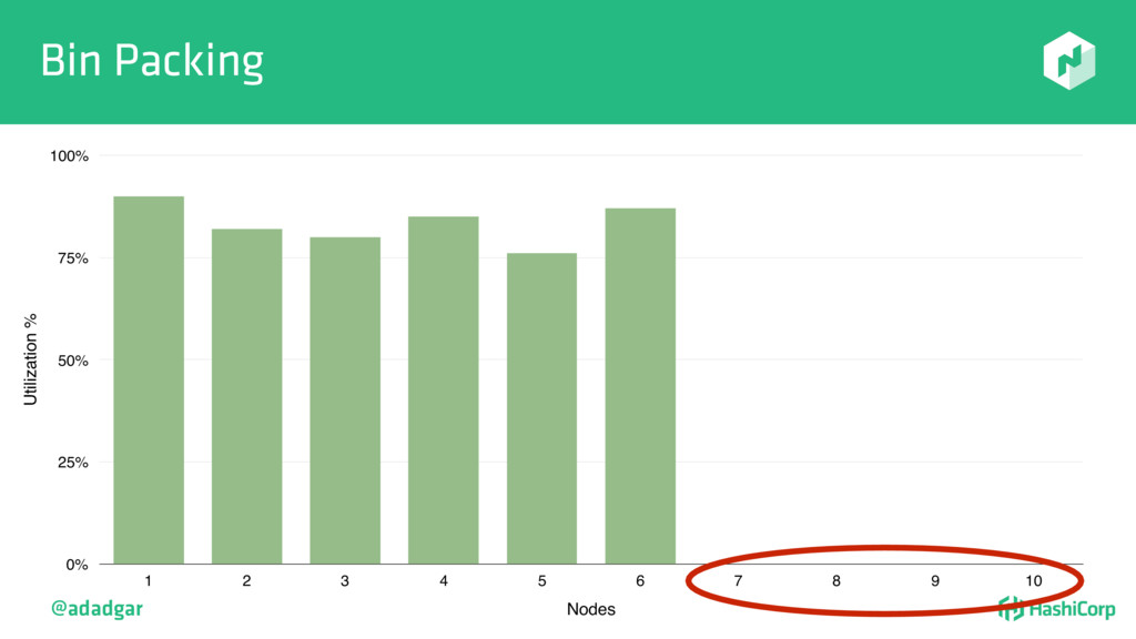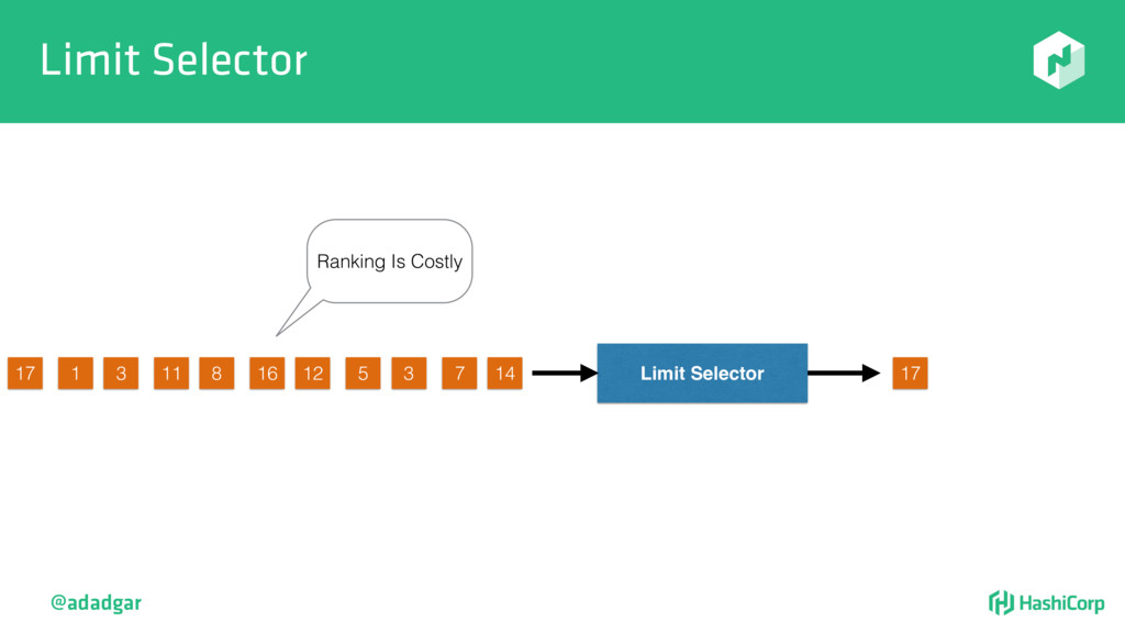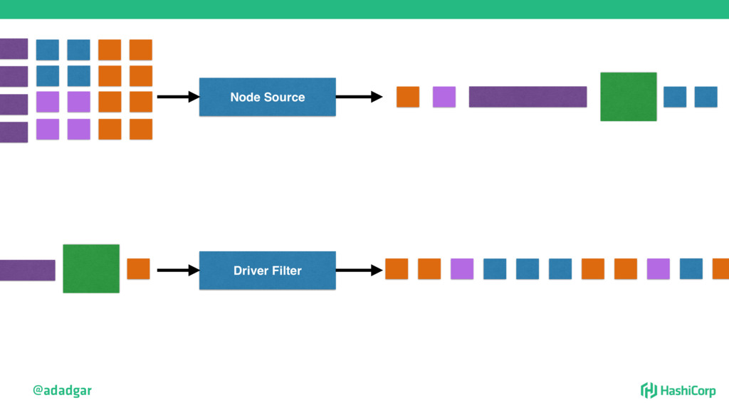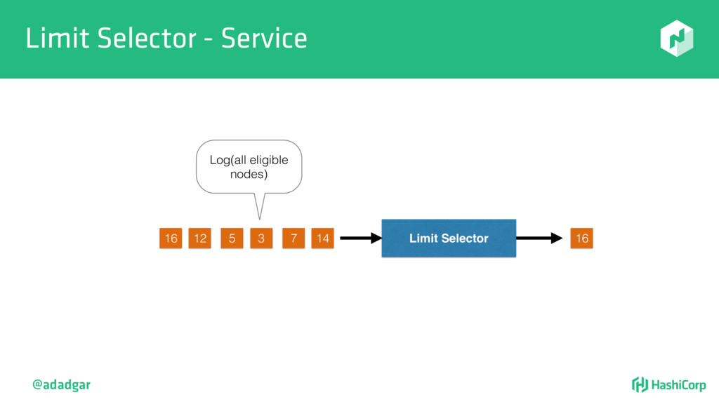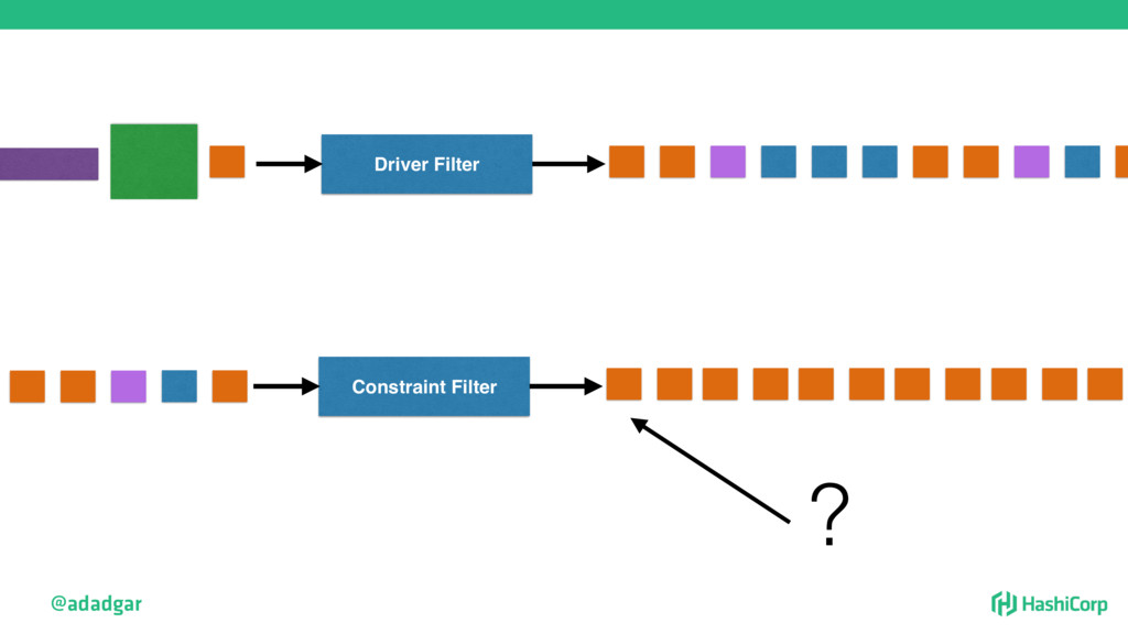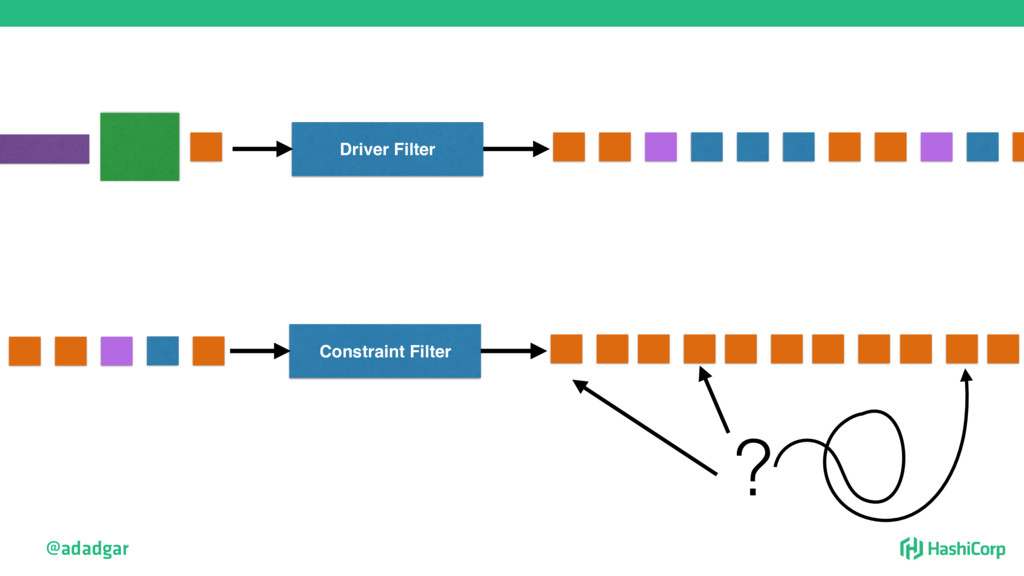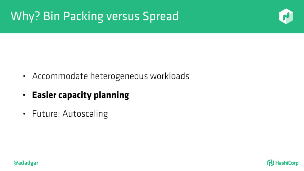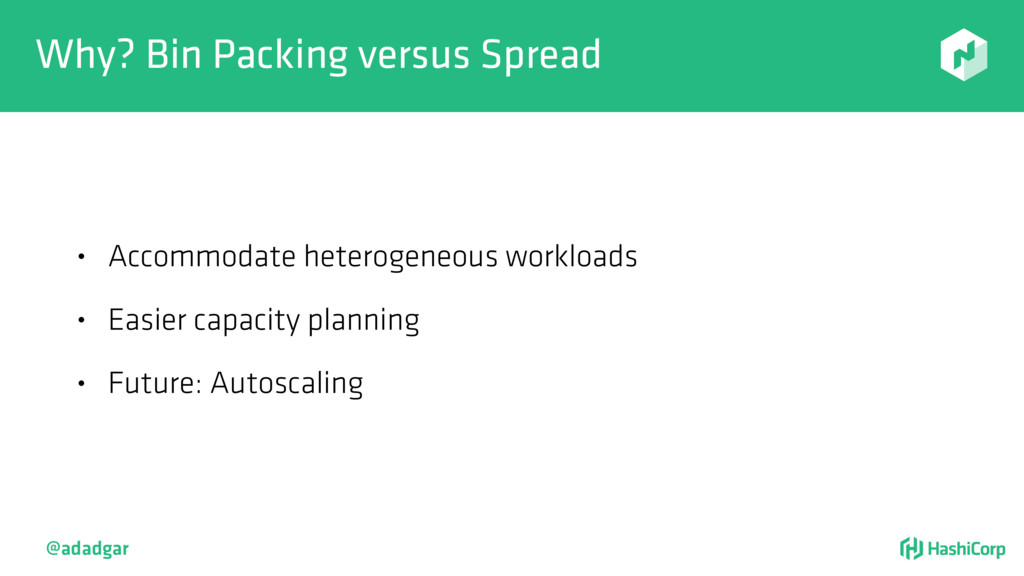 resources • Filtering step: Do already placed allocations + new allocation fit on node • Rank: Produce score between 0-18. • Score = 20 - 10^x - 10^y, where x is free CPU and y is free memory @adadgar