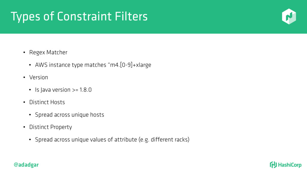 type matches “m4.[0-9]+xlarge • Version • Is Java version >= 1.8.0 • Distinct Hosts • Spread across unique hosts • Distinct Property • Spread across unique values of attribute (e.g. different racks) @adadgar