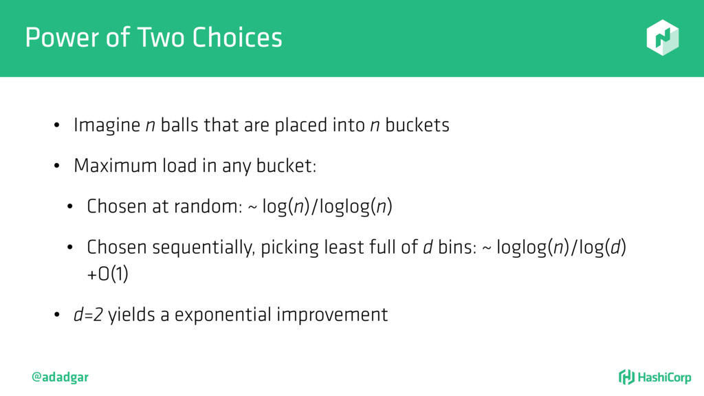 are placed into n buckets • Maximum load in any bucket: • Chosen at random: ~ log(n)/loglog(n) • Chosen sequentially, picking least full of d bins: ~ loglog(n)/log(d) +O(1) • d=2 yields a exponential improvement