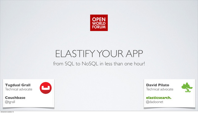 one hour! Tugdual Grall Technical advocate Couchbase @tgrall David Pilato Technical advocate elasticsearch. @dadoonet dimanche 6 octobre 13