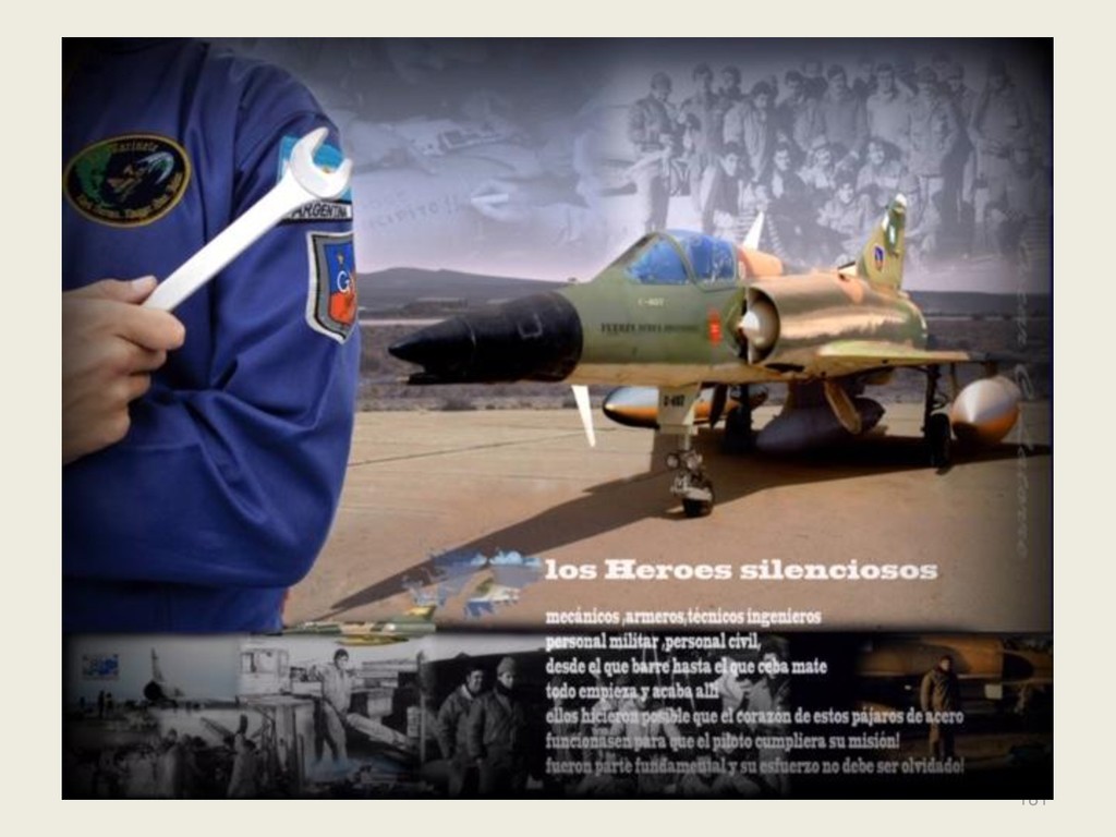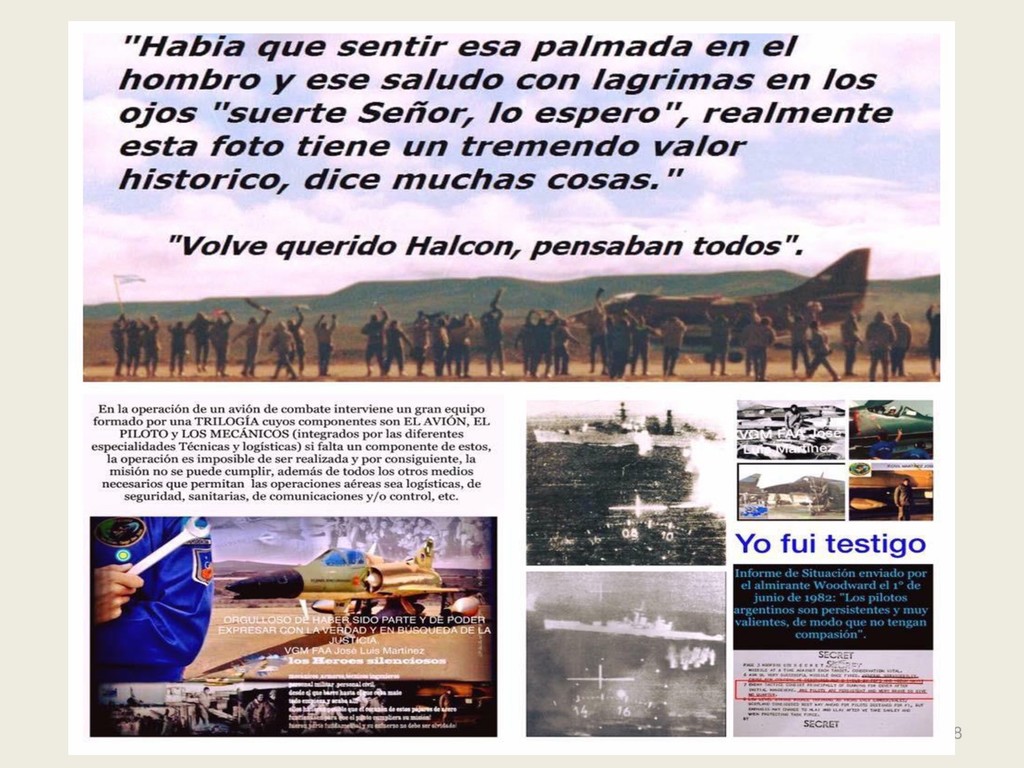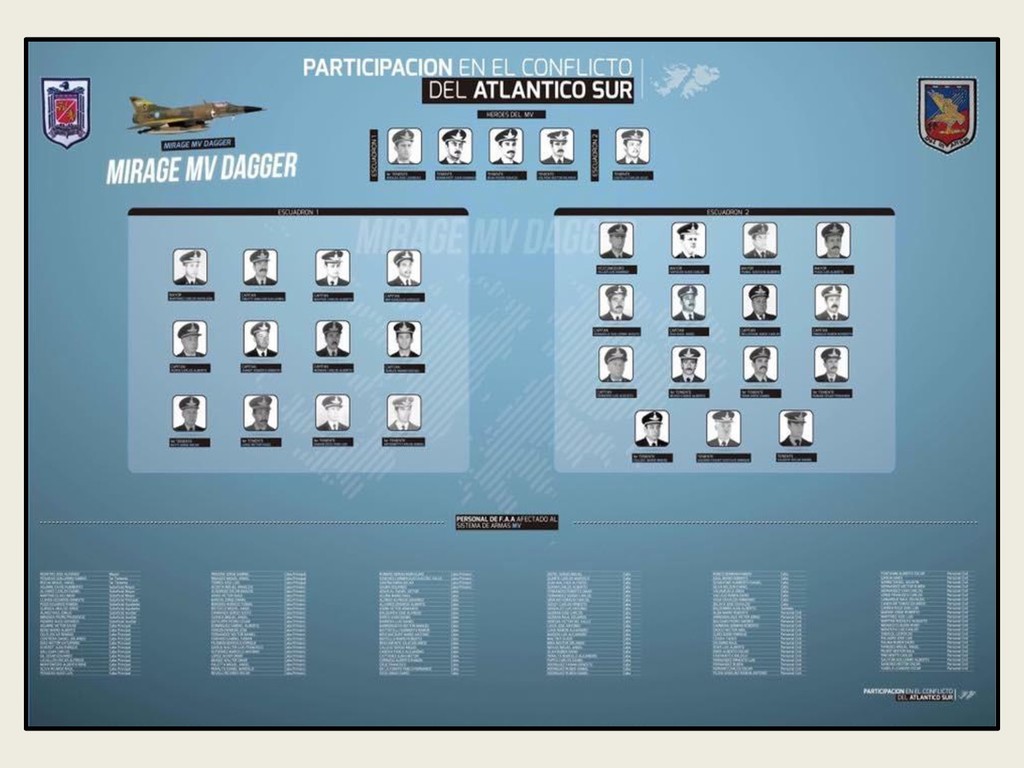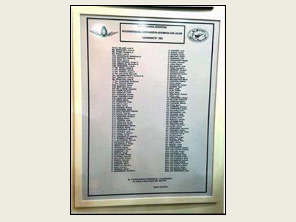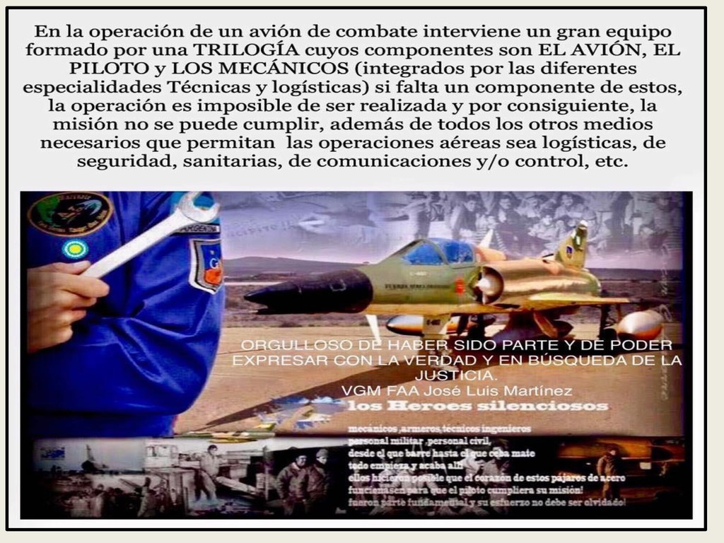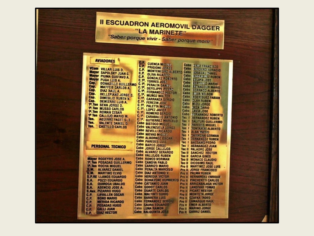Este grupo formado por oficiales, suboficiales, conscriptos o civiles, logró quedar en la historia de la Fuerza Aérea Argentina por su actuación y desempeño cuando la Patria lo necesitó, pudiendo decir cada uno de los integrantes: “yo estuve ahí, yo puedo contarlo”. Deseo hacer una referencia especial sobre el grupo de soldados que formaron parte de nuestro Escuadrón, ellos no solo cumplieron con su deber Militar (que era su deber como ciudadanos), sino que también demostraron que eran uno más de todos nosotros. Tanto por su aporte individual en las respectivas especialidades técnicas y operativas, en las cuales estaban destinados (armamento, equipo apoyo, etc), sino también su alto profesionalismo, demostrando siempre predisposición, gran colaboración y camaradería con todos nosotros.