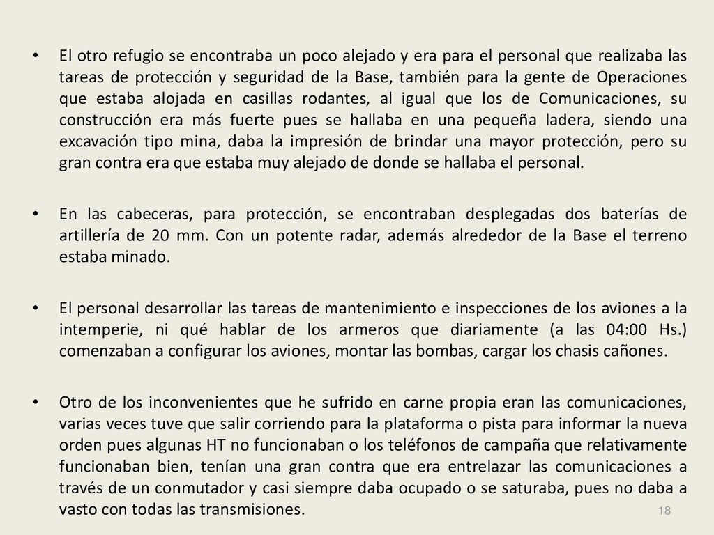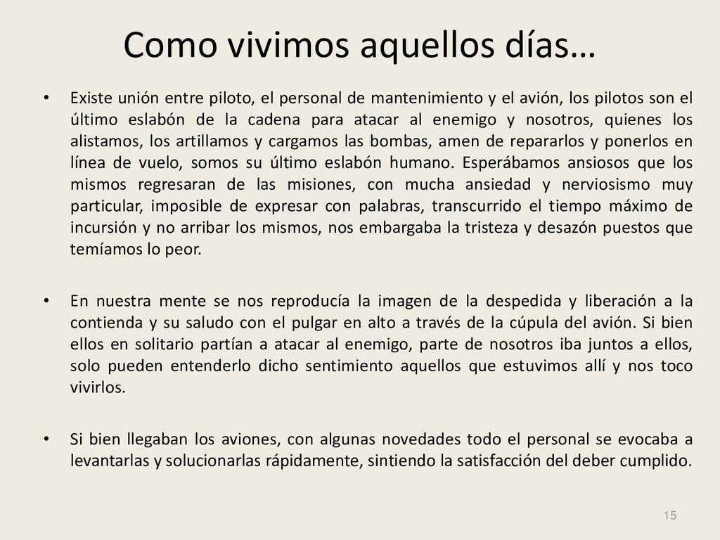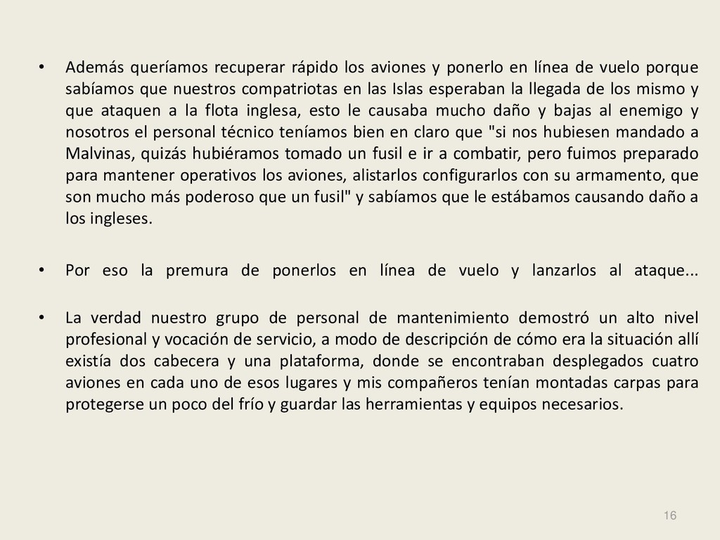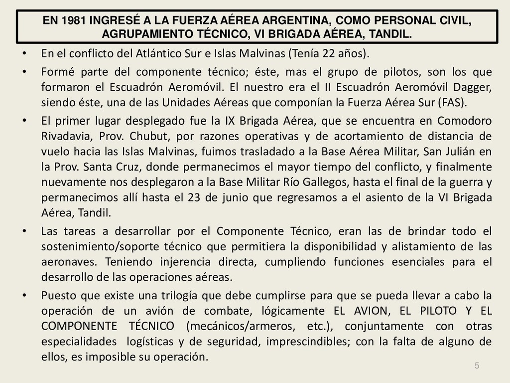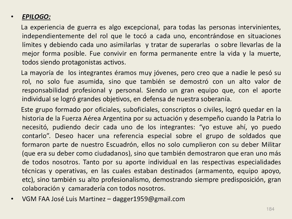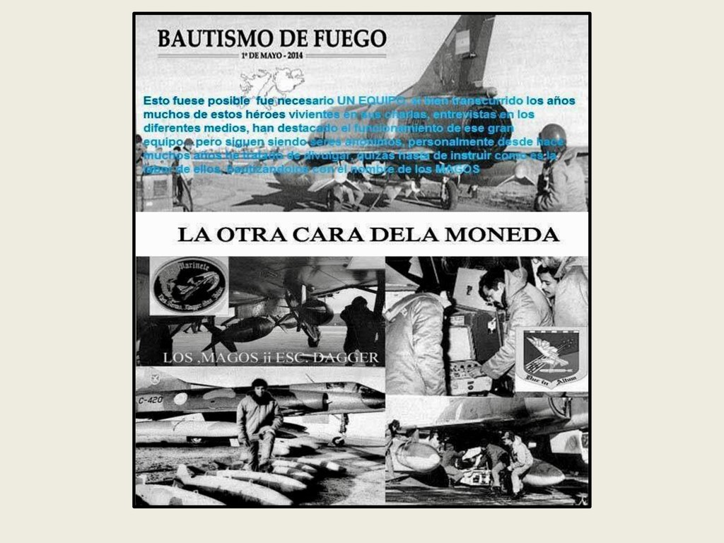 Este grupo formado por oficiales, suboficiales, conscriptos o civiles, logró quedar en la historia de la Fuerza Aérea Argentina por su actuación y desempeño cuando la Patria lo necesitó, pudiendo decir cada uno de los integrantes: “yo estuve ahí, yo puedo contarlo”. Deseo hacer una referencia especial sobre el grupo de soldados que formaron parte de nuestro Escuadrón, ellos no solo cumplieron con su deber Militar (que era su deber como ciudadanos), sino que también demostraron que eran uno más de todos nosotros. Tanto por su aporte individual en las respectivas especialidades técnicas y operativas, en las cuales estaban destinados (armamento, equipo apoyo, etc), sino también su alto profesionalismo, demostrando siempre predisposición, gran colaboración y camaradería con todos nosotros.