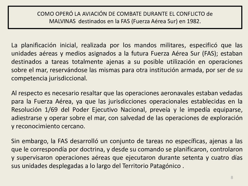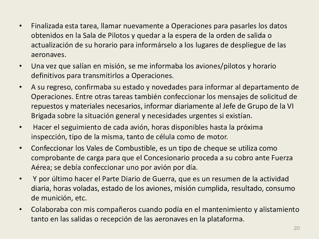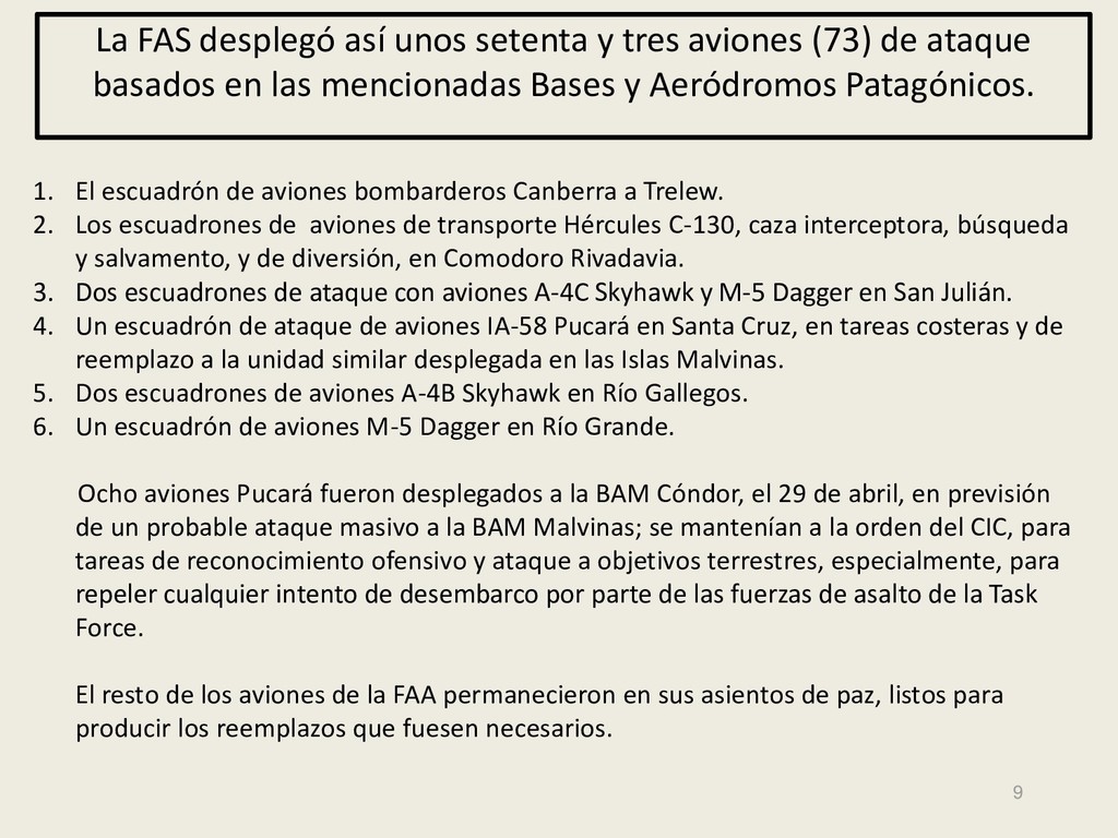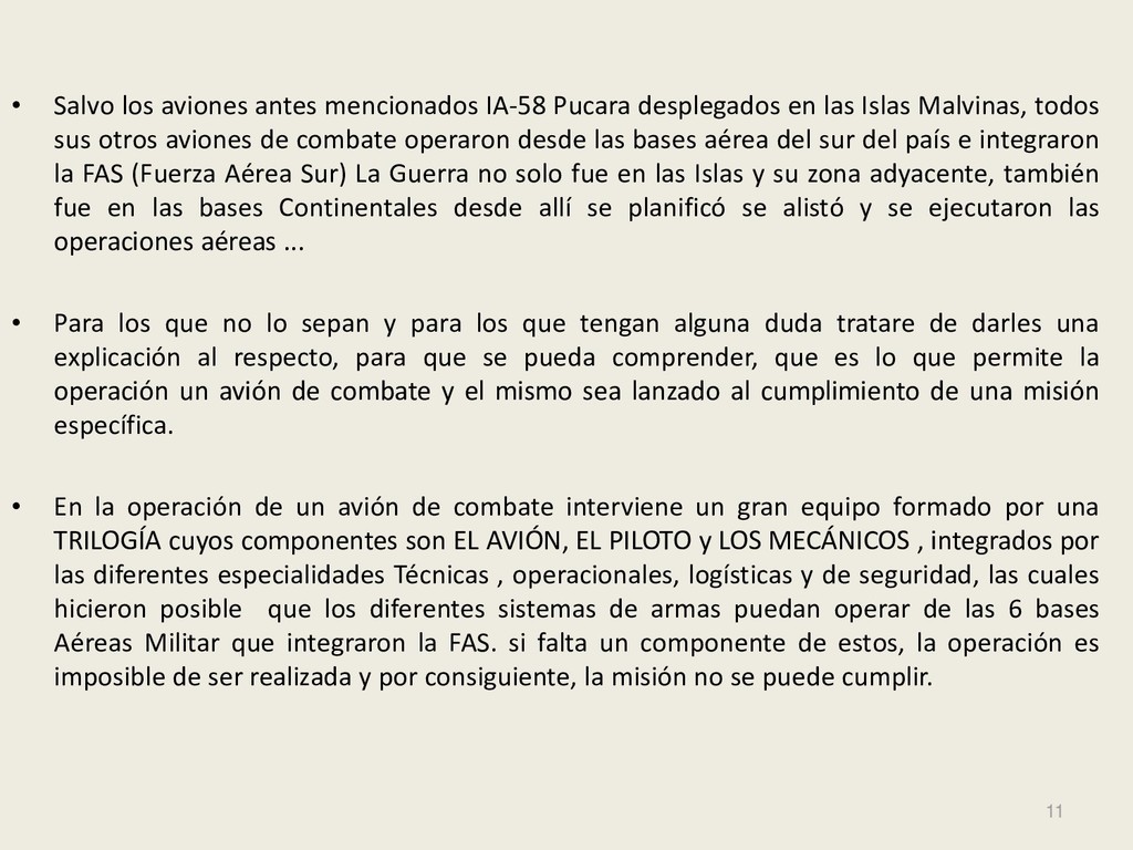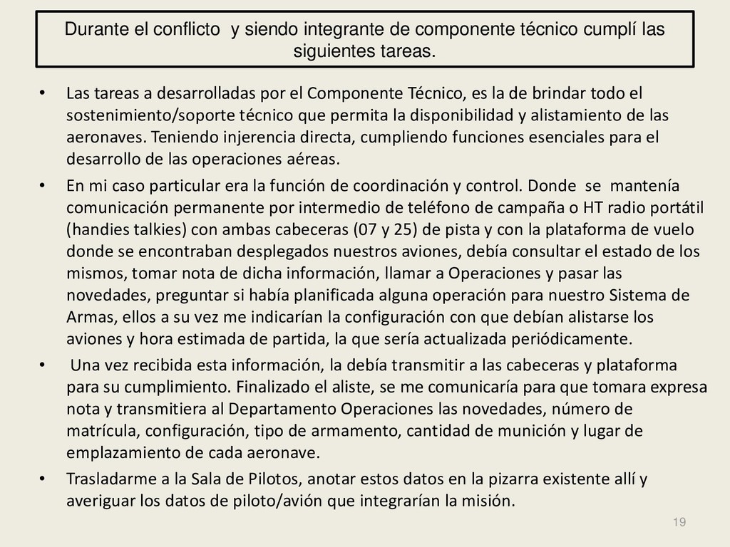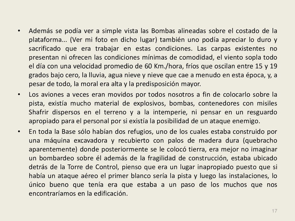 Este grupo formado por oficiales, suboficiales, conscriptos o civiles, logró quedar en la historia de la Fuerza Aérea Argentina por su actuación y desempeño cuando la Patria lo necesitó, pudiendo decir cada uno de los integrantes: “yo estuve ahí, yo puedo contarlo”. Deseo hacer una referencia especial sobre el grupo de soldados que formaron parte de nuestro Escuadrón, ellos no solo cumplieron con su deber Militar (que era su deber como ciudadanos), sino que también demostraron que eran uno más de todos nosotros. Tanto por su aporte individual en las respectivas especialidades técnicas y operativas, en las cuales estaban destinados (armamento, equipo apoyo, etc), sino también su alto profesionalismo, demostrando siempre predisposición, gran colaboración y camaradería con todos nosotros.