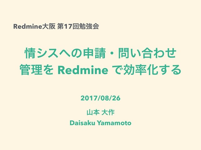 Redmineେࡕ ୈ17ճษڧձ γεͷਃɾ͍߹Θͤ ཧΛ Redmine ͰޮԽ͢Δ 2017/08/26 ࢁຊ େ࡞ Daisaku