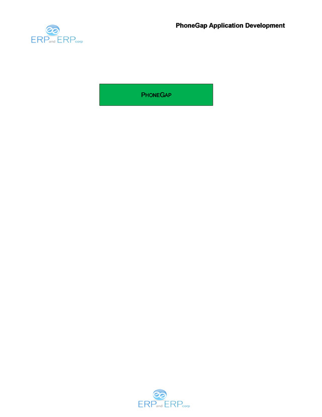 USINESS R R R REQUIREMENTS EQUIREMENTS EQUIREMENTS EQUIREMENTS D D D DOCUMENT OCUMENT OCUMENT OCUMENT © 2012 ERPandERP. All rights reserved. Page 11 Deploy Deploy Deploy Deploy to to to to Simulator Simulator Simulator Simulator Right click the project and go to Run As > Android Application Eclipse will ask you to select an appropriate AVD. If there isn't one, then you'll need to create it. That was a very simple Hello World application. And there are no native features involved. PhoneGap provides a list of JavaScript API’s which allows your app to interact with the nature device features. Apache Cordova Documentation (http://docs.phonegap.com/en/2.0.0/index.html) provides details guidelines/reference on how to use these API’s, supported platform and quirks (if any). PhoneGap provides API’s for the following features Accelerometer, Camera, Capture, Compass, Connection, Contacts, Device, Events, File, Geolocation, Media, Notification, Storage 6 6 6 6. . . . Building Building Building Building app app app app with with with with PhoneGap PhoneGap PhoneGap PhoneGap Build Build Build Build Cloud Cloud Cloud Cloud Service Service Service Service Say goodbye to SDKs, compilers and hardware. Simply write your app using HTML, CSS or JavaScript, upload it to the PhoneGap Build service and get back app-store ready apps for Apple iOS, Google Android, Windows Phone 7, Palm, Symbian, BlackBerry and more. You will need a github or an Adobe account for using PhoneGap Build service.