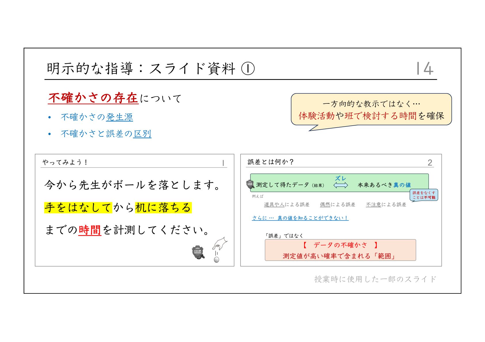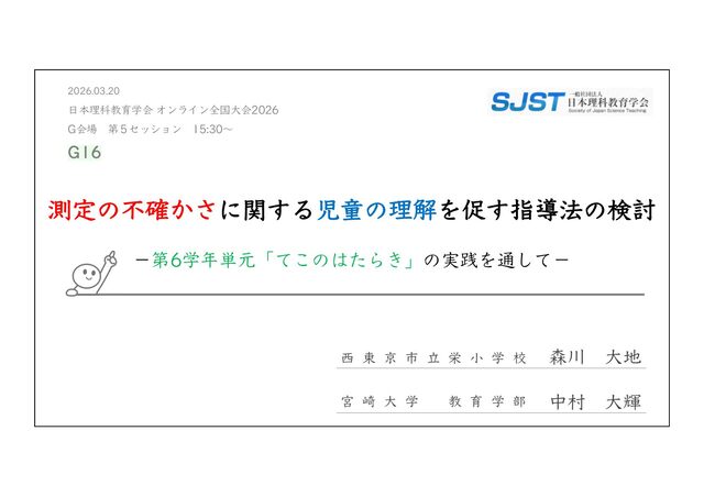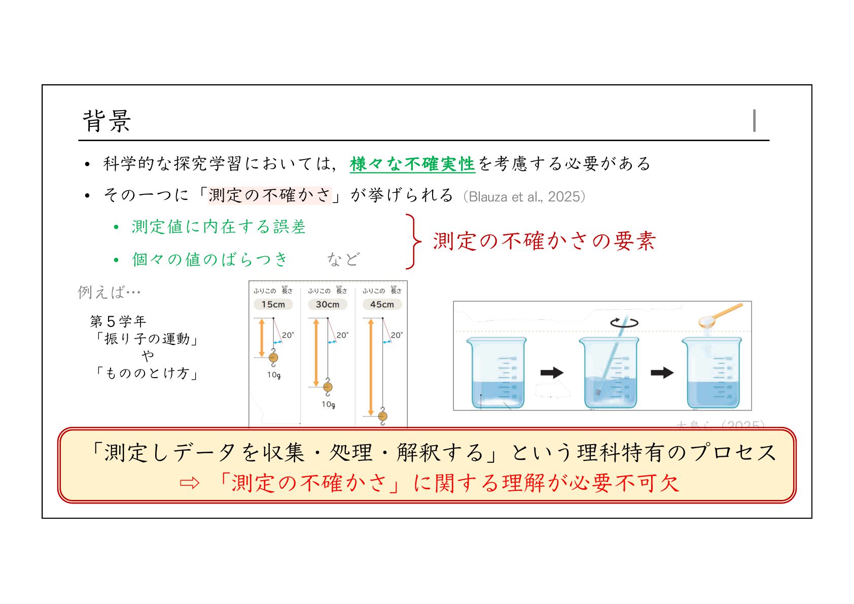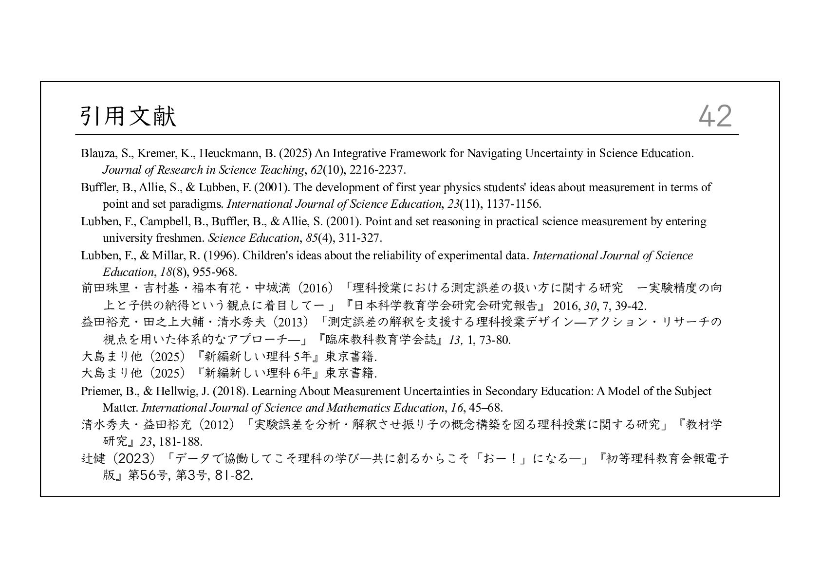 Integrative Framework for Navigating Uncertainty in Science Education. Journal of Research in Science Teaching, 62(10), 2216-2237. Buffler, B., Allie, S., & Lubben, F. (2001). The development of first year physics students' ideas about measurement in terms of point and set paradigms. International Journal of Science Education, 23(11), 1137-1156. Lubben, F., Campbell, B., Buffler, B., & Allie, S. (2001). Point and set reasoning in practical science measurement by entering university freshmen. Science Education, 85(4), 311-327. Lubben, F., & Millar, R. (1996). Children's ideas about the reliability of experimental data. International Journal of Science Education, 18(8), 955-968. 前⽥珠⾥・吉村基・福本有花・中城満(2016)「理科授業における測定誤差の扱い⽅に関する研究 ー実験精度の向 上と⼦供の納得という観点に着⽬してー 」『⽇本科学教育学会研究会研究報告』 2016, 30, 7, 39-42. 益⽥裕充・⽥之上⼤輔・清⽔秀夫(2013)「測定誤差の解釈を⽀援する理科授業デザイン―アクション・リサーチの 視点を⽤いた体系的なアプローチ―」『臨床教科教育学会誌』13, 1, 73-80. ⼤島まり他(2025)『新編新しい理科 5年』東京書籍. ⼤島まり他(2025)『新編新しい理科 6年』東京書籍. Priemer, B., & Hellwig, J. (2018). Learning About Measurement Uncertainties in Secondary Education: A Model of the Subject Matter. International Journal of Science and Mathematics Education, 16, 45–68. 清⽔秀夫・益⽥裕充(2012)「実験誤差を分析・解釈させ振り⼦の概念構築を図る理科授業に関する研究」『教材学 研究』23, 181-188. 辻健(2023)「データで協働してこそ理科の学び―共に創るからこそ「おー!」になる―」『初等理科教育会報電⼦ 版』第56号, 第3号, 81-82.