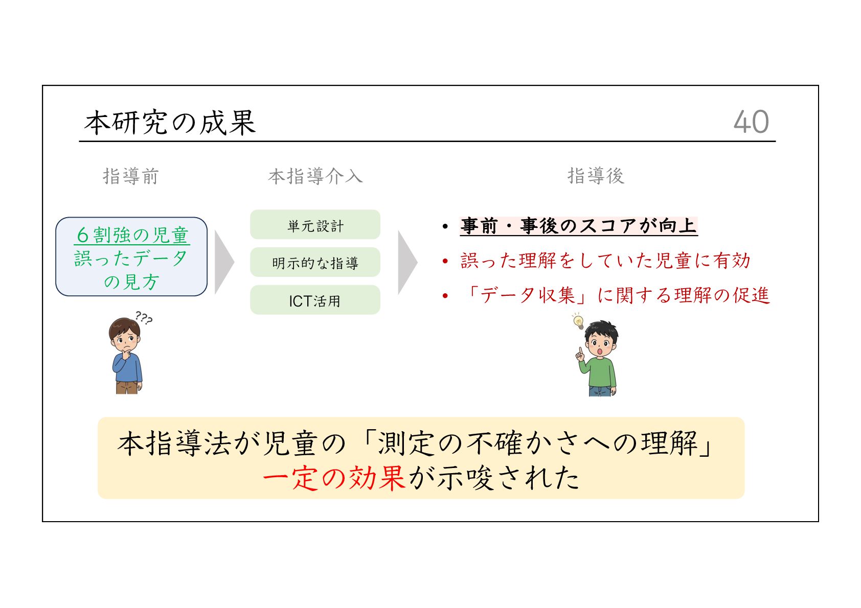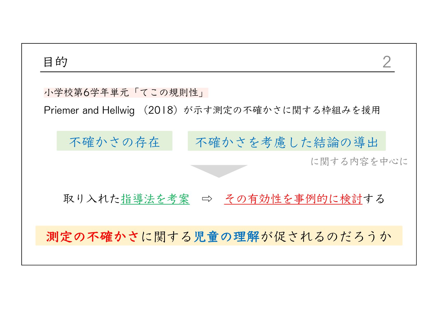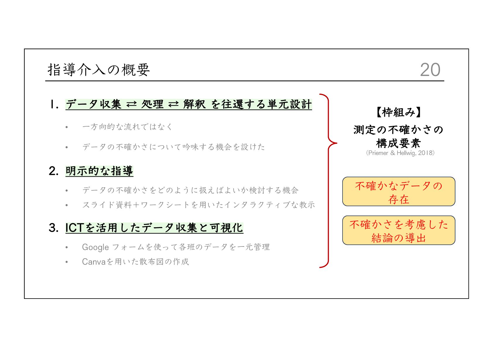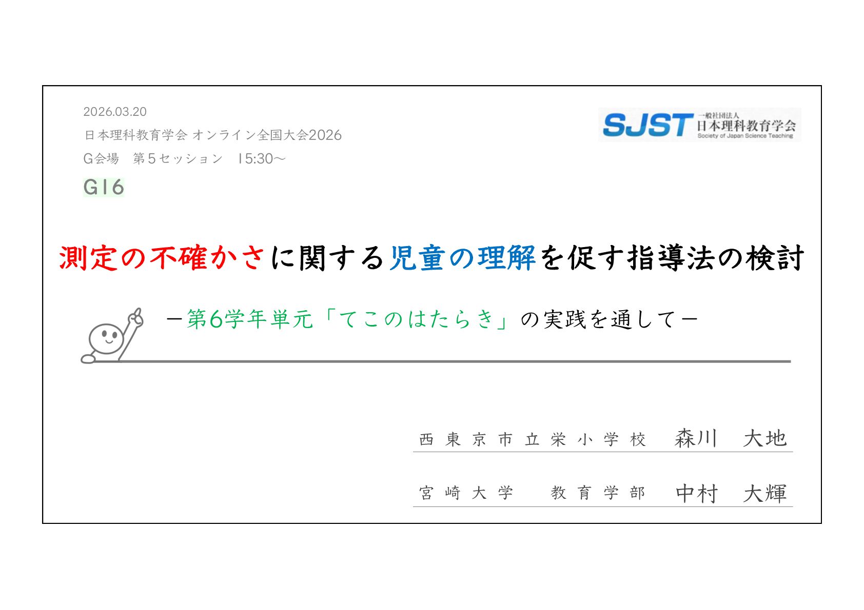 Integrative Framework for Navigating Uncertainty in Science Education. Journal of Research in Science Teaching, 62(10), 2216-2237. Buffler, B., Allie, S., & Lubben, F. (2001). The development of first year physics students' ideas about measurement in terms of point and set paradigms. International Journal of Science Education, 23(11), 1137-1156. Lubben, F., Campbell, B., Buffler, B., & Allie, S. (2001). Point and set reasoning in practical science measurement by entering university freshmen. Science Education, 85(4), 311-327. Lubben, F., & Millar, R. (1996). Children's ideas about the reliability of experimental data. International Journal of Science Education, 18(8), 955-968. 前⽥珠⾥・吉村基・福本有花・中城満(2016)「理科授業における測定誤差の扱い⽅に関する研究 ー実験精度の向 上と⼦供の納得という観点に着⽬してー 」『⽇本科学教育学会研究会研究報告』 2016, 30, 7, 39-42. 益⽥裕充・⽥之上⼤輔・清⽔秀夫(2013)「測定誤差の解釈を⽀援する理科授業デザイン―アクション・リサーチの 視点を⽤いた体系的なアプローチ―」『臨床教科教育学会誌』13, 1, 73-80. ⼤島まり他(2025)『新編新しい理科 5年』東京書籍. ⼤島まり他(2025)『新編新しい理科 6年』東京書籍. Priemer, B., & Hellwig, J. (2018). Learning About Measurement Uncertainties in Secondary Education: A Model of the Subject Matter. International Journal of Science and Mathematics Education, 16, 45–68. 清⽔秀夫・益⽥裕充(2012)「実験誤差を分析・解釈させ振り⼦の概念構築を図る理科授業に関する研究」『教材学 研究』23, 181-188. 辻健(2023)「データで協働してこそ理科の学び―共に創るからこそ「おー!」になる―」『初等理科教育会報電⼦ 版』第56号, 第3号, 81-82.