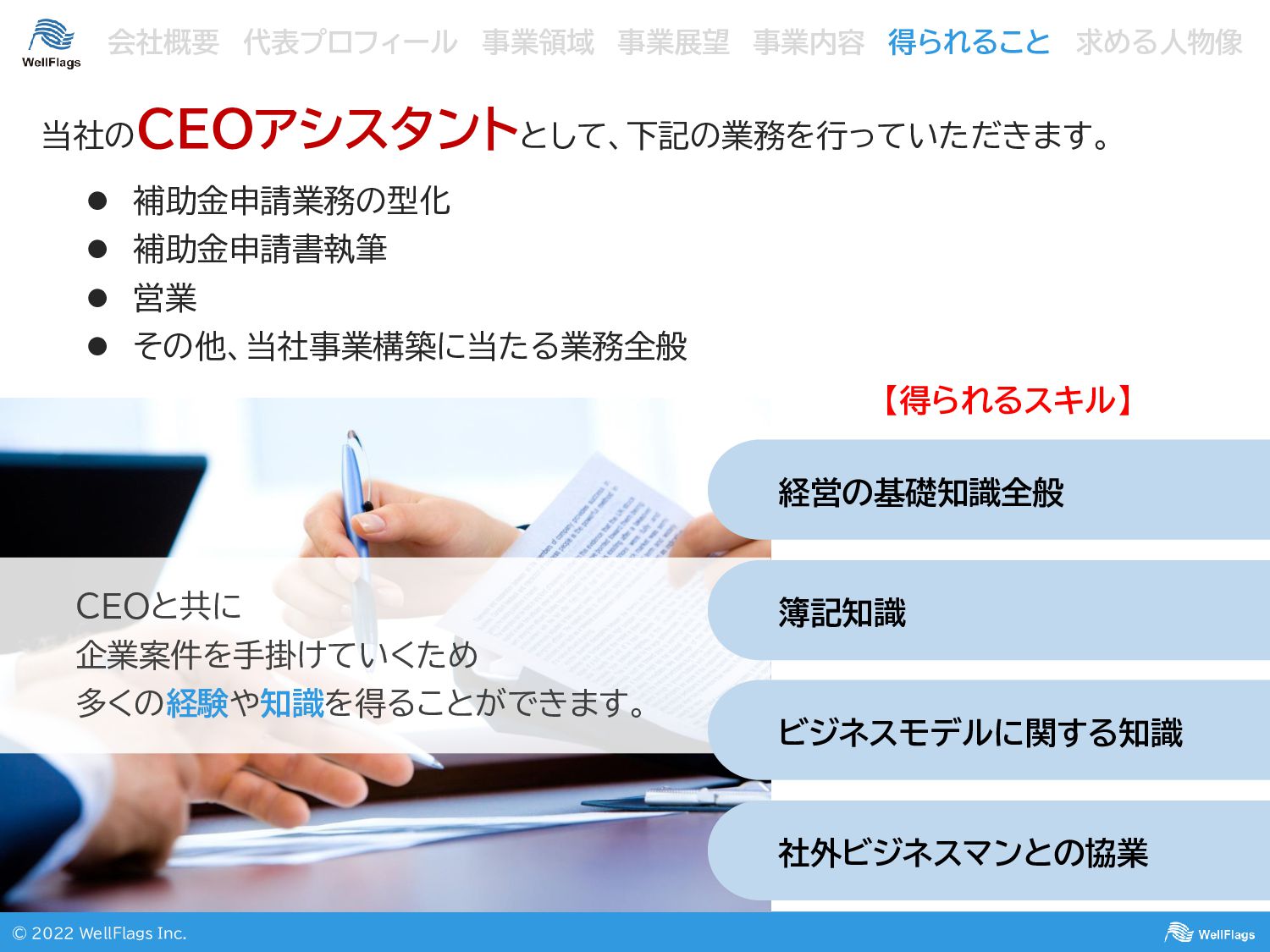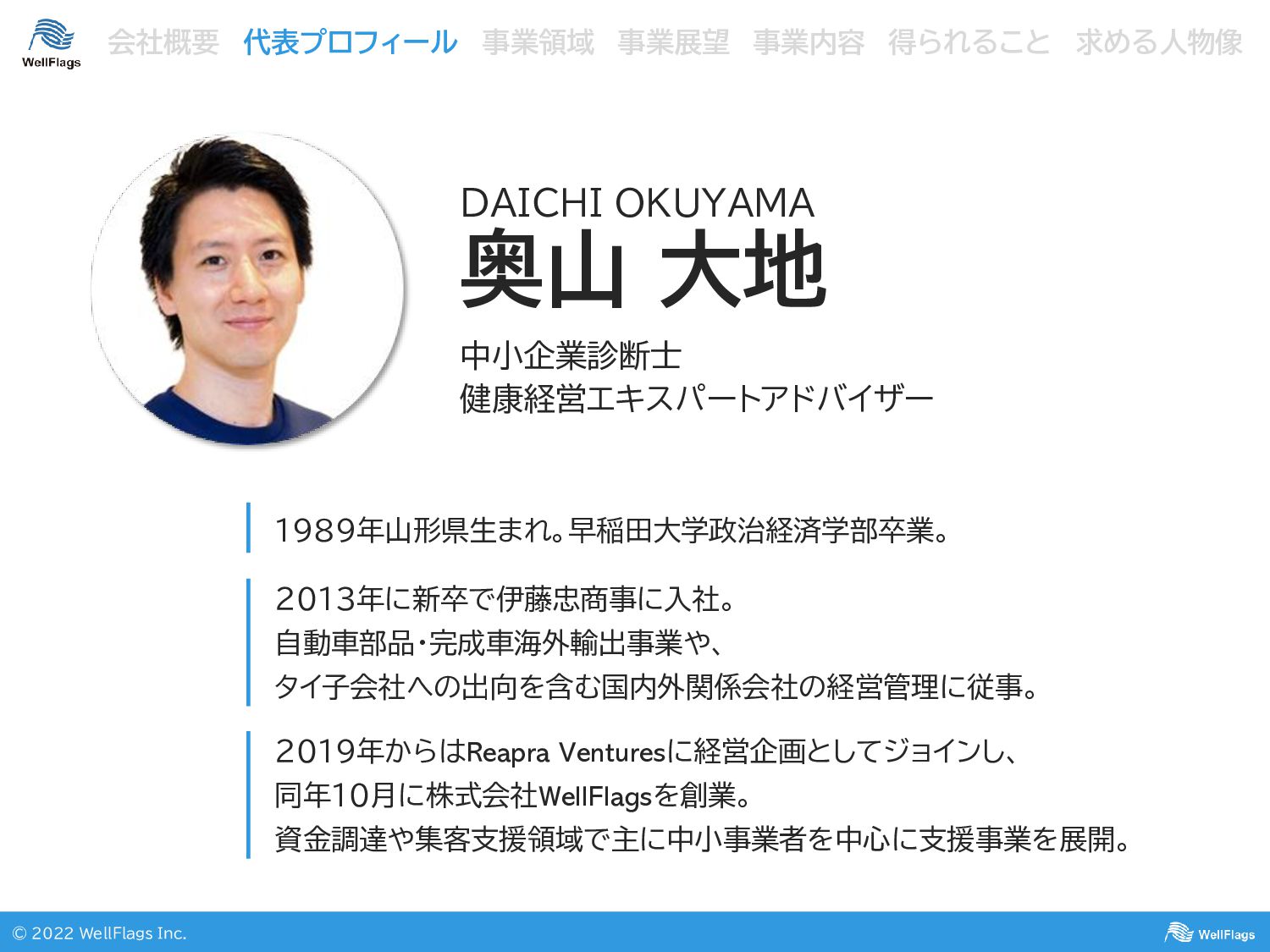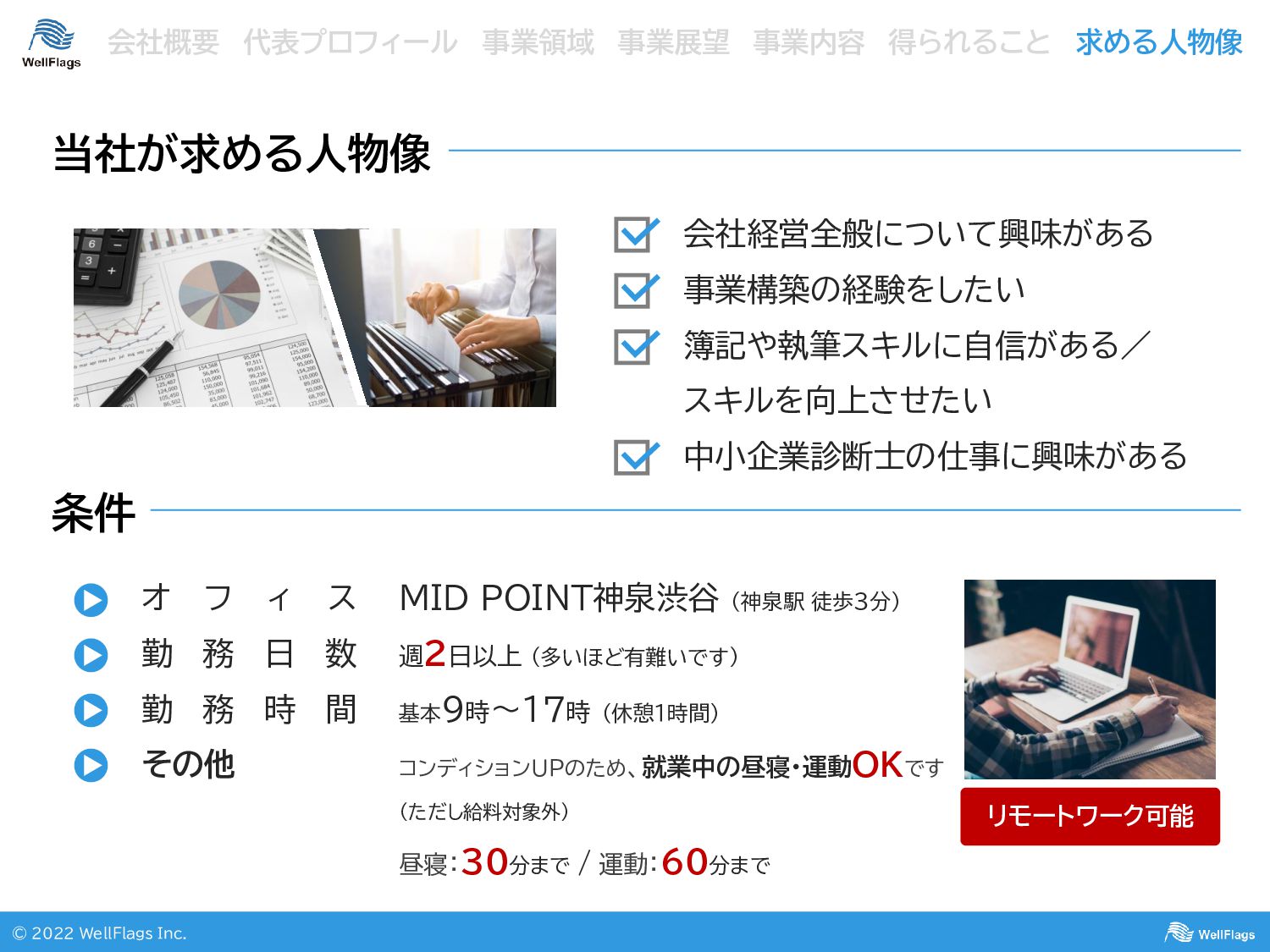 勤 務 日 数 勤 務 時 間 その他__ MID POINT神泉渋谷 (神泉駅 徒歩3分) 週2日以上 (多いほど有難いです) 基本9時~17時 (休憩1時間) コンディションUPのため、就業中の昼寝・運動OKです (ただし給料対象外) 昼寝:30分まで / 運動:60分まで 会社概要 代表プロフィール 事業領域 事業内容 得られること 求める人物像 会社経営全般について興味がある 事業構築の経験をしたい 簿記や執筆スキルに自信がある/ スキルを向上させたい 中小企業診断士の仕事に興味がある リモートワーク可能 事業展望