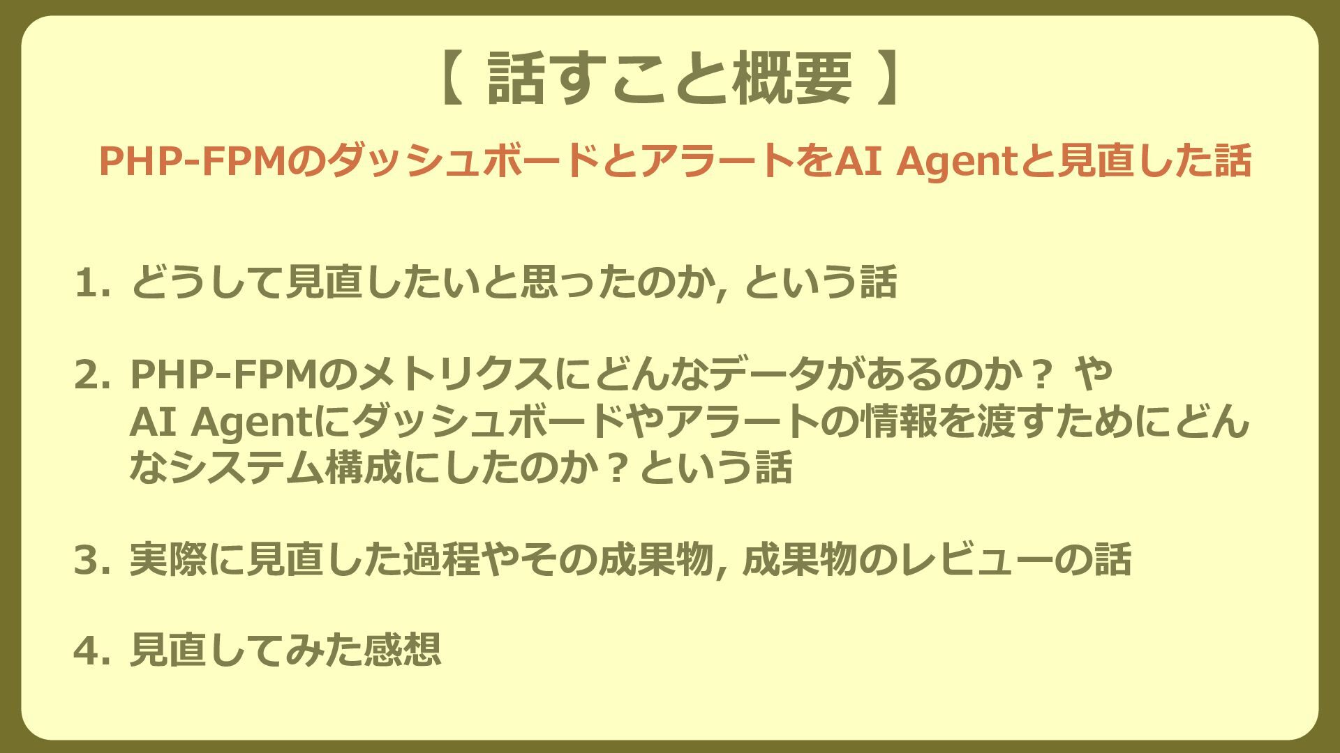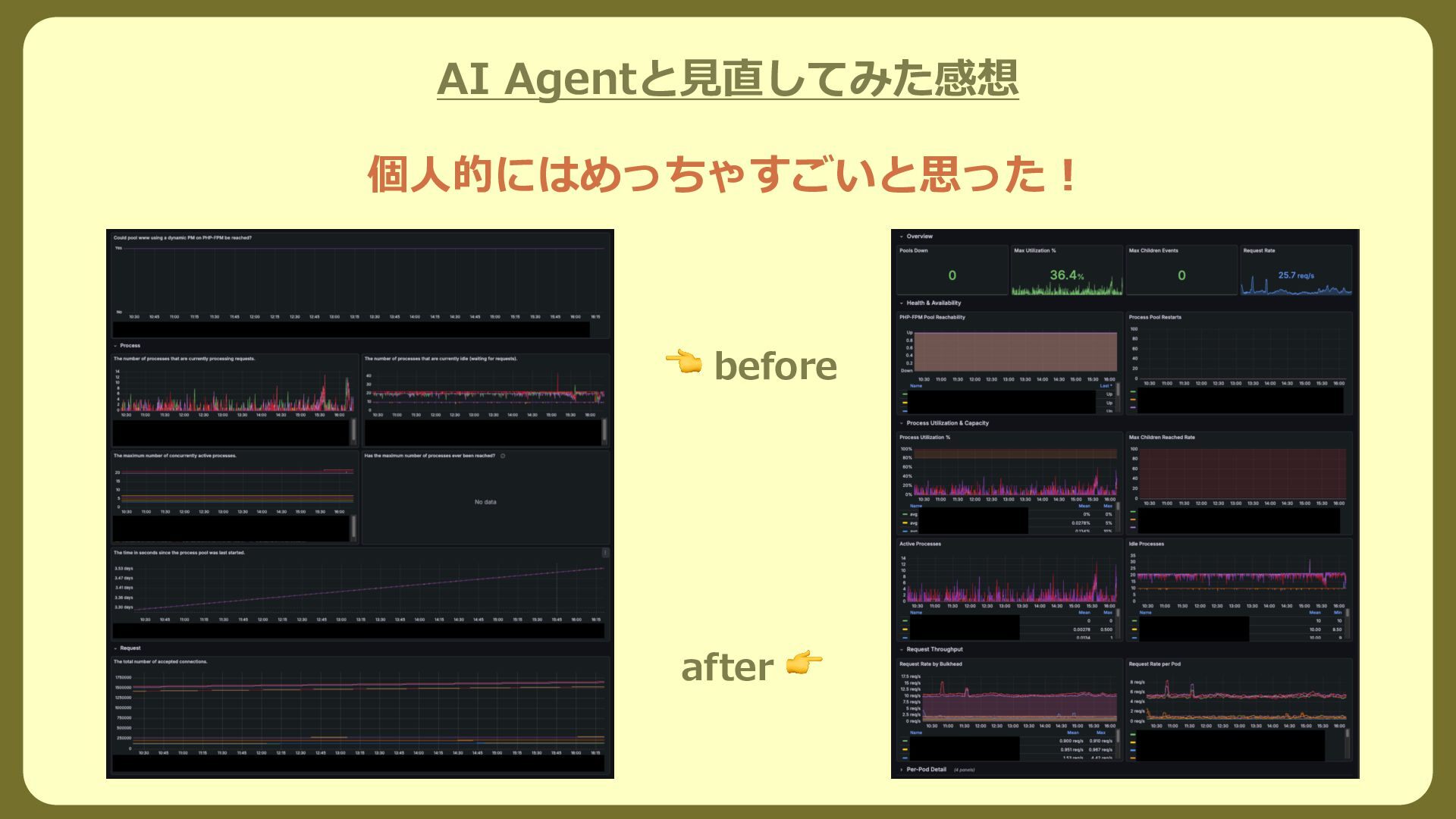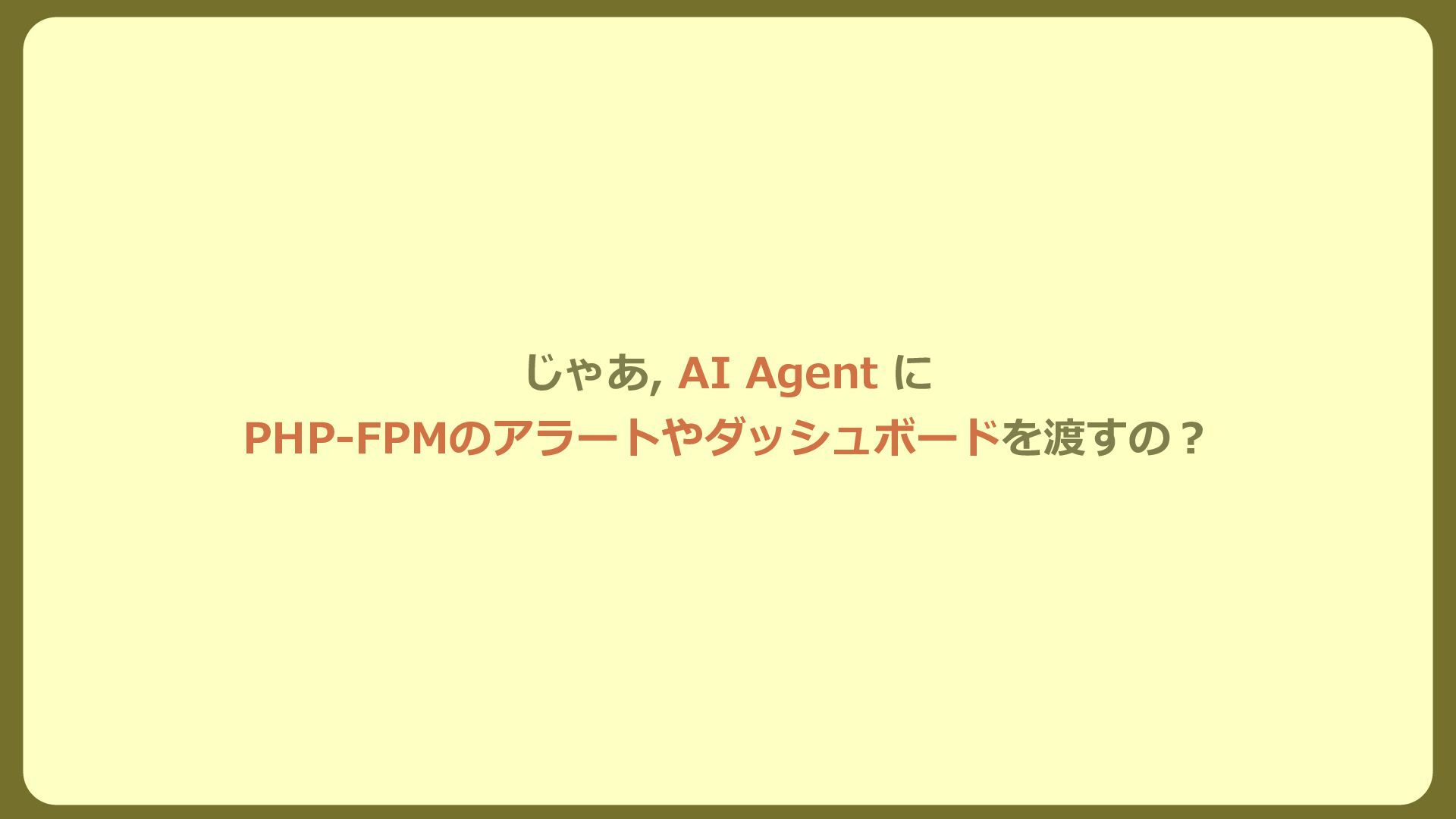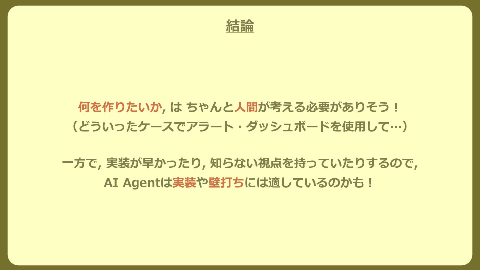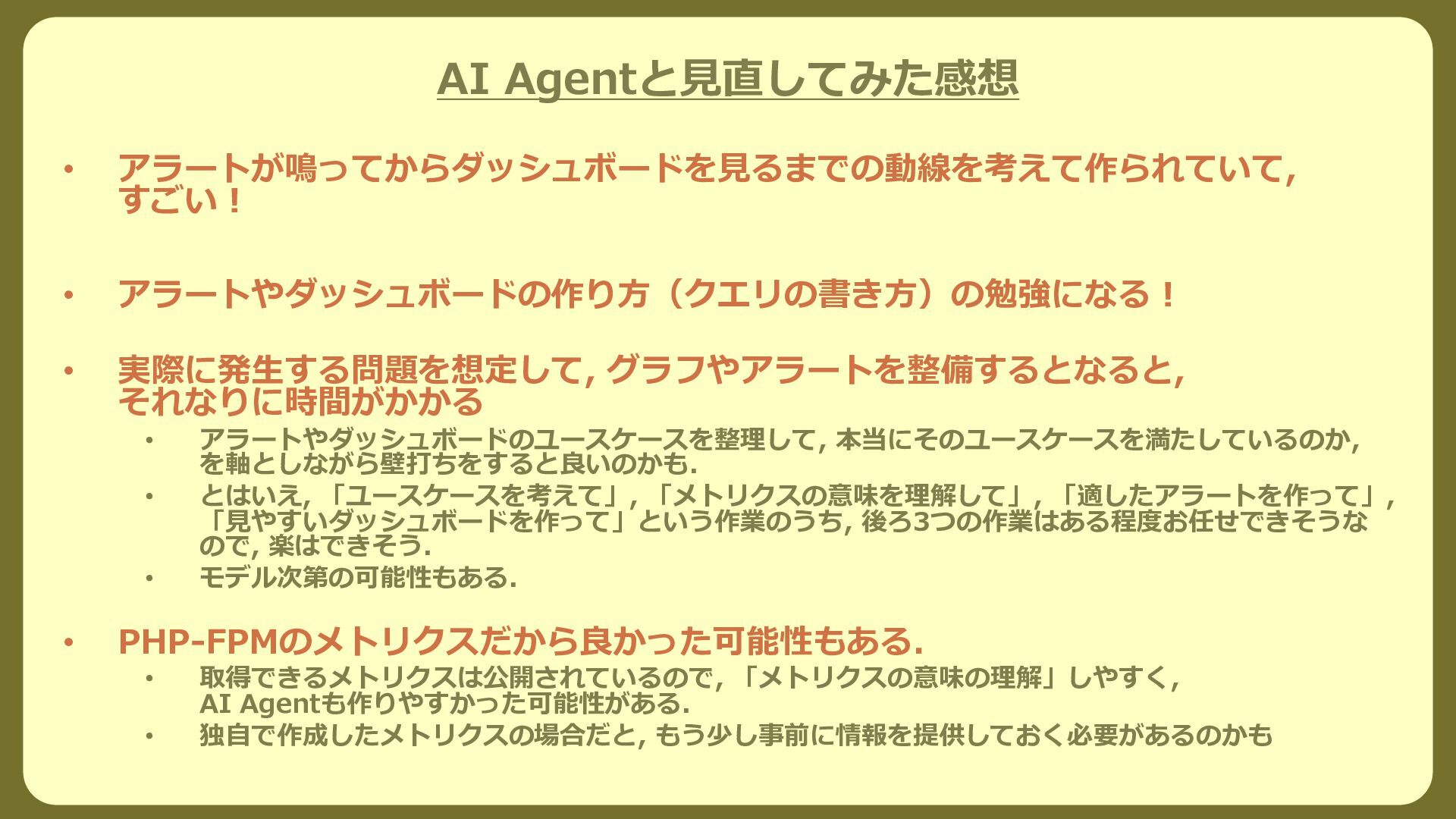それなりに時間がかかる • アラートやダッシュボードのユースケースを整理して, 本当にそのユースケースを満たしているのか, を軸としながら壁打ちをすると良いのかも. • とはいえ, 「ユースケースを考えて」, 「メトリクスの意味を理解して」, 「適したアラートを作って」, 「⾒やすいダッシュボードを作って」という作業のうち, 後ろ3つの作業はある程度お任せできそうな ので, 楽はできそう. • モデル次第の可能性もある. • PHP-FPMのメトリクスだから良かった可能性もある. • 取得できるメトリクスは公開されているので, 「メトリクスの意味の理解」しやすく, AI Agentも作りやすかった可能性がある. • 独⾃で作成したメトリクスの場合だと, もう少し事前に情報を提供しておく必要があるのかも