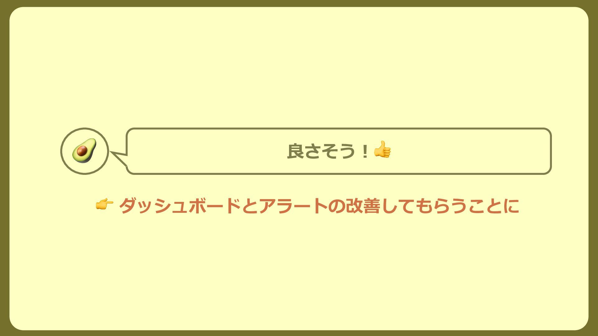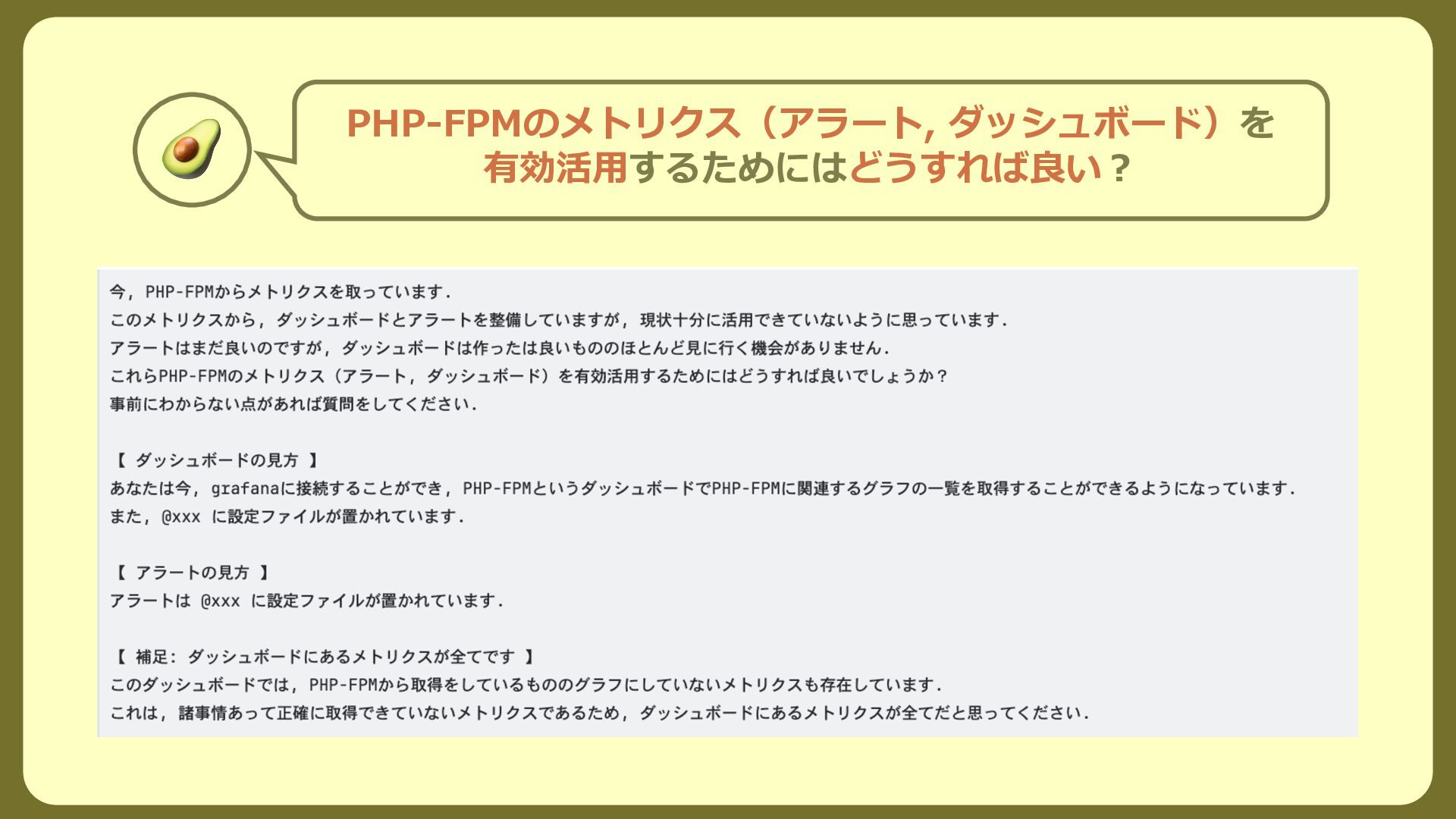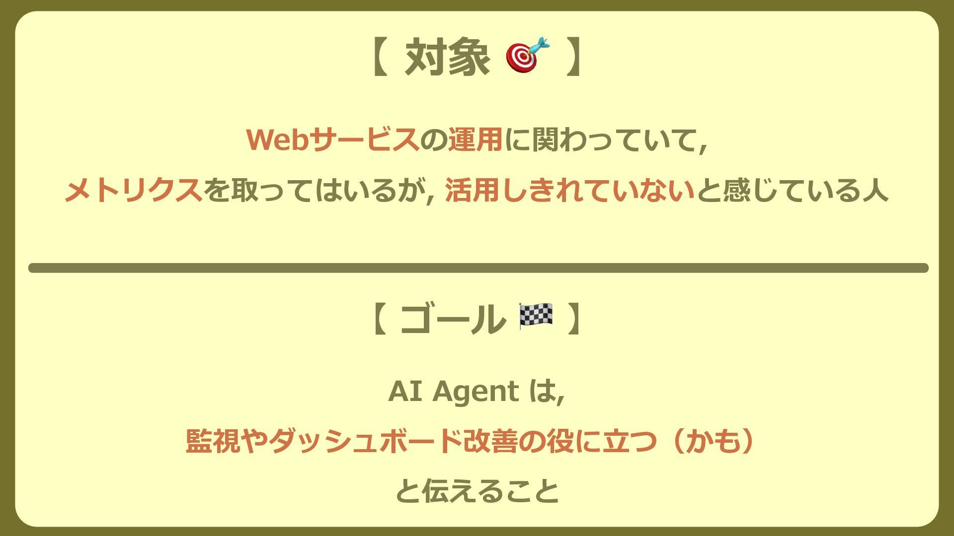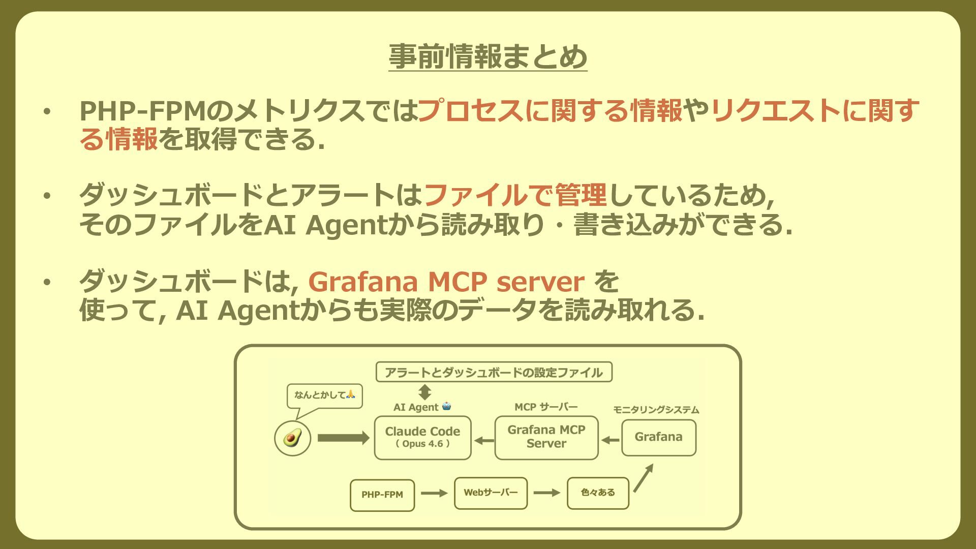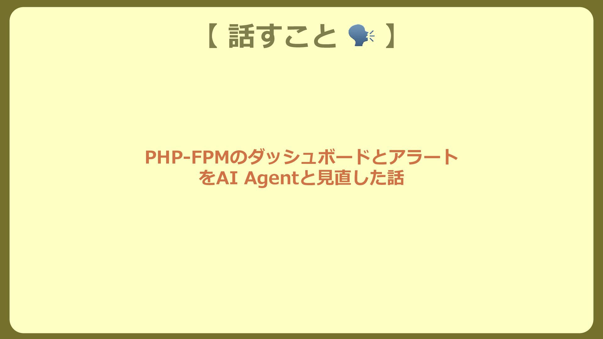 それなりに時間がかかる • アラートやダッシュボードのユースケースを整理して, 本当にそのユースケースを満たしているのか, を軸としながら壁打ちをすると良いのかも. • とはいえ, 「ユースケースを考えて」, 「メトリクスの意味を理解して」, 「適したアラートを作って」, 「⾒やすいダッシュボードを作って」という作業のうち, 後ろ3つの作業はある程度お任せできそうな ので, 楽はできそう. • モデル次第の可能性もある. • PHP-FPMのメトリクスだから良かった可能性もある. • 取得できるメトリクスは公開されているので, 「メトリクスの意味の理解」しやすく, AI Agentも作りやすかった可能性がある. • 独⾃で作成したメトリクスの場合だと, もう少し事前に情報を提供しておく必要があるのかも