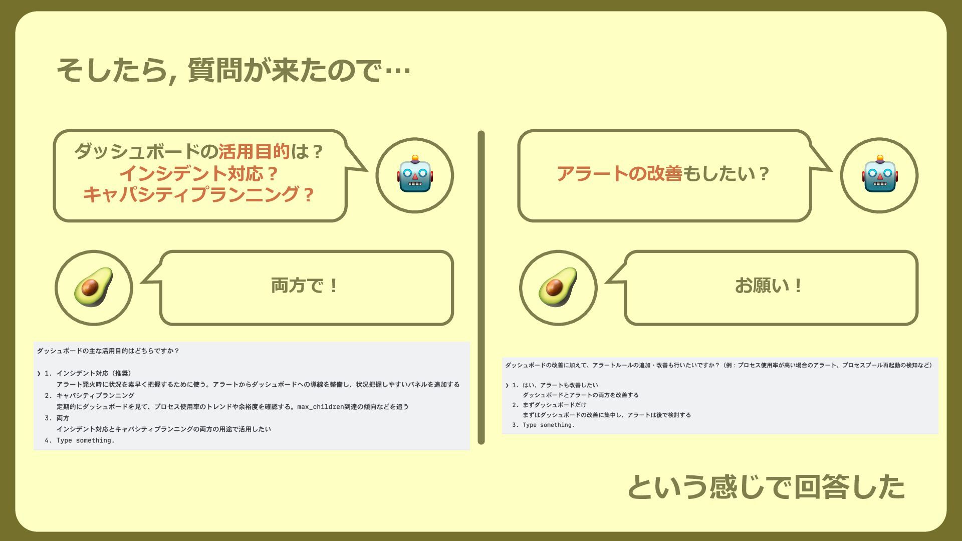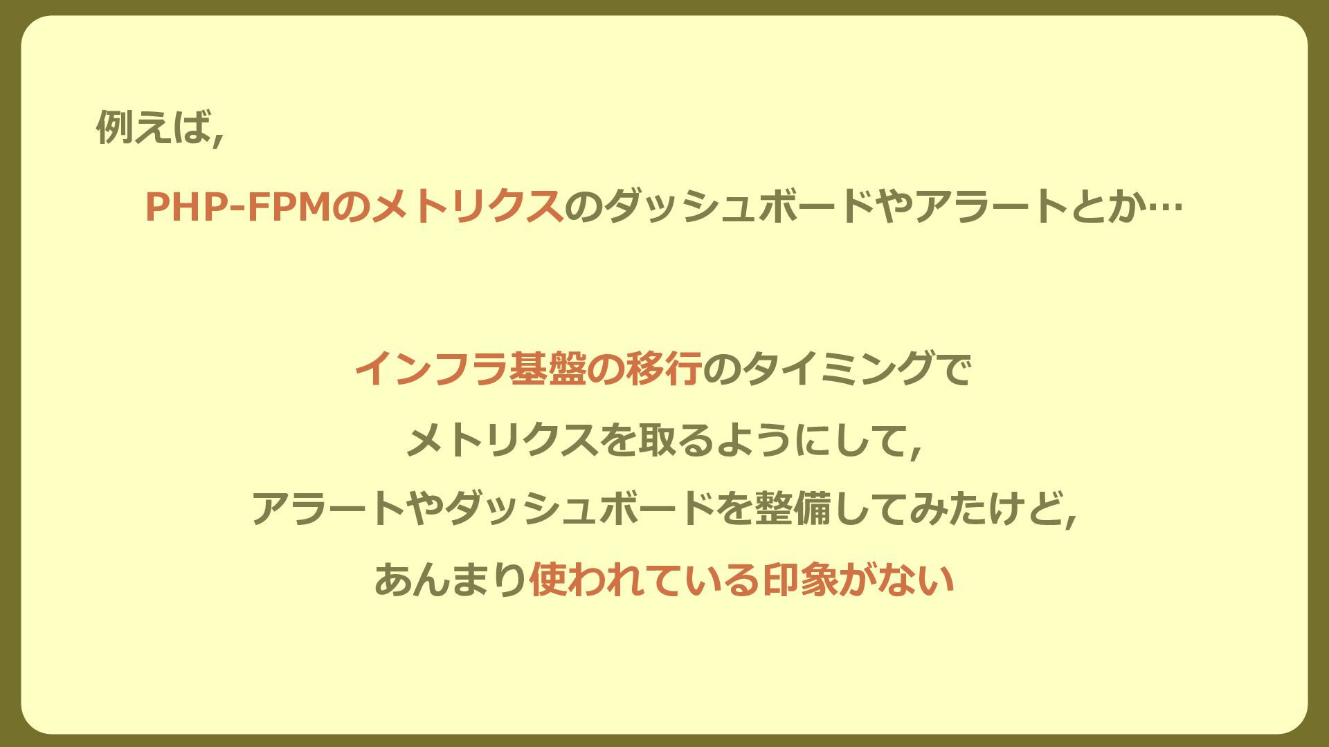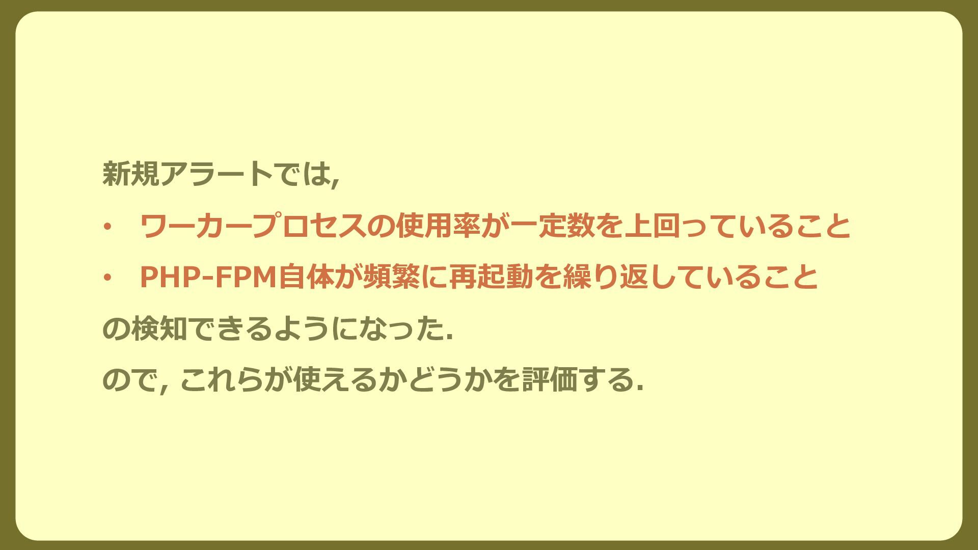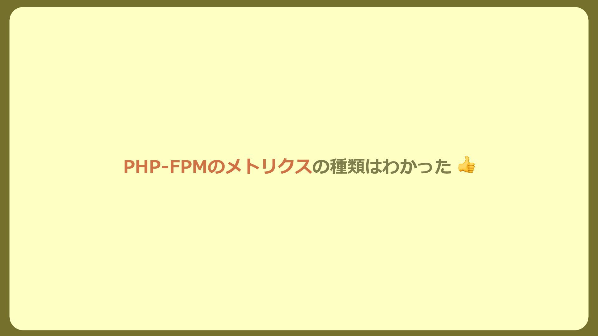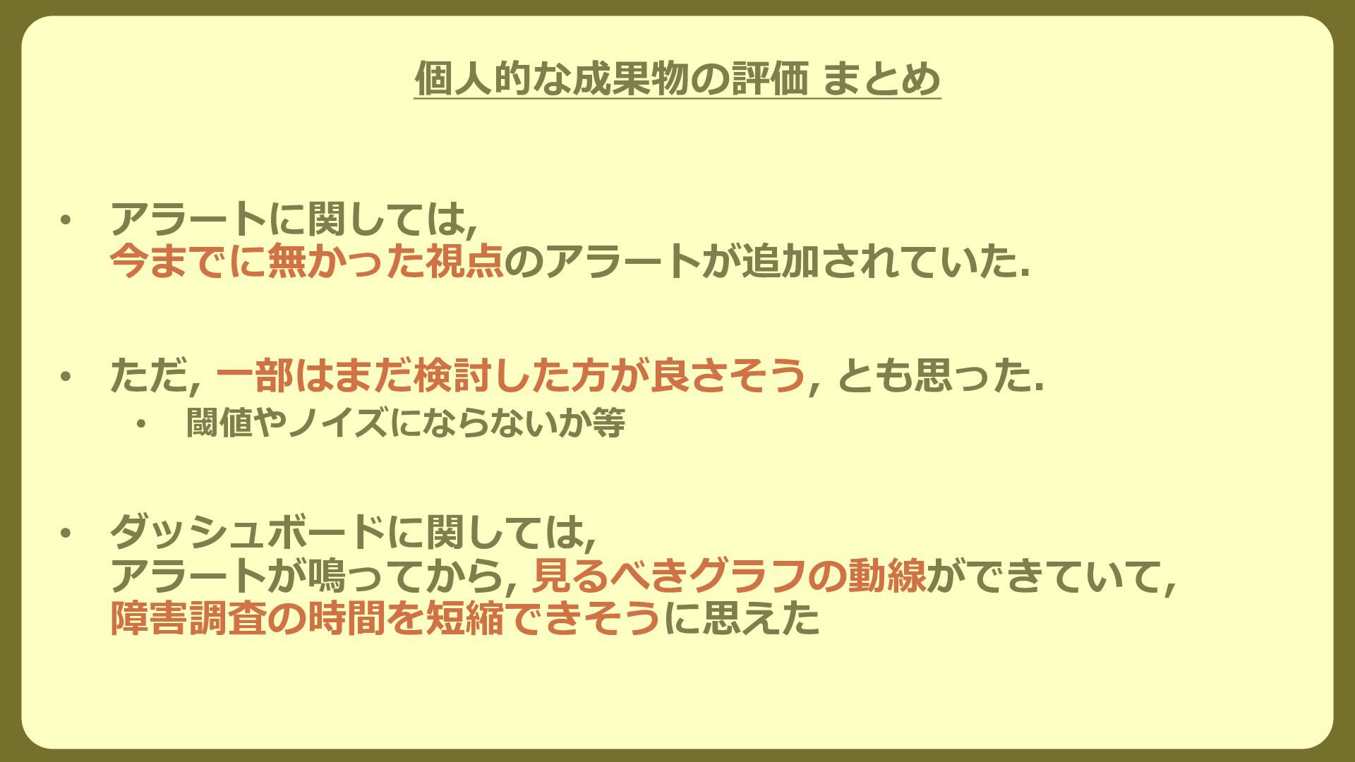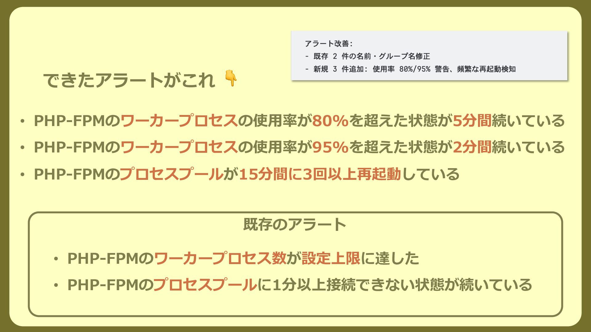 それなりに時間がかかる • アラートやダッシュボードのユースケースを整理して, 本当にそのユースケースを満たしているのか, を軸としながら壁打ちをすると良いのかも. • とはいえ, 「ユースケースを考えて」, 「メトリクスの意味を理解して」, 「適したアラートを作って」, 「⾒やすいダッシュボードを作って」という作業のうち, 後ろ3つの作業はある程度お任せできそうな ので, 楽はできそう. • モデル次第の可能性もある. • PHP-FPMのメトリクスだから良かった可能性もある. • 取得できるメトリクスは公開されているので, 「メトリクスの意味の理解」しやすく, AI Agentも作りやすかった可能性がある. • 独⾃で作成したメトリクスの場合だと, もう少し事前に情報を提供しておく必要があるのかも