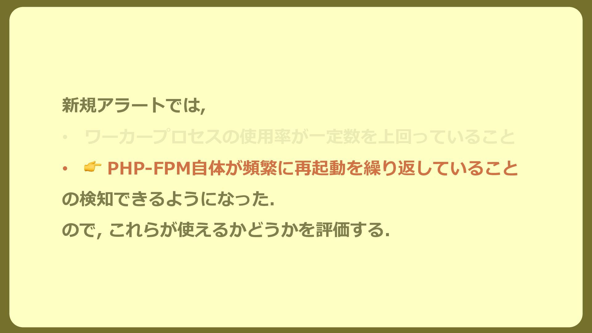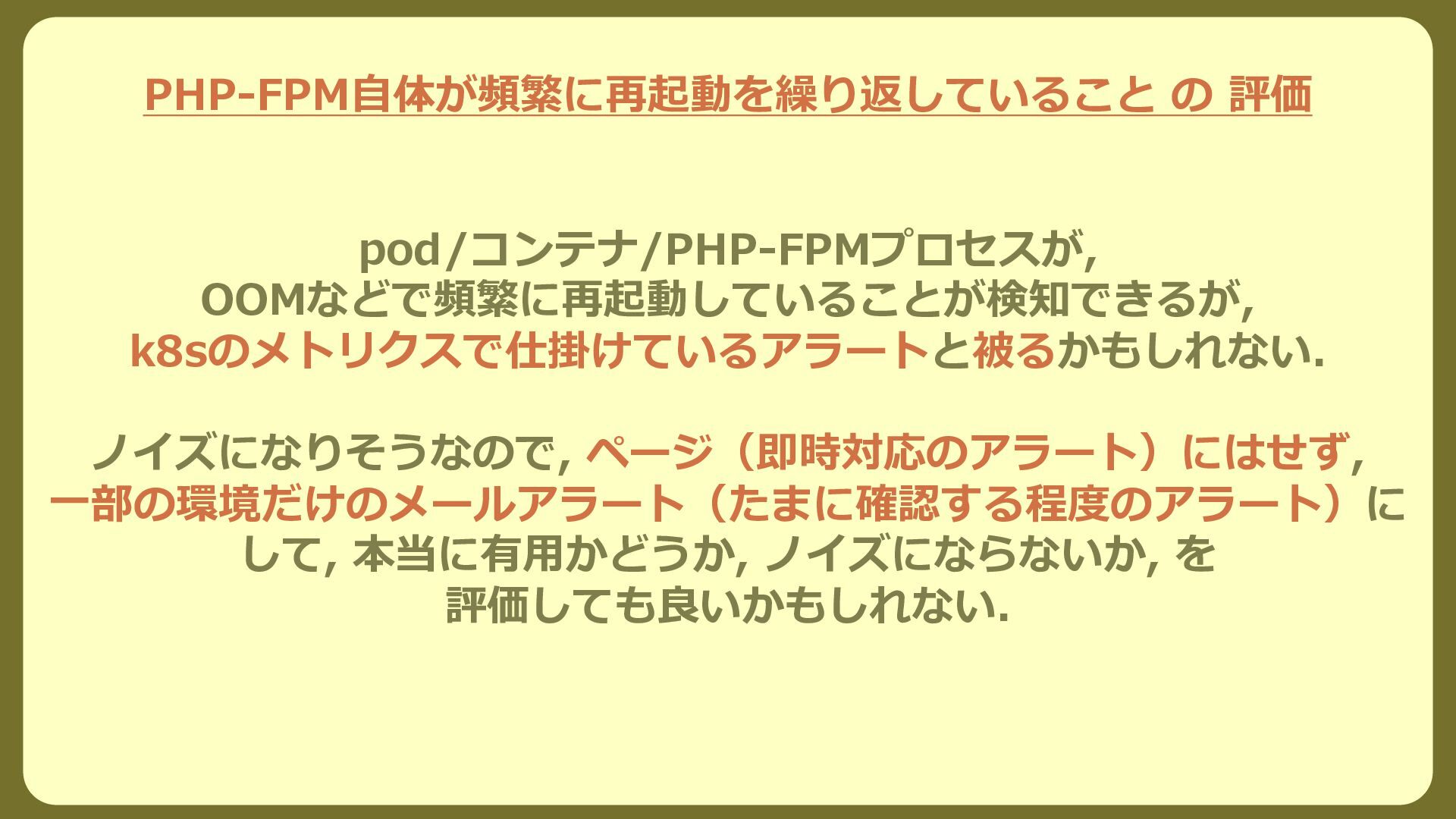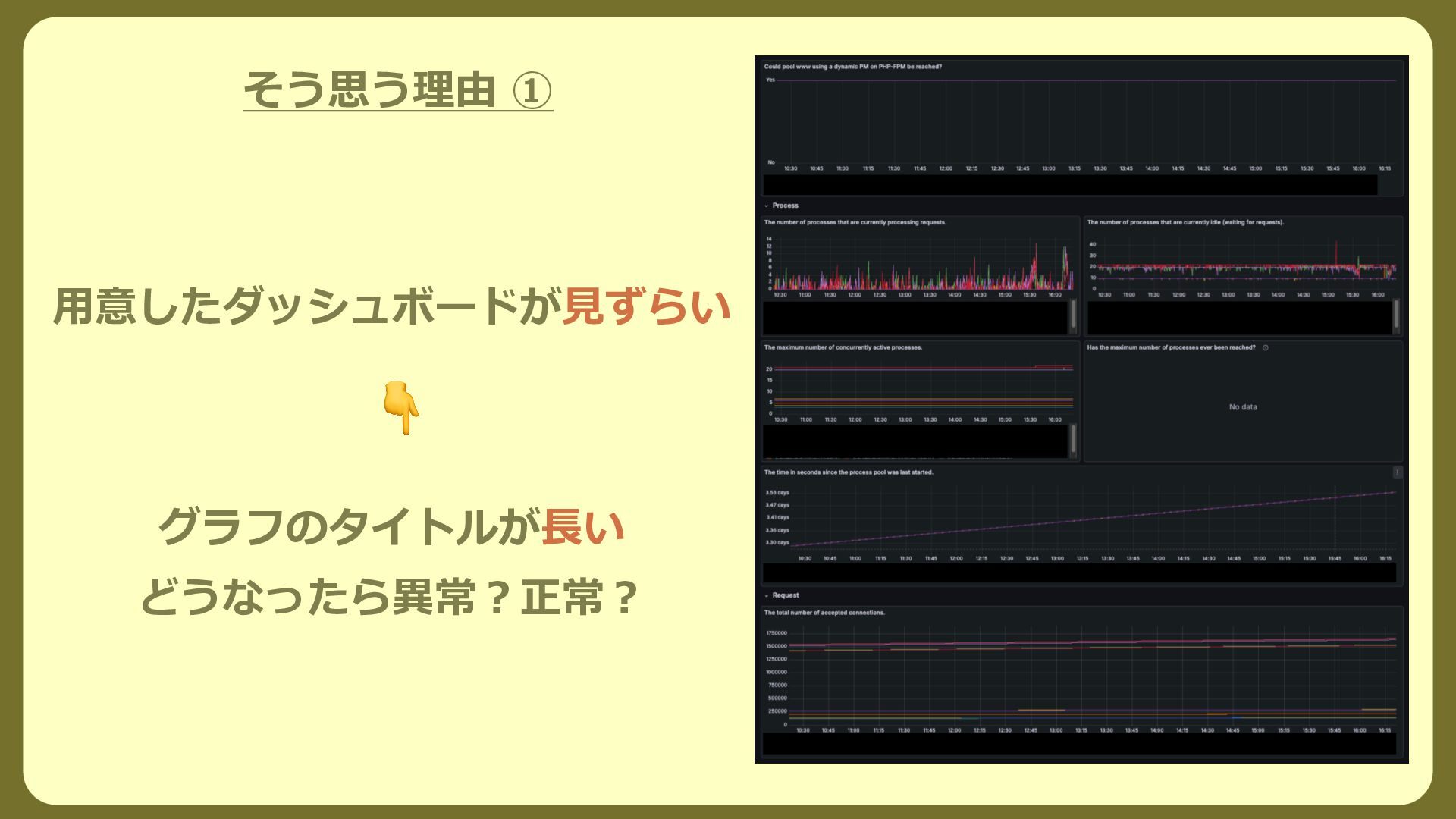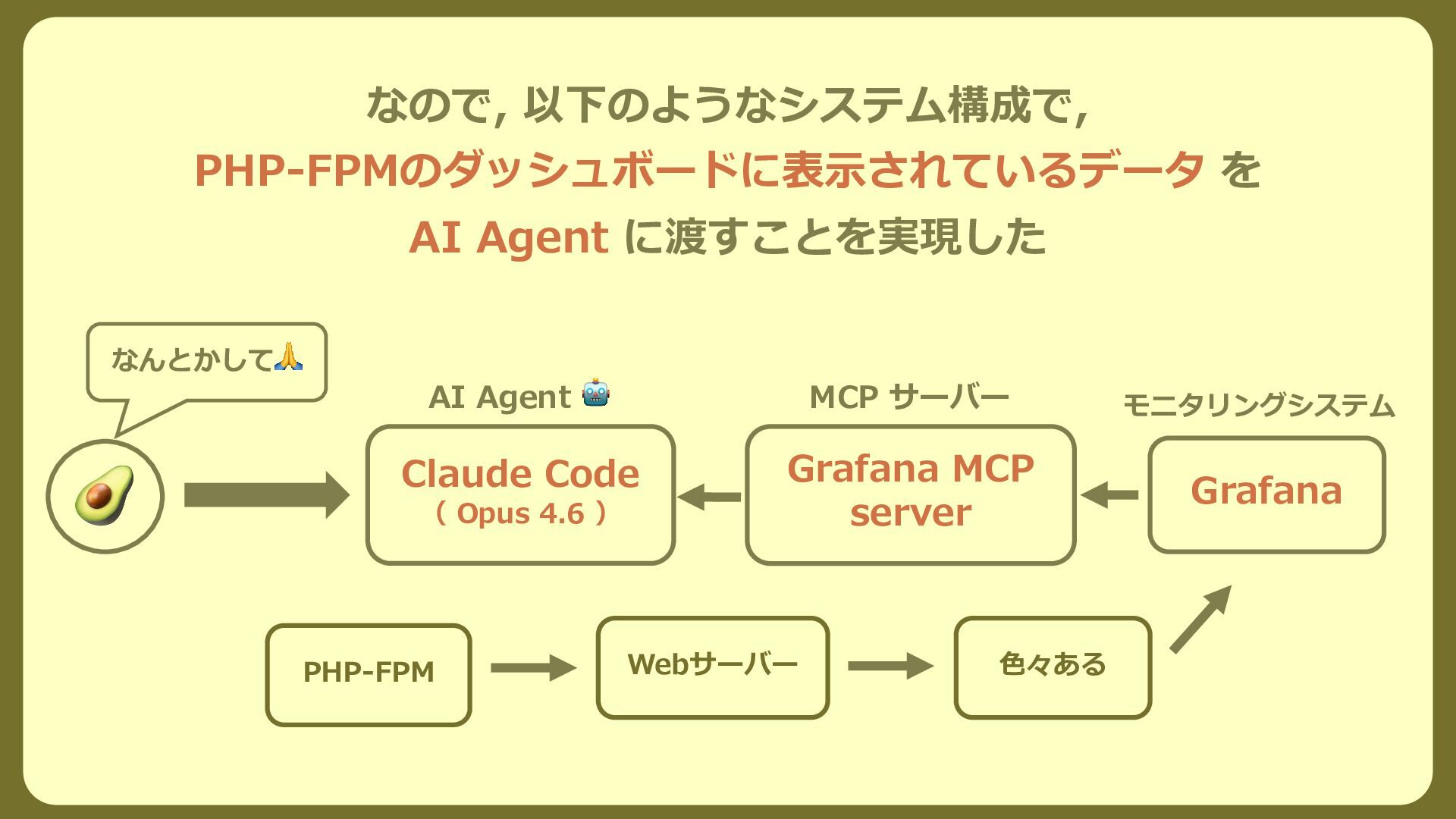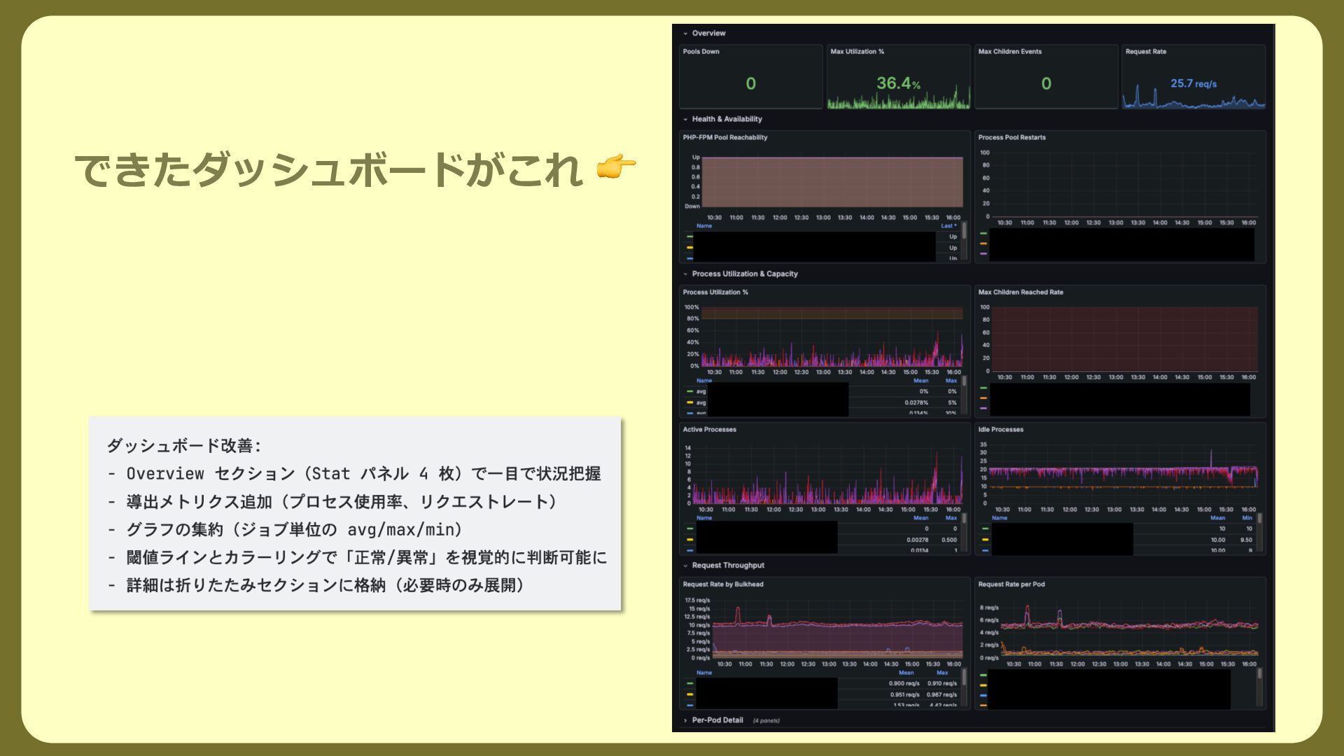 それなりに時間がかかる • アラートやダッシュボードのユースケースを整理して, 本当にそのユースケースを満たしているのか, を軸としながら壁打ちをすると良いのかも. • とはいえ, 「ユースケースを考えて」, 「メトリクスの意味を理解して」, 「適したアラートを作って」, 「⾒やすいダッシュボードを作って」という作業のうち, 後ろ3つの作業はある程度お任せできそうな ので, 楽はできそう. • モデル次第の可能性もある. • PHP-FPMのメトリクスだから良かった可能性もある. • 取得できるメトリクスは公開されているので, 「メトリクスの意味の理解」しやすく, AI Agentも作りやすかった可能性がある. • 独⾃で作成したメトリクスの場合だと, もう少し事前に情報を提供しておく必要があるのかも