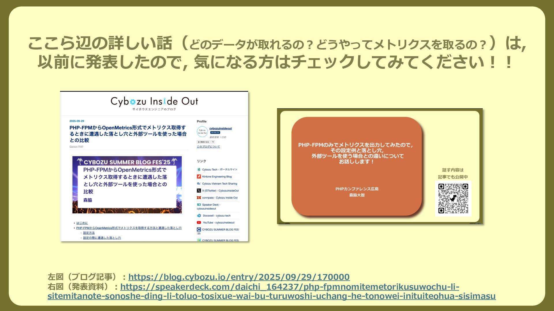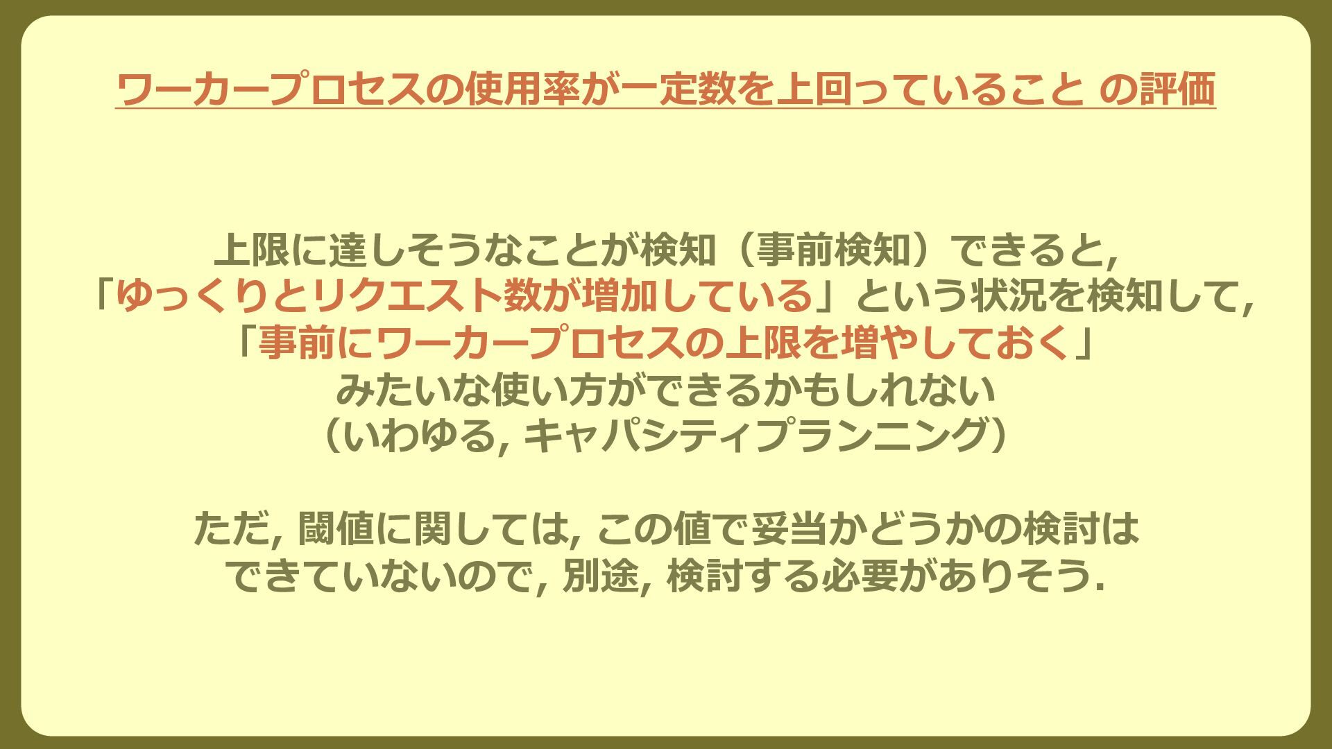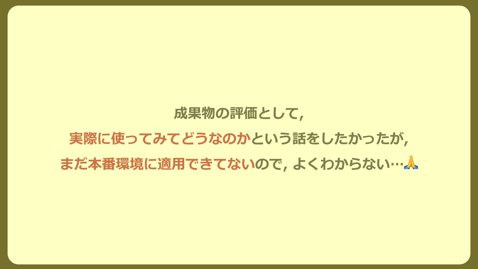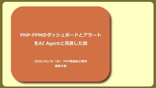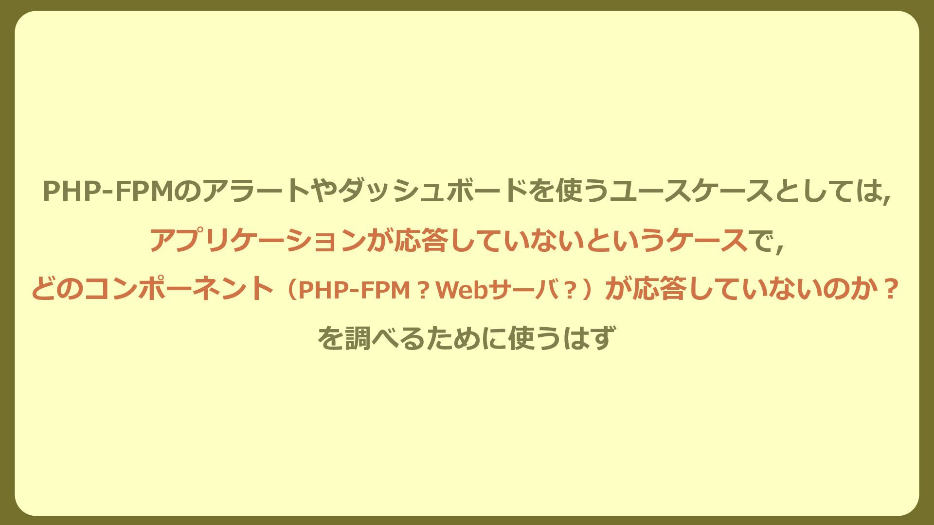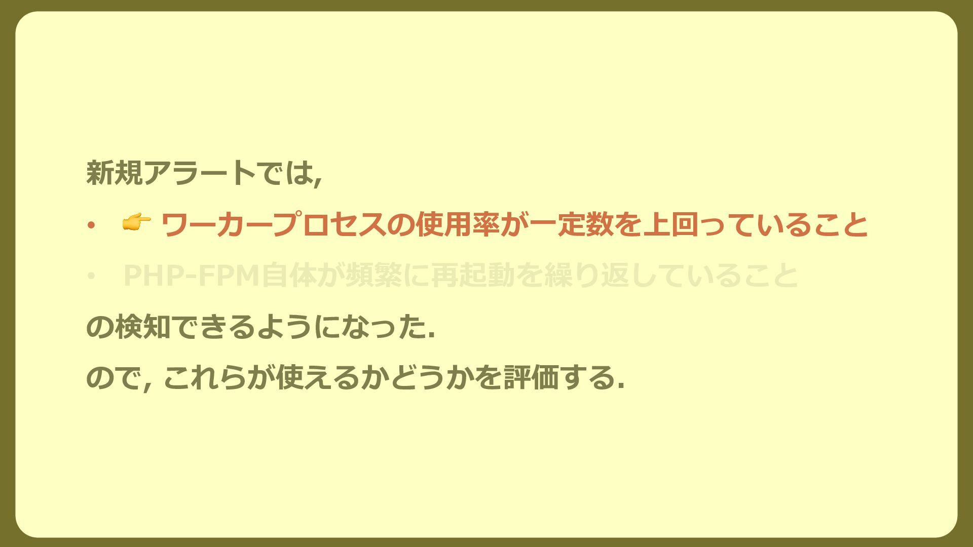それなりに時間がかかる • アラートやダッシュボードのユースケースを整理して, 本当にそのユースケースを満たしているのか, を軸としながら壁打ちをすると良いのかも. • とはいえ, 「ユースケースを考えて」, 「メトリクスの意味を理解して」, 「適したアラートを作って」, 「⾒やすいダッシュボードを作って」という作業のうち, 後ろ3つの作業はある程度お任せできそうな ので, 楽はできそう. • モデル次第の可能性もある. • PHP-FPMのメトリクスだから良かった可能性もある. • 取得できるメトリクスは公開されているので, 「メトリクスの意味の理解」しやすく, AI Agentも作りやすかった可能性がある. • 独⾃で作成したメトリクスの場合だと, もう少し事前に情報を提供しておく必要があるのかも